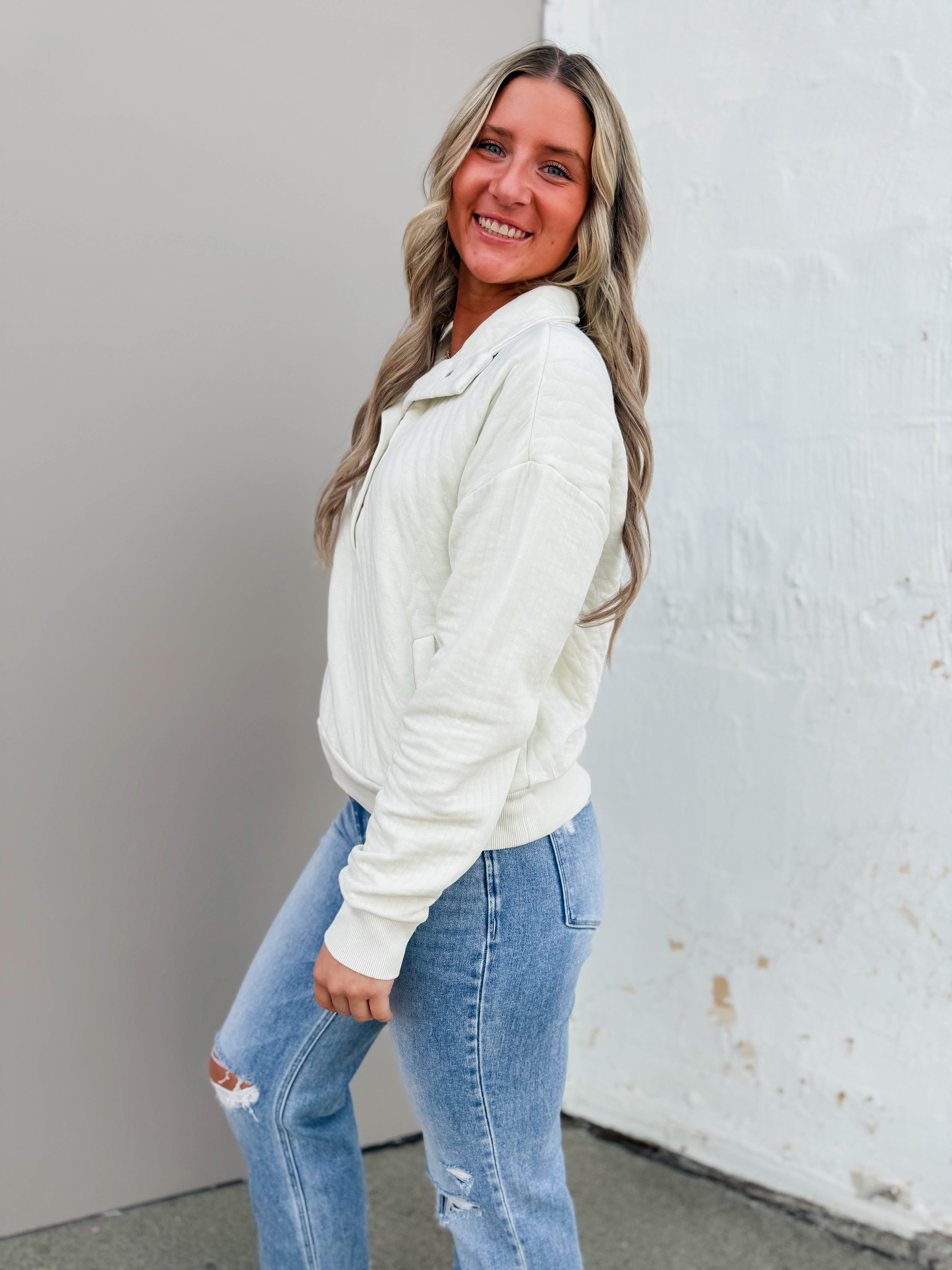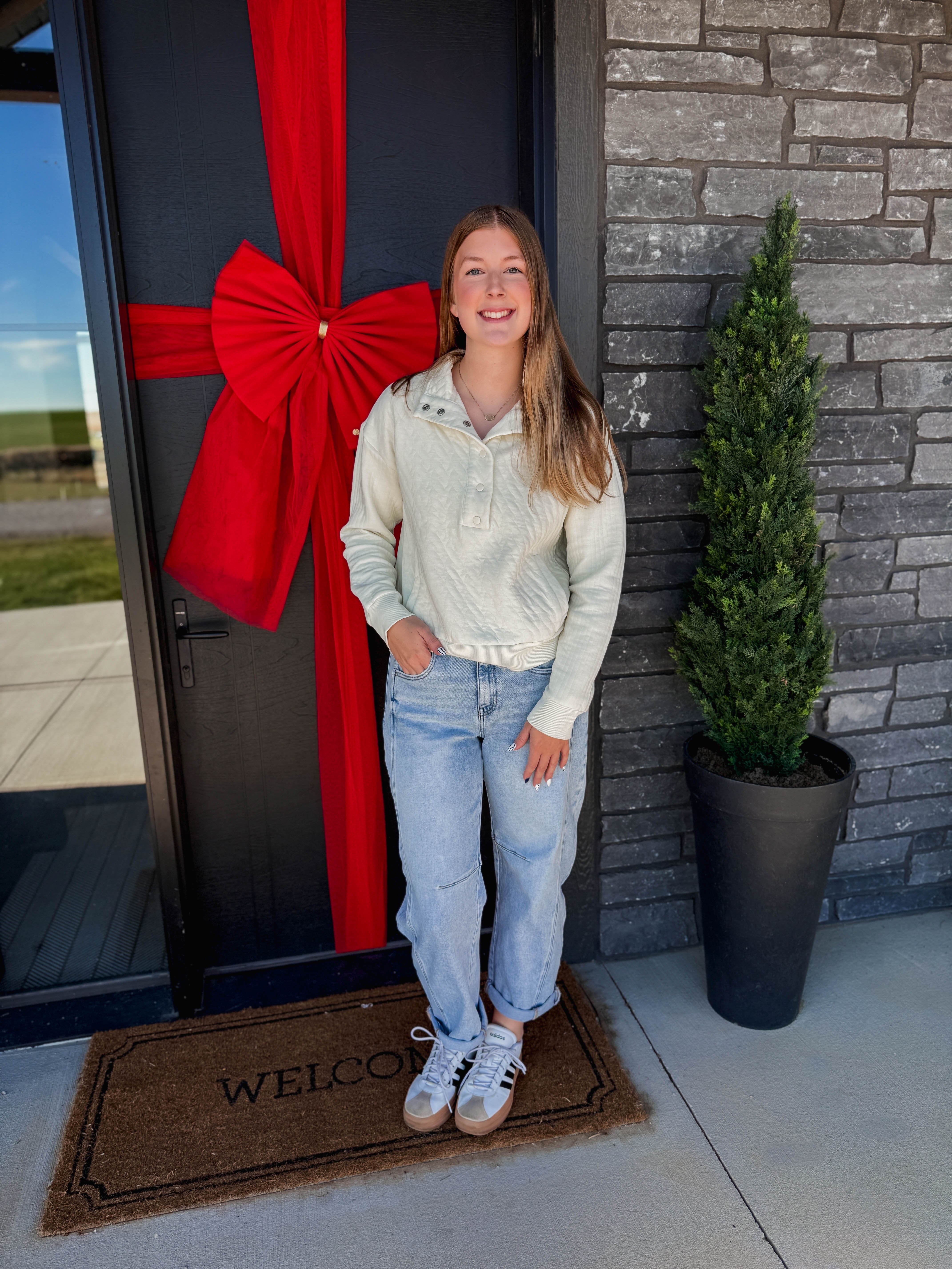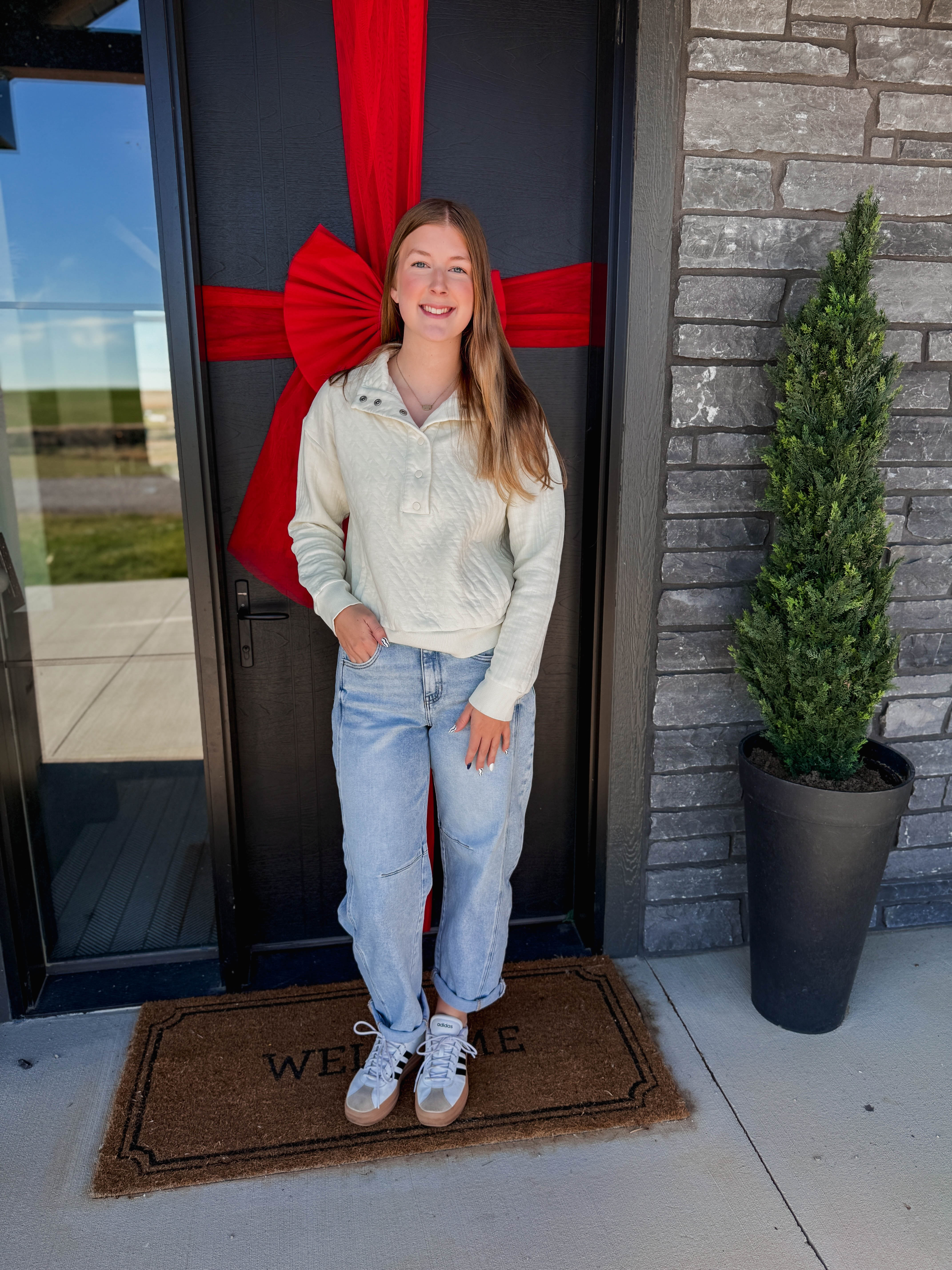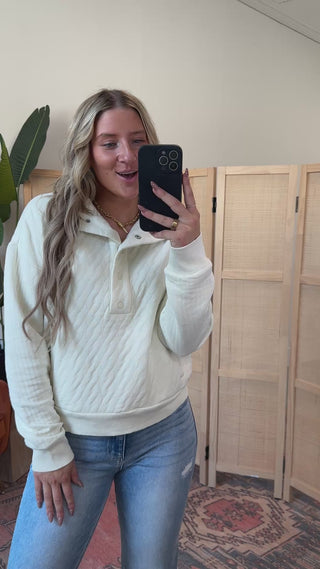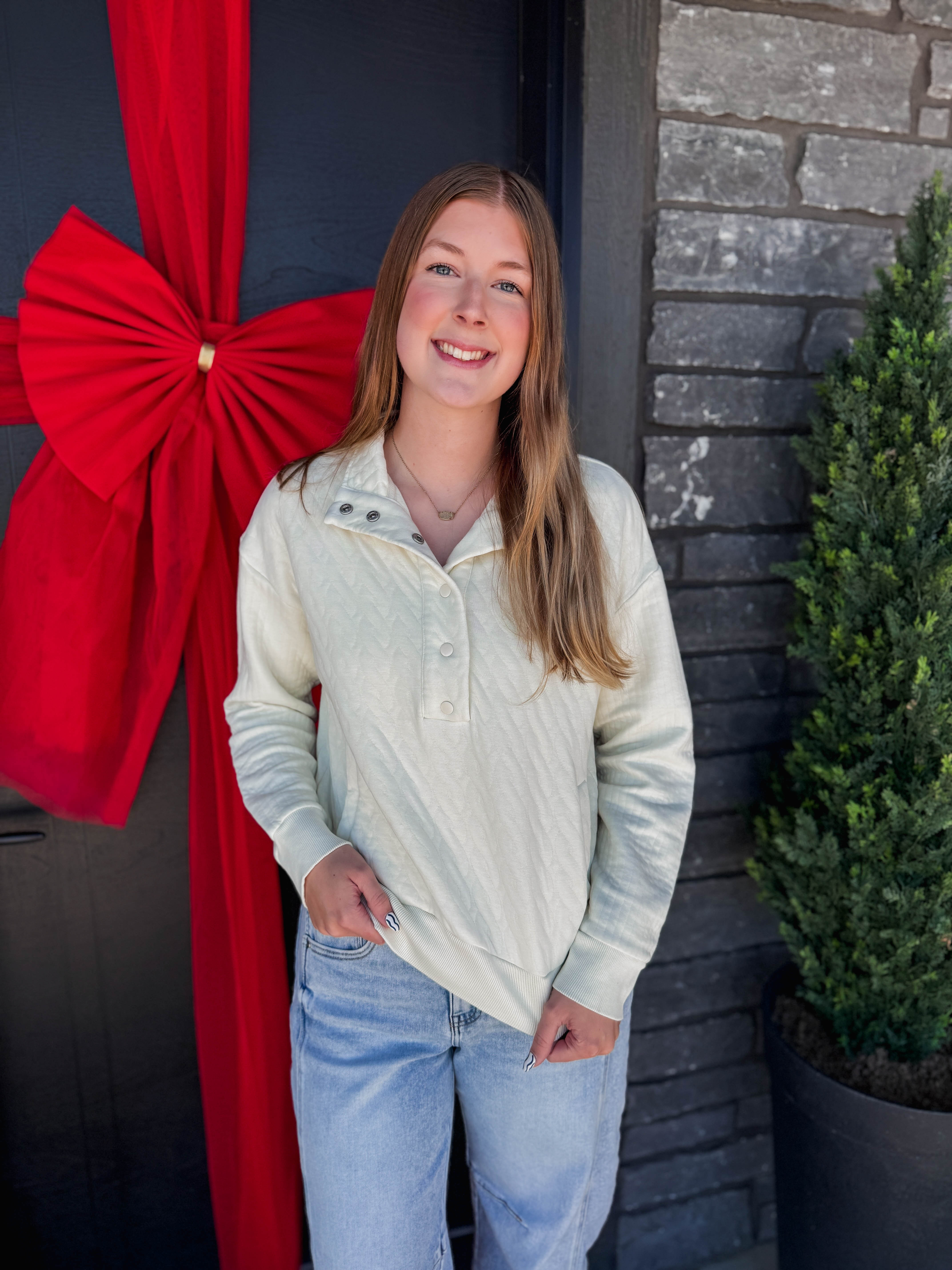 Cozy up in the Kyra Pullover, featuring a collared neckline and half snap buttons for easy style. Its textured fabric and kangaroo pocket keep it cute and comfy, perfect for crisp fall and chilly winter days.