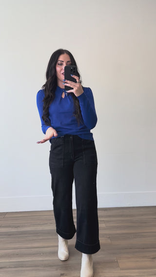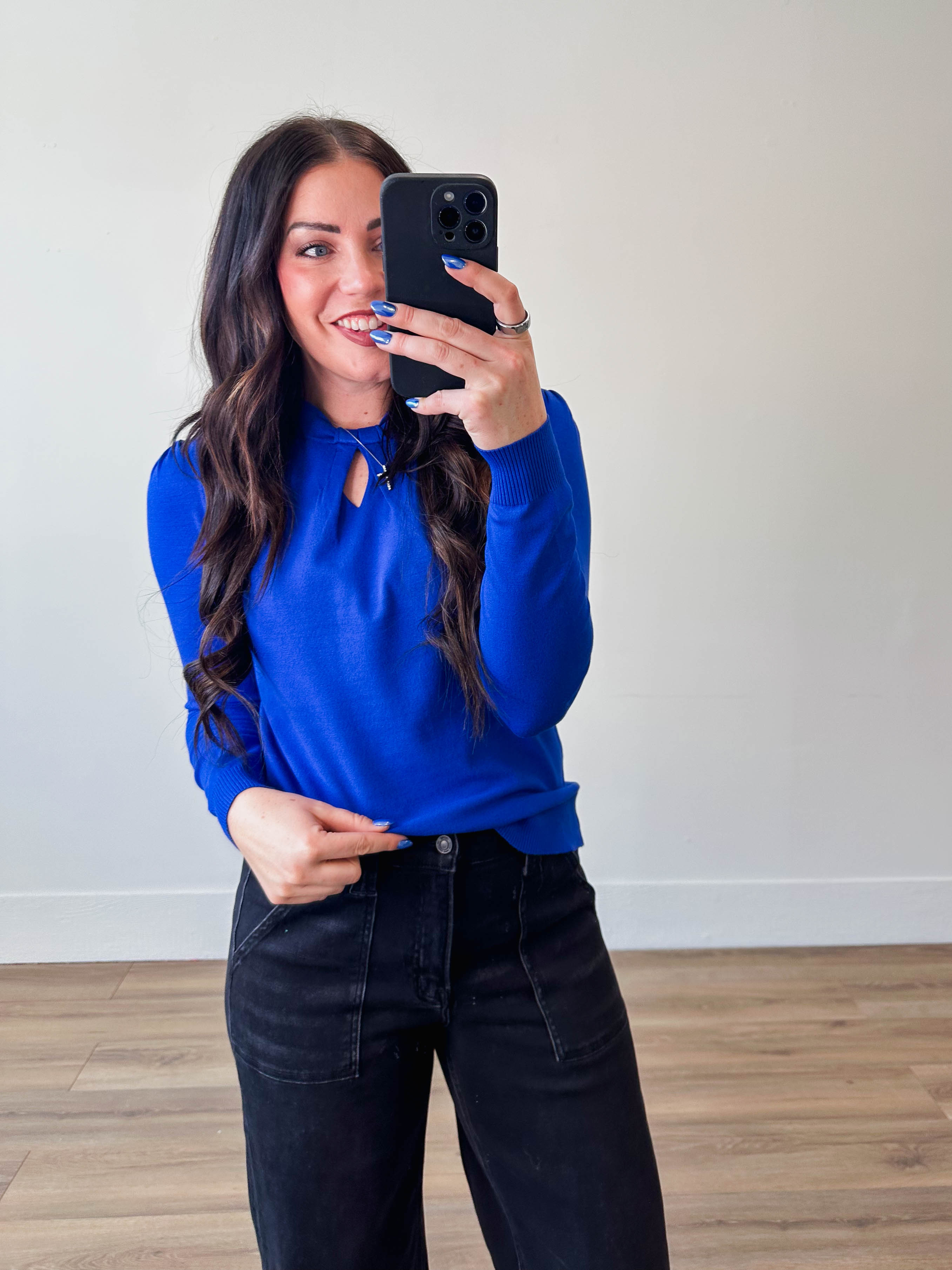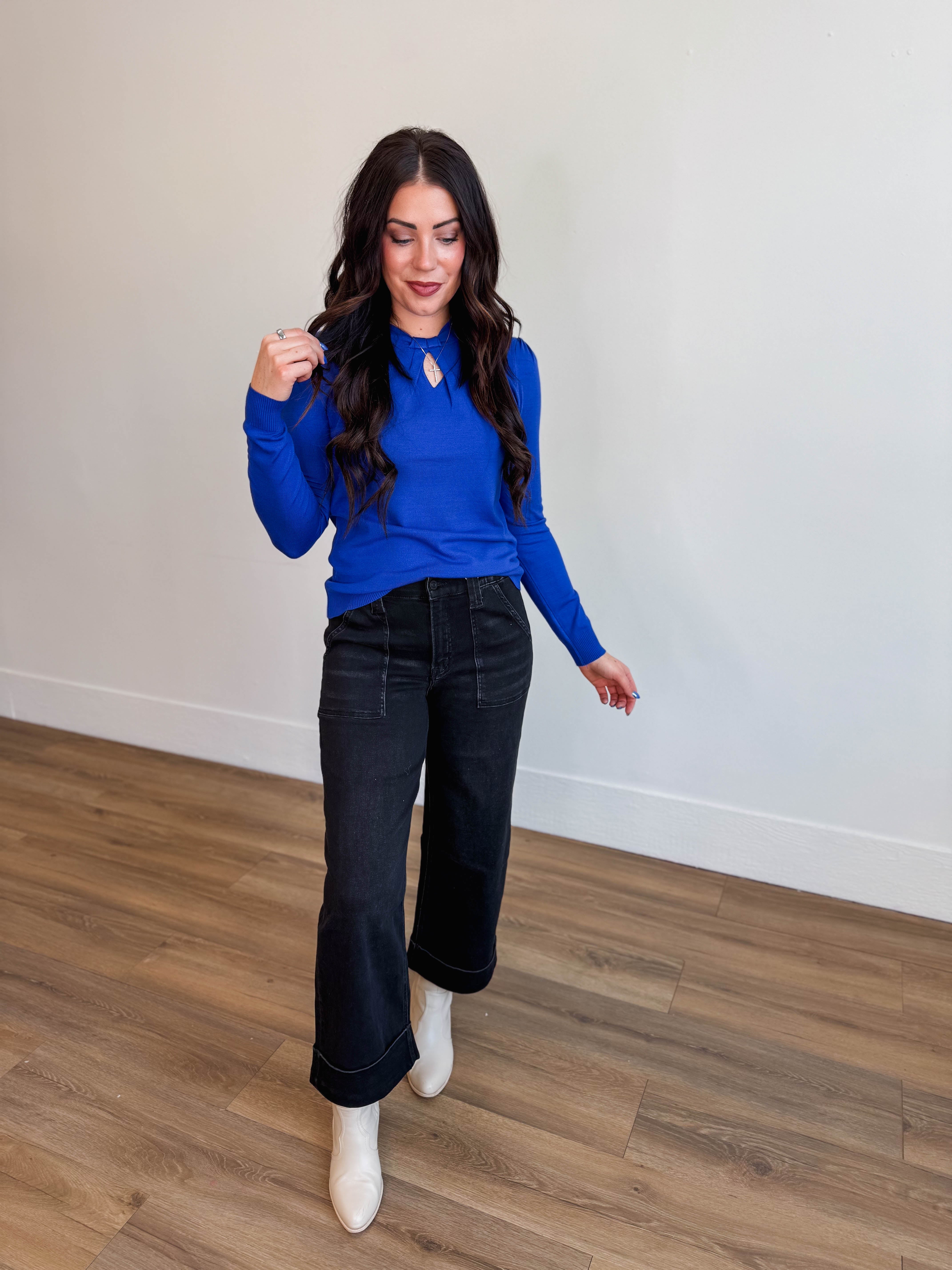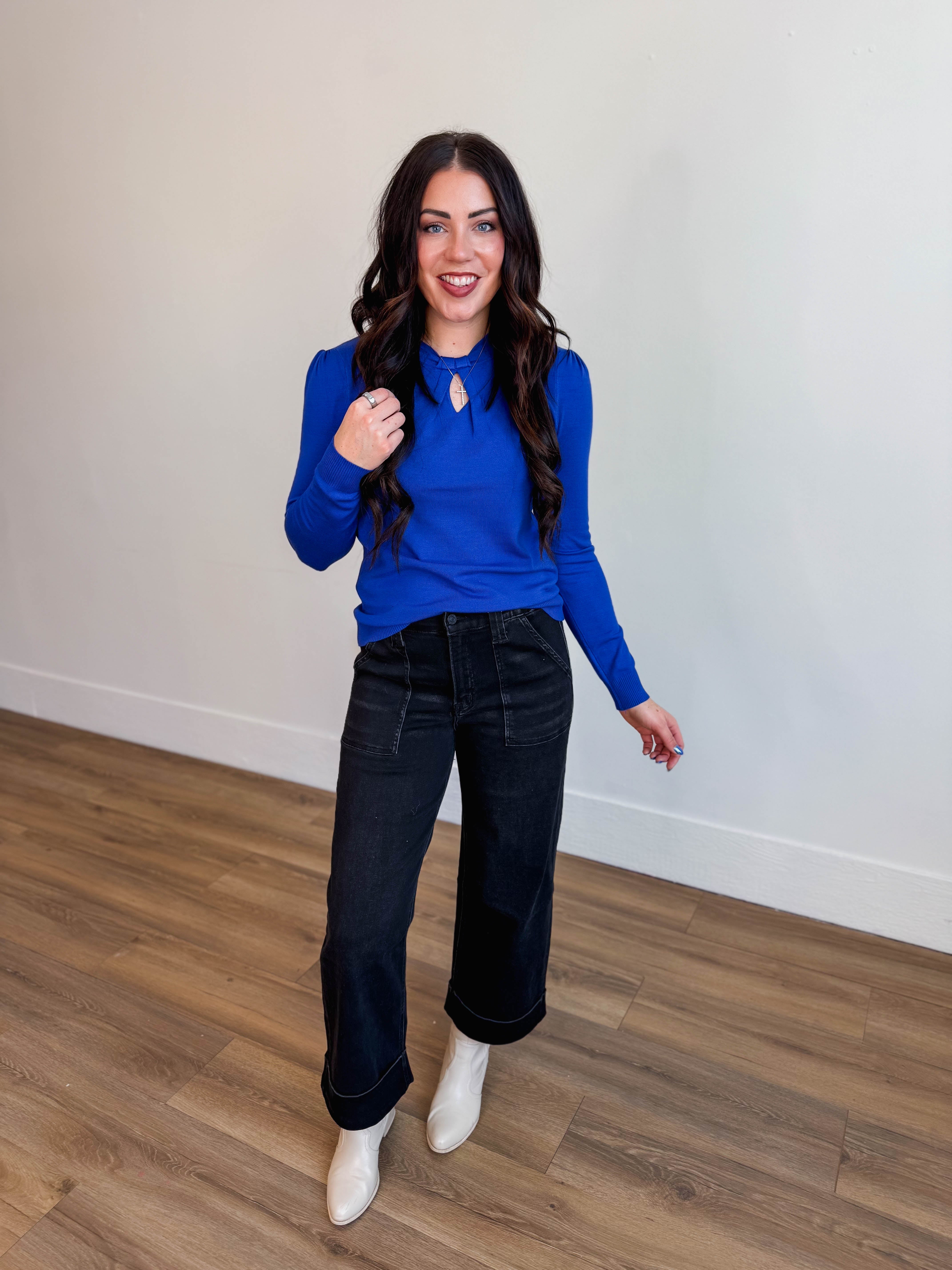 Stay cozy and chic with our Kyra Sweater. This knit top features a round neckline and front twist details for a fun pop of color and subtle unique detail. The long sleeves and soft knit material make it comfortable for any occasion.