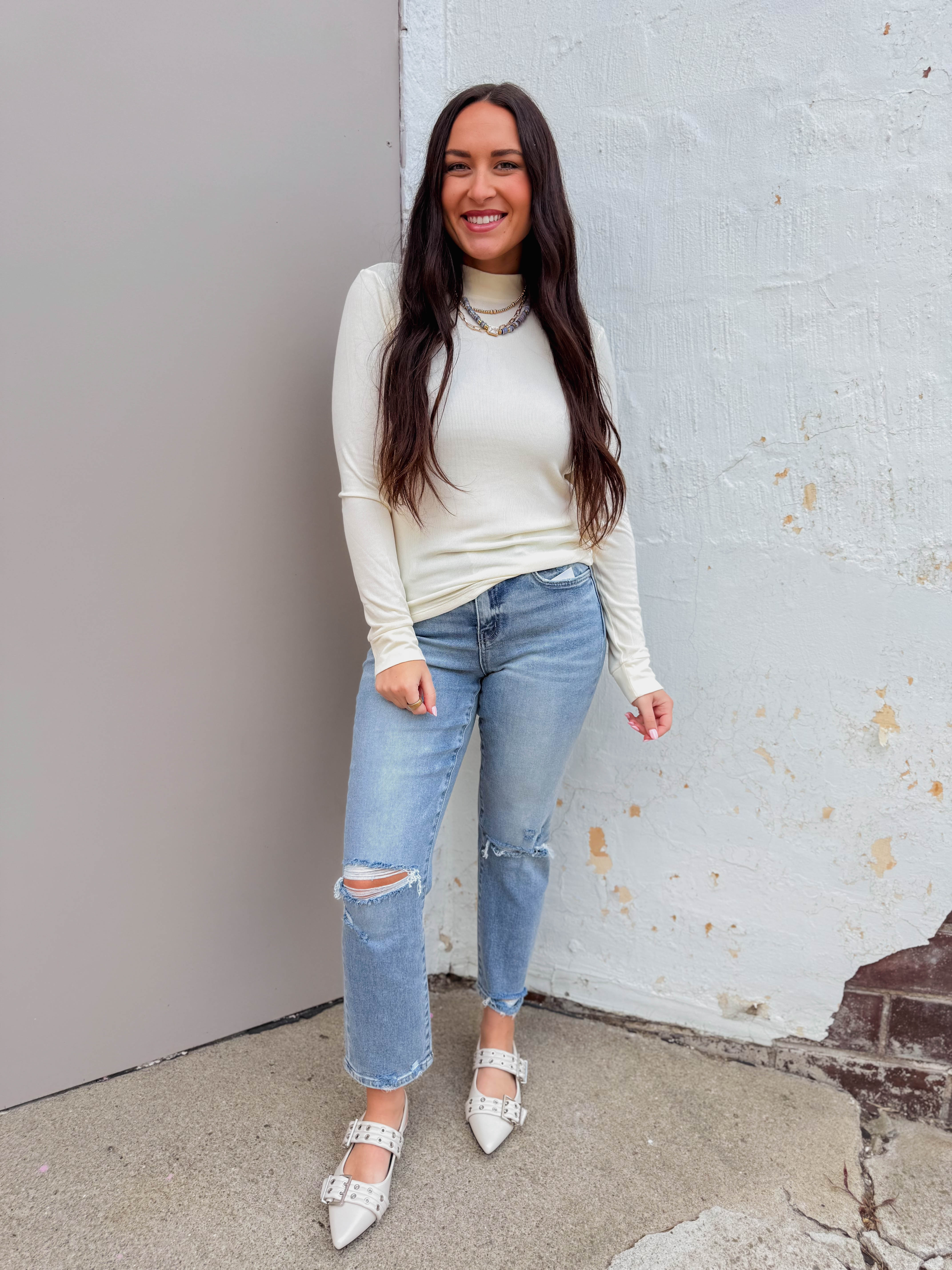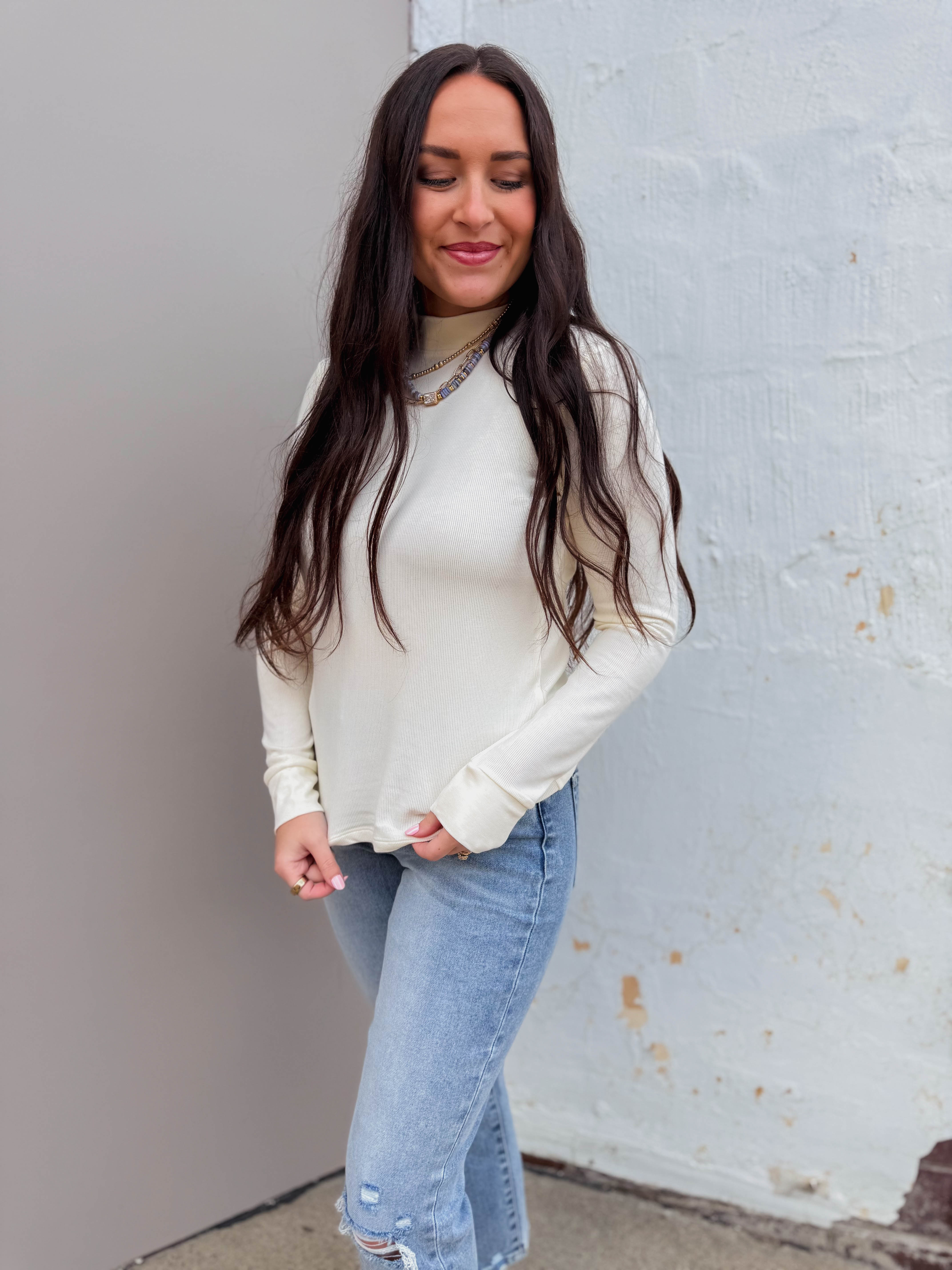 The Liz Top in Cream is your new go-to piece! With a solid, buttery-soft ribbed knit, mock neckline, and long cuffed sleeves, it’s cozy enough for work but cool enough for weekend plans. Super versatile and effortlessly stylish! Layer it up or wear it solo! No matter how you style it, Liz has you covered!