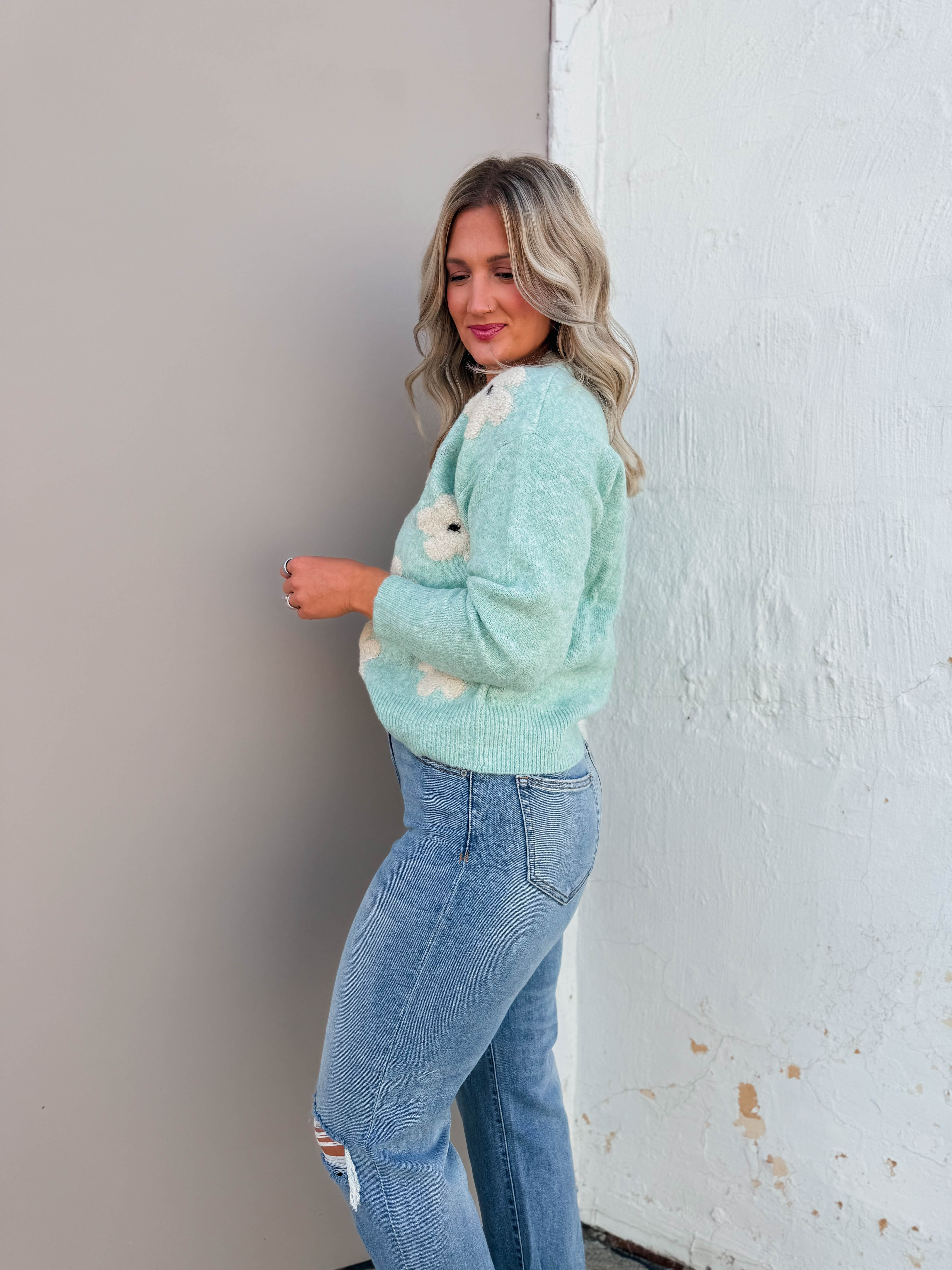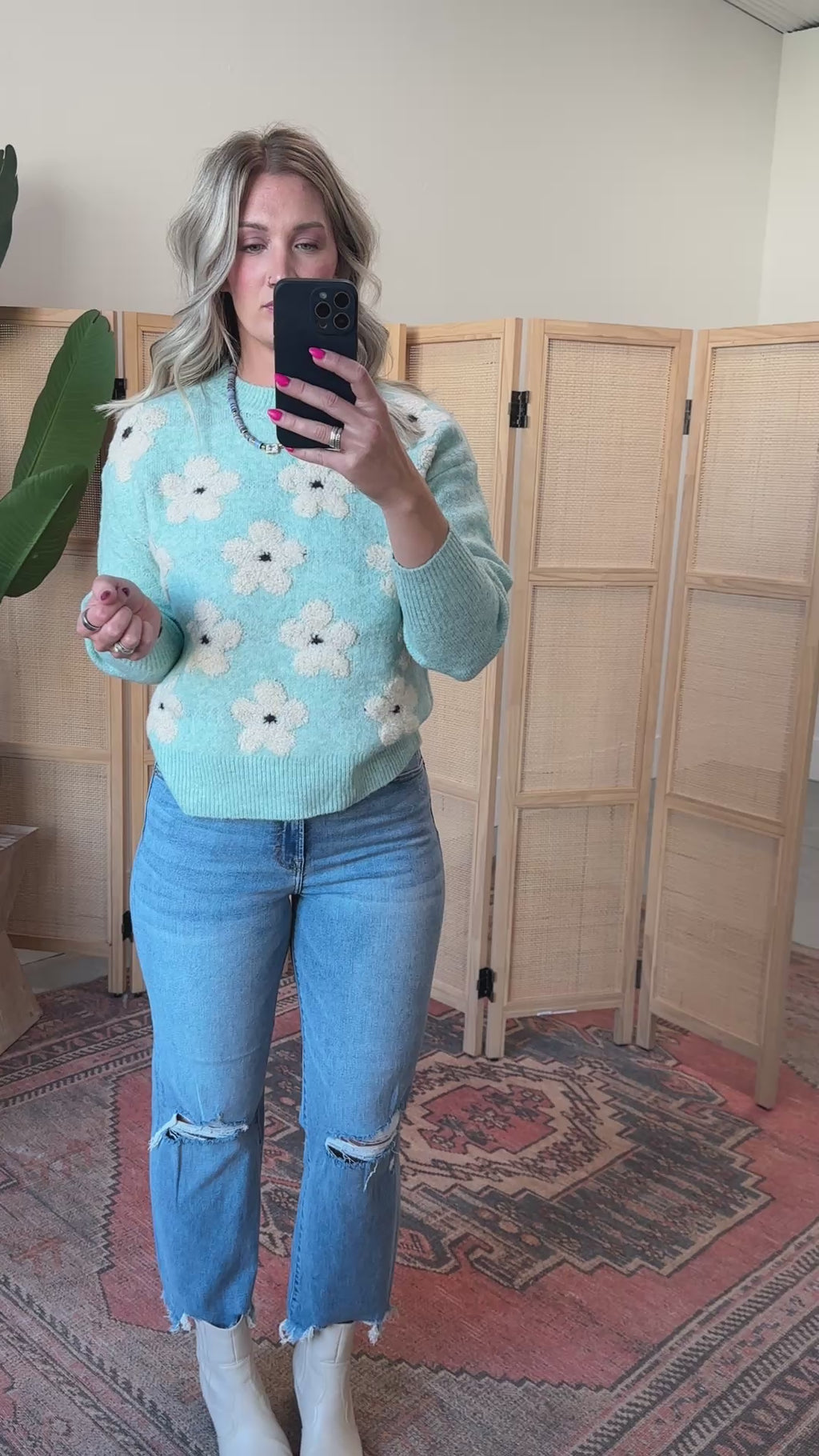 Add a fun pop of color and texture to your look with the Melody Floral Sweater. This crew neck pullover features long sleeves and a charming flower jacquard pattern that brightens any outfit. Perfect for cozy days with a playful twist.