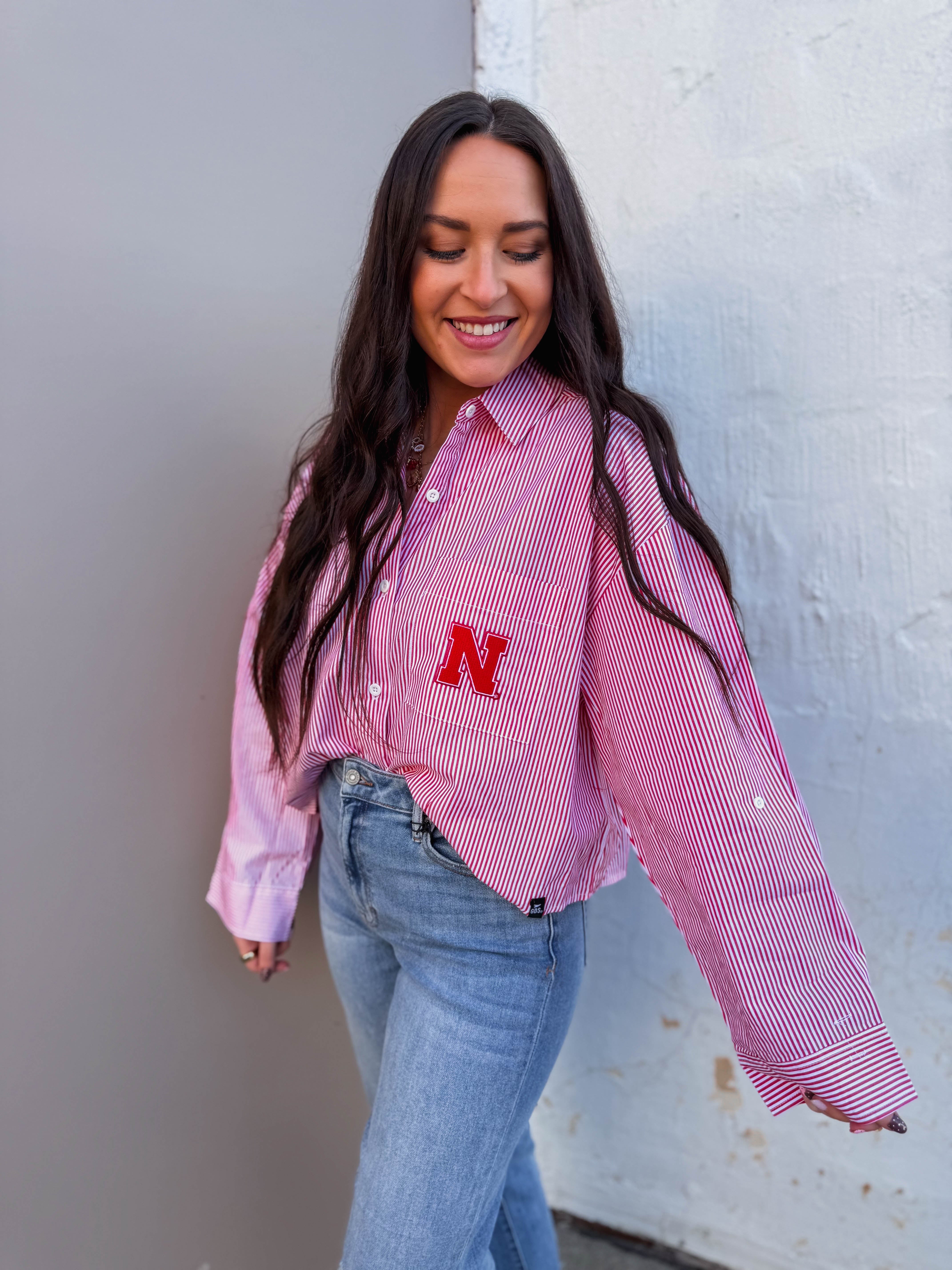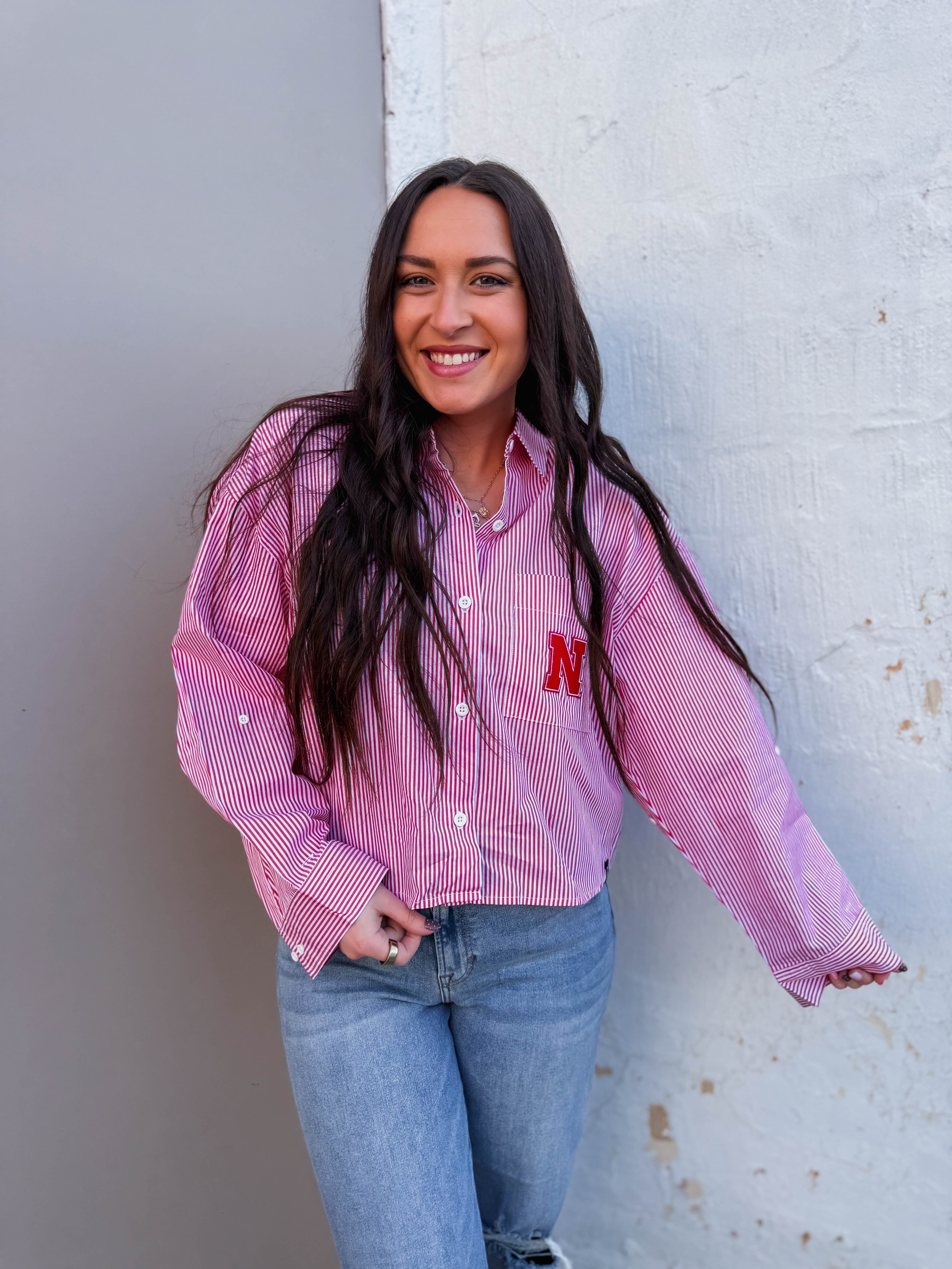 Get ready for game day with the Nebraska Logo Patch Button Down! This playful top features a collared neckline, long sleeves, and a chest pocket for added convenience. The Nebraska patch adds team spirit, while the slightly cropped length keeps you on-trend. A fun and stylish choice for any gameday celebration.