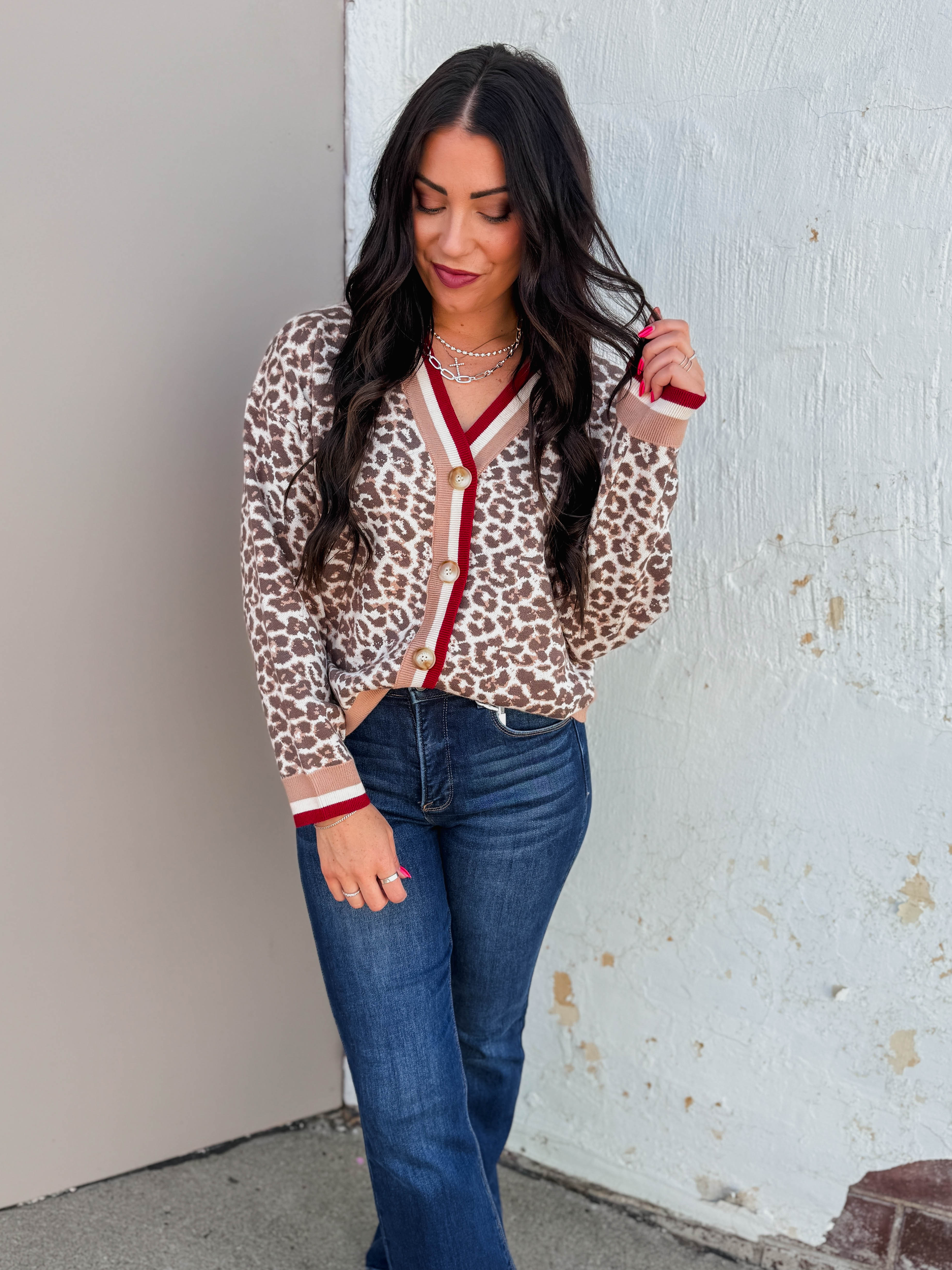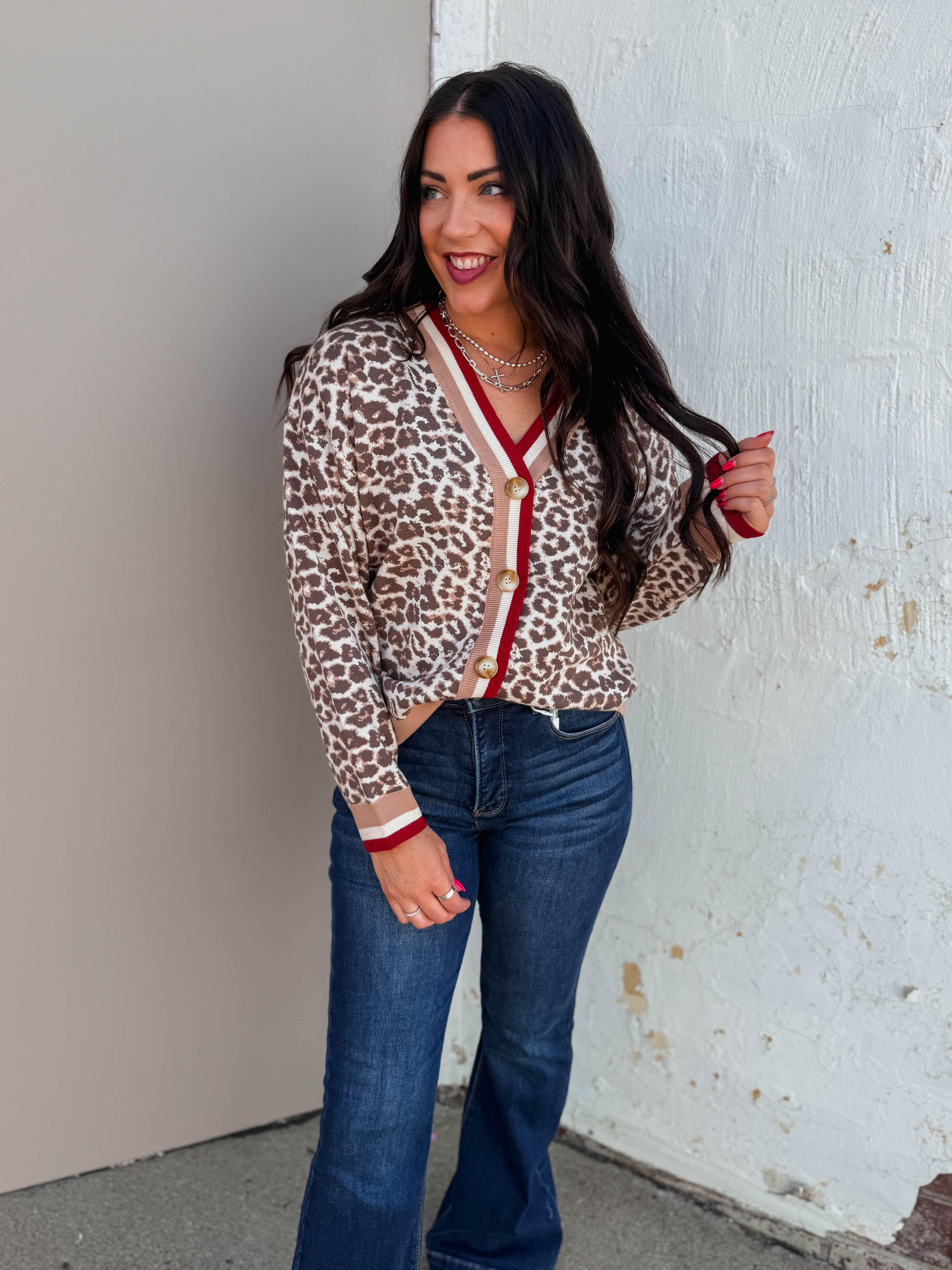 Cozy up in the Christin Leopard Cardigan—your perfect go-to from work to weekend. Featuring a playful animal pattern, long sleeves, and a flattering V-neck with button-front closure, this cardigan adds a fun, multicolor rib detail for fall-ready style.