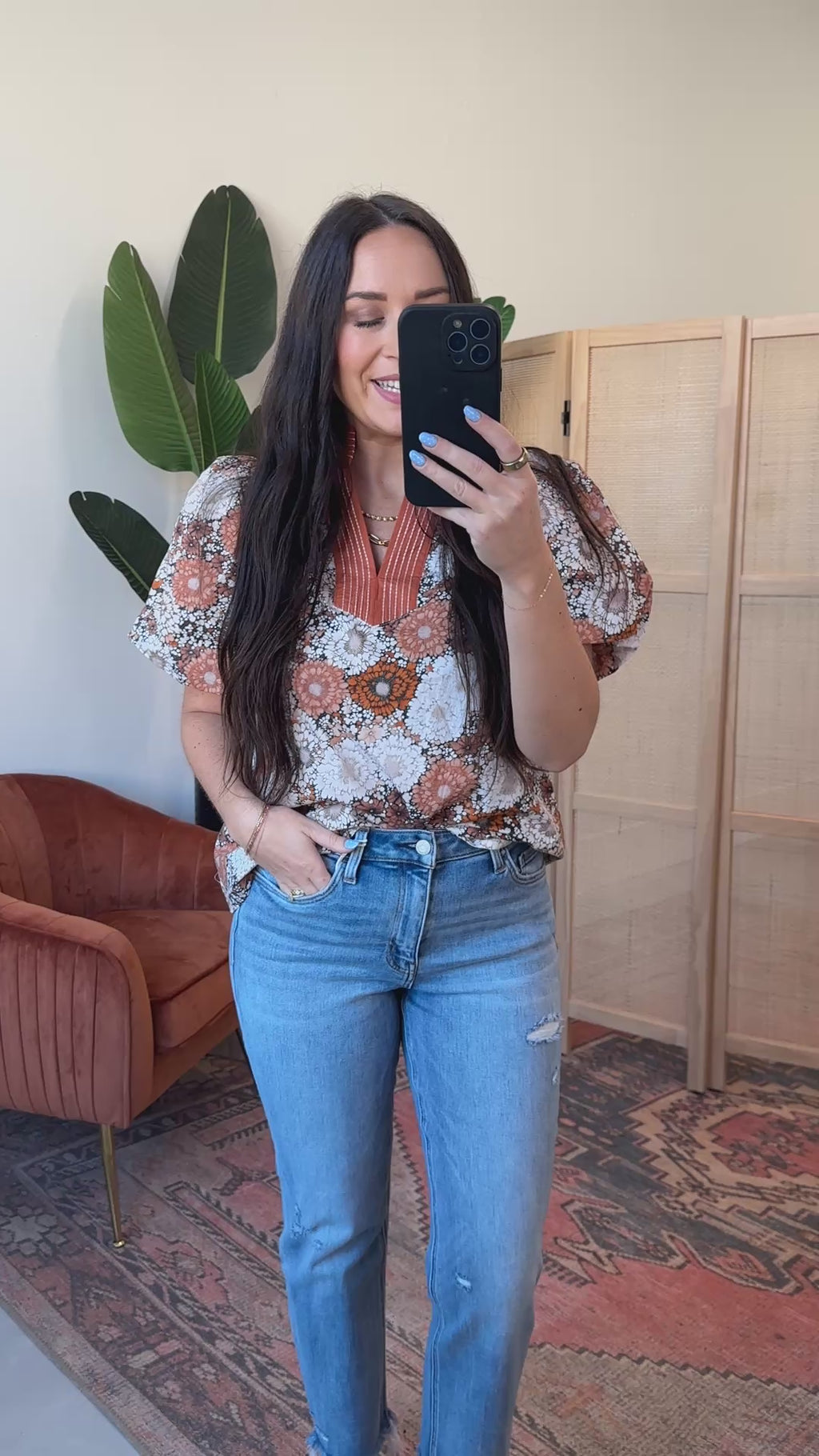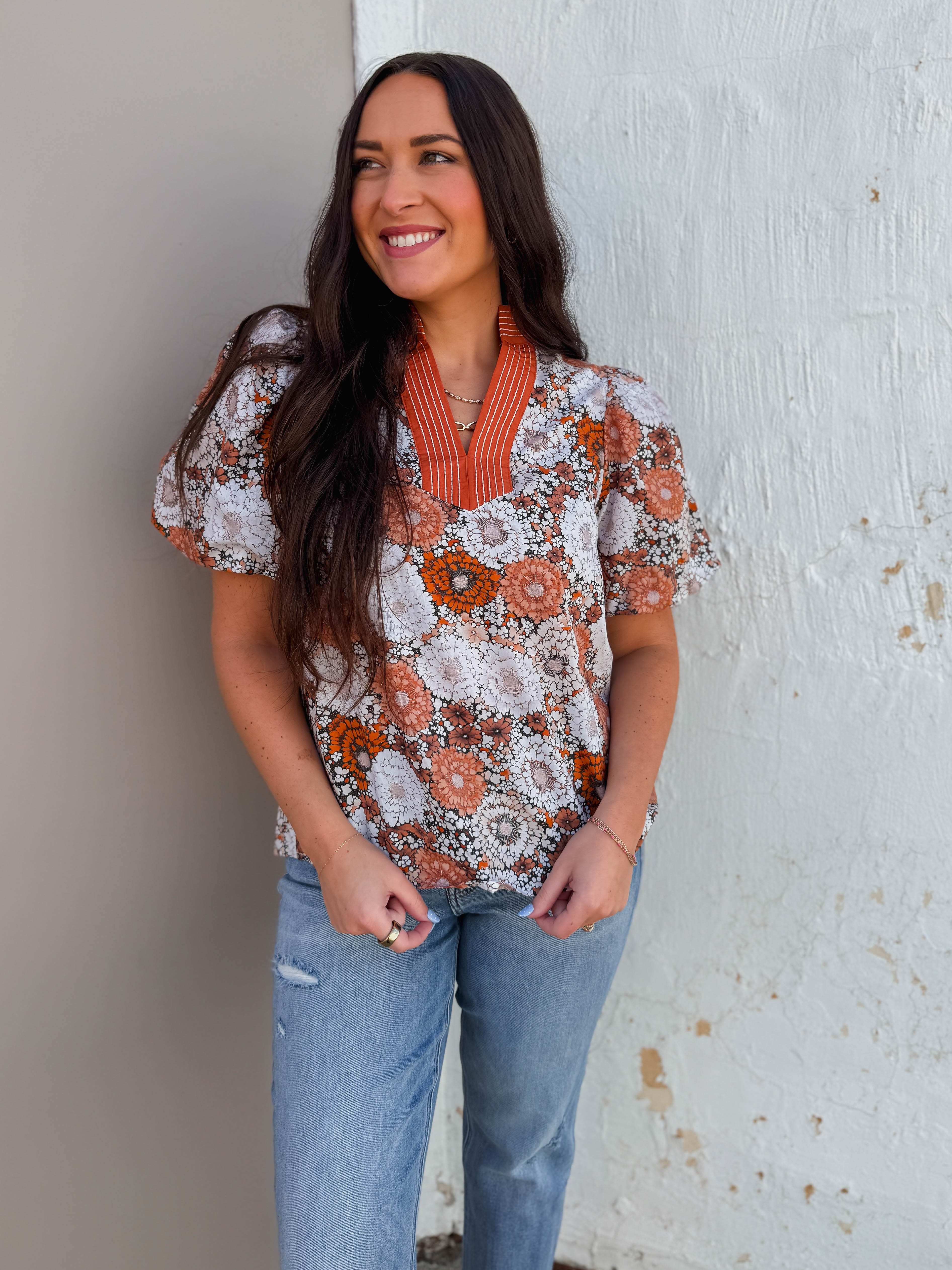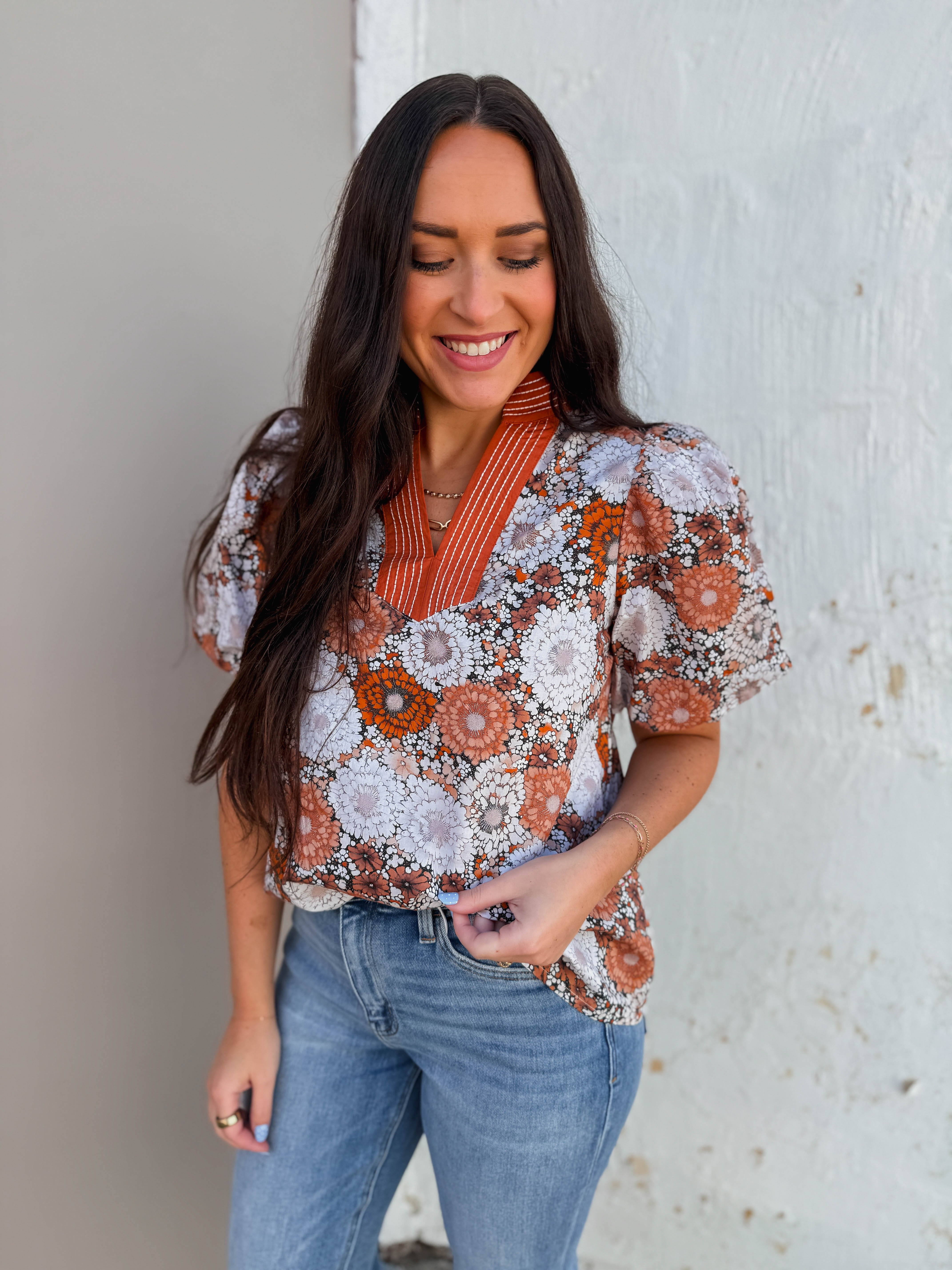 Brighten your wardrobe with the Michelle Floral Top, featuring charming short bubble sleeves and playful contrast stitch detailing. The caftan-inspired neck adds a breezy touch, making it perfect from workdays to weekend fun.