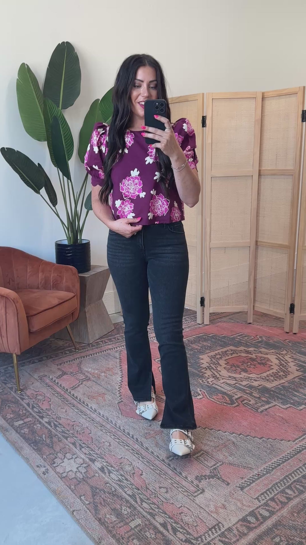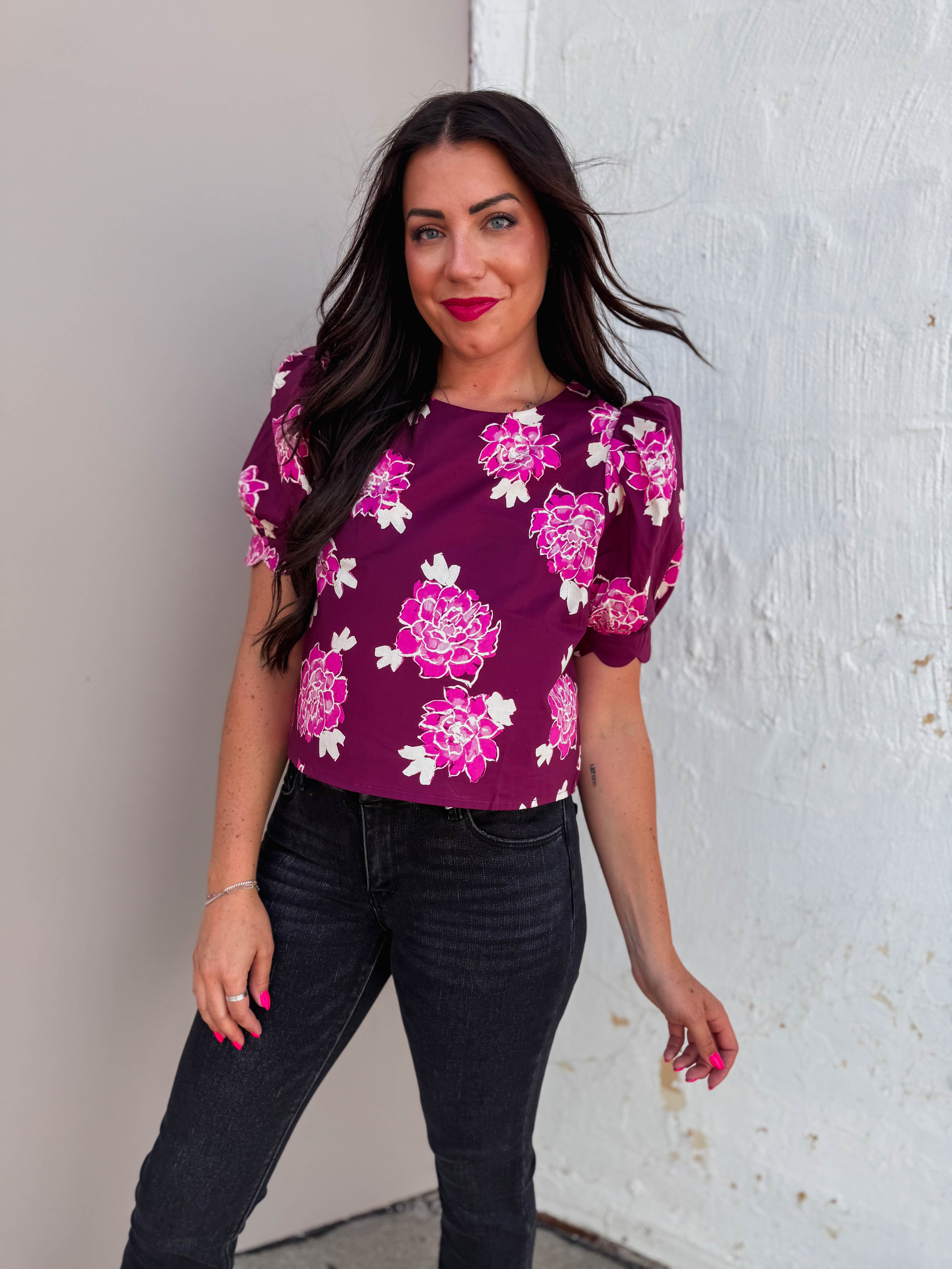 Add a fun pop of color to your wardrobe with the Viola Floral Top. Featuring a round neck, band puff shoulder sleeves, and delicate scallop finish details, it transitions effortlessly from work to weekend. The button closure at the back adds a charming touch to this playful floral print blouse.