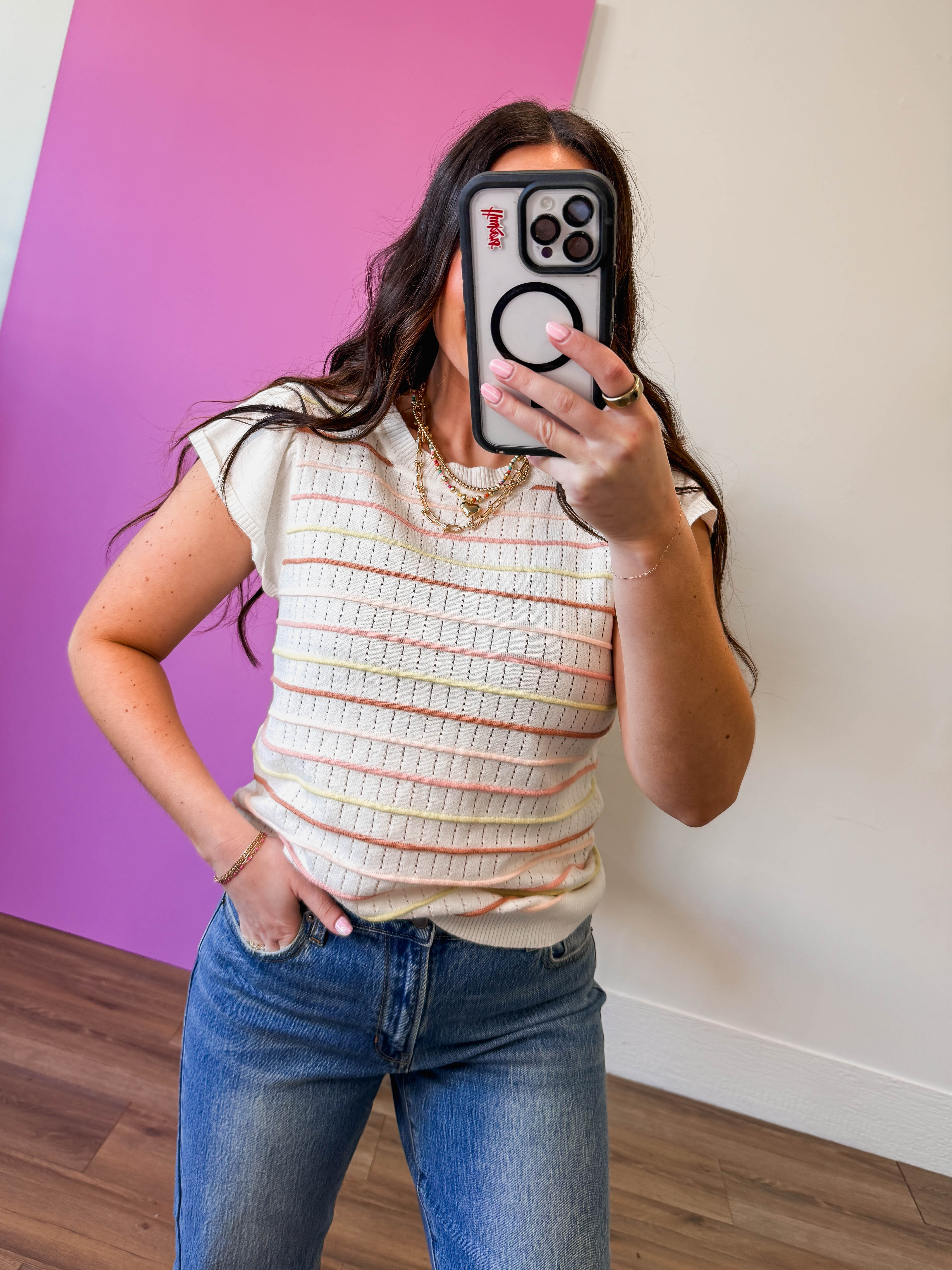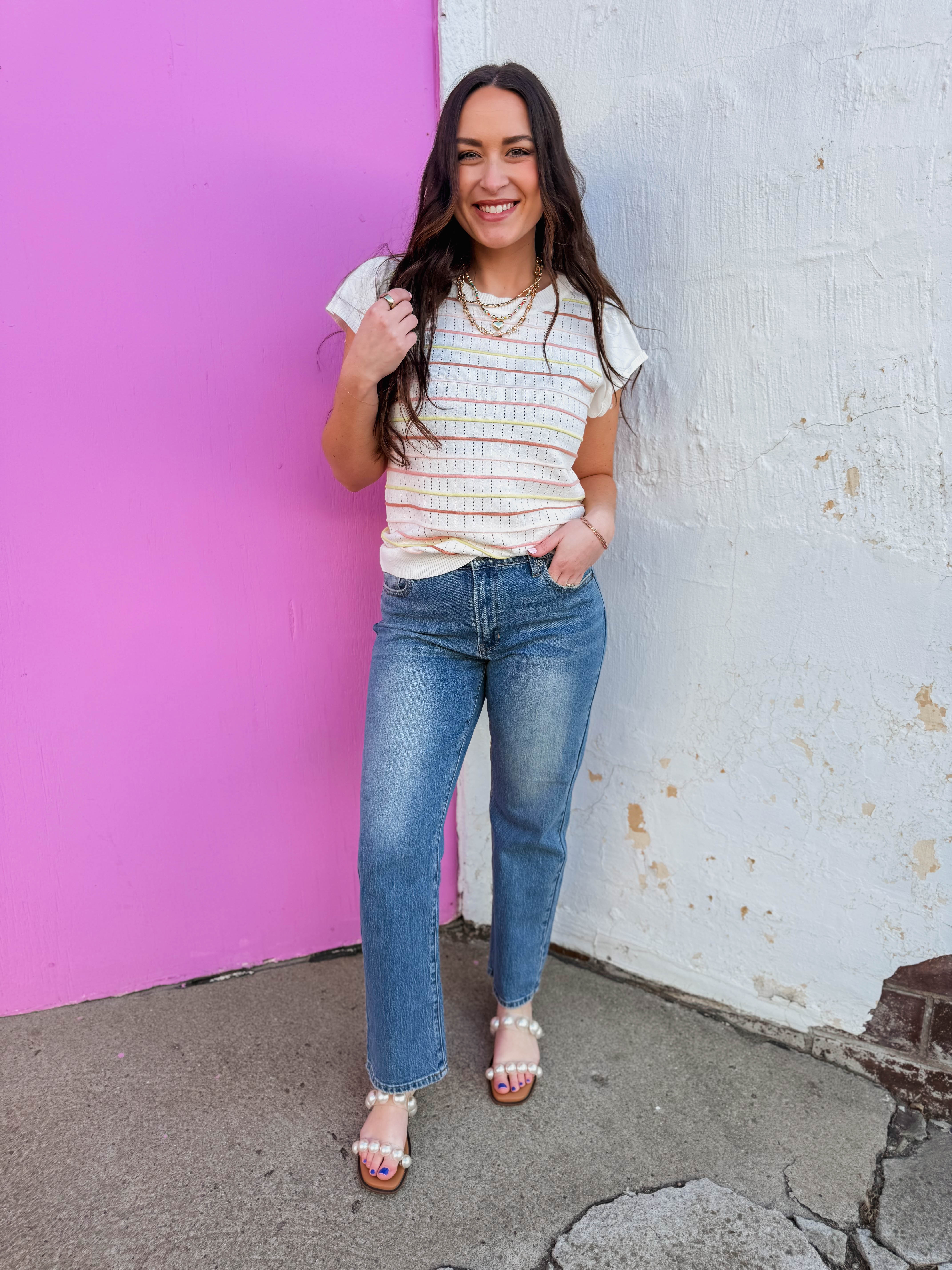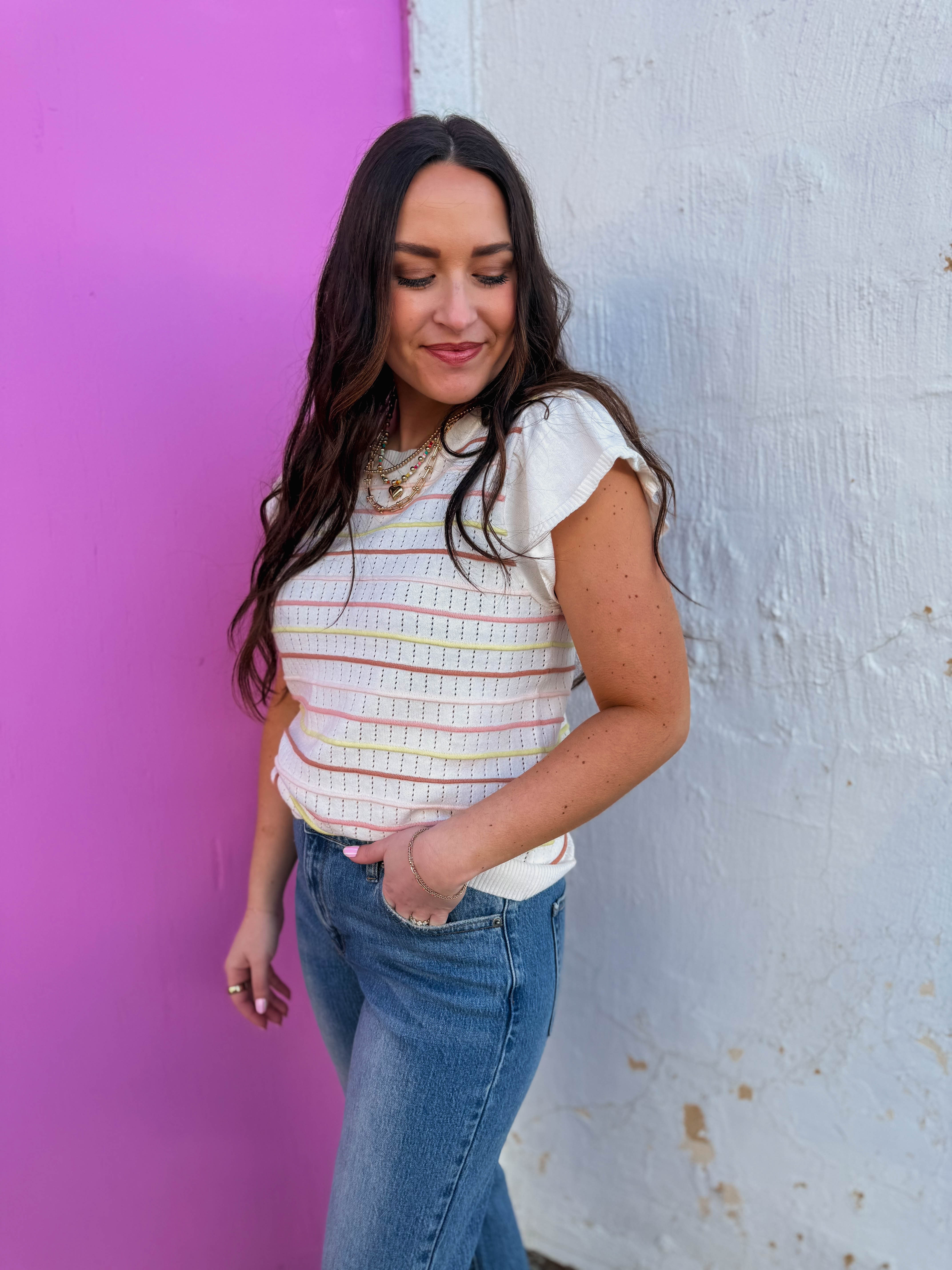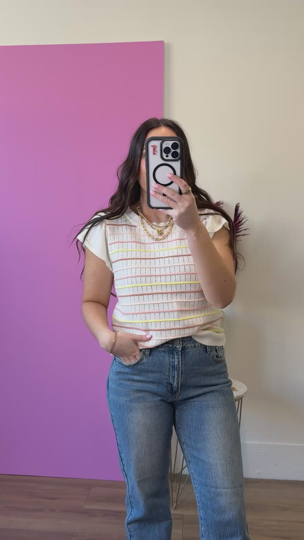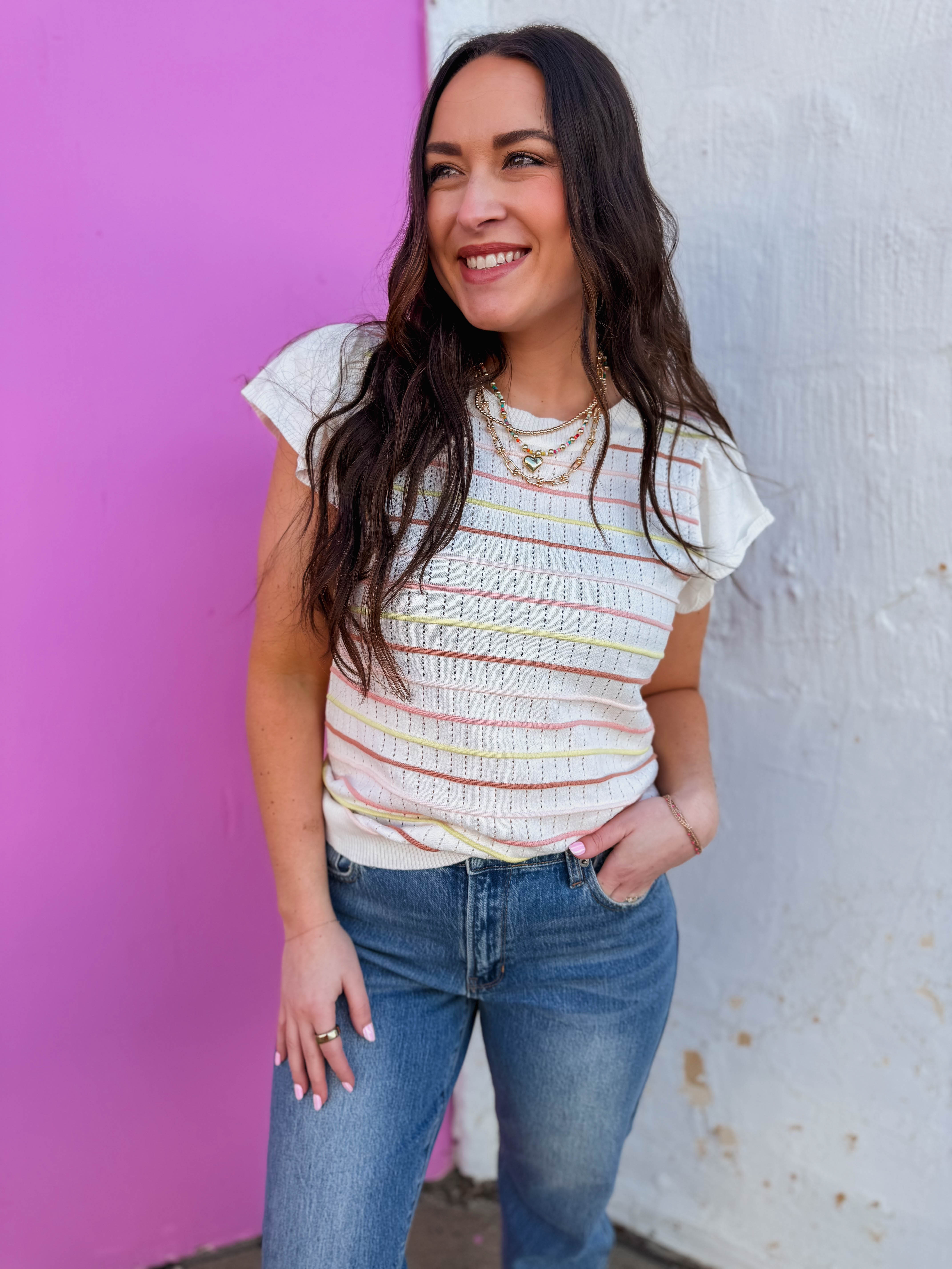 Brighten your wardrobe with the Abigail Striped Knit Top. This charming sweater features vibrant multicolor stripes that bring instant personality to any outfit. Perfect for layering through spring and summer, it's the effortless way to add a playful pop of color to your everyday style.