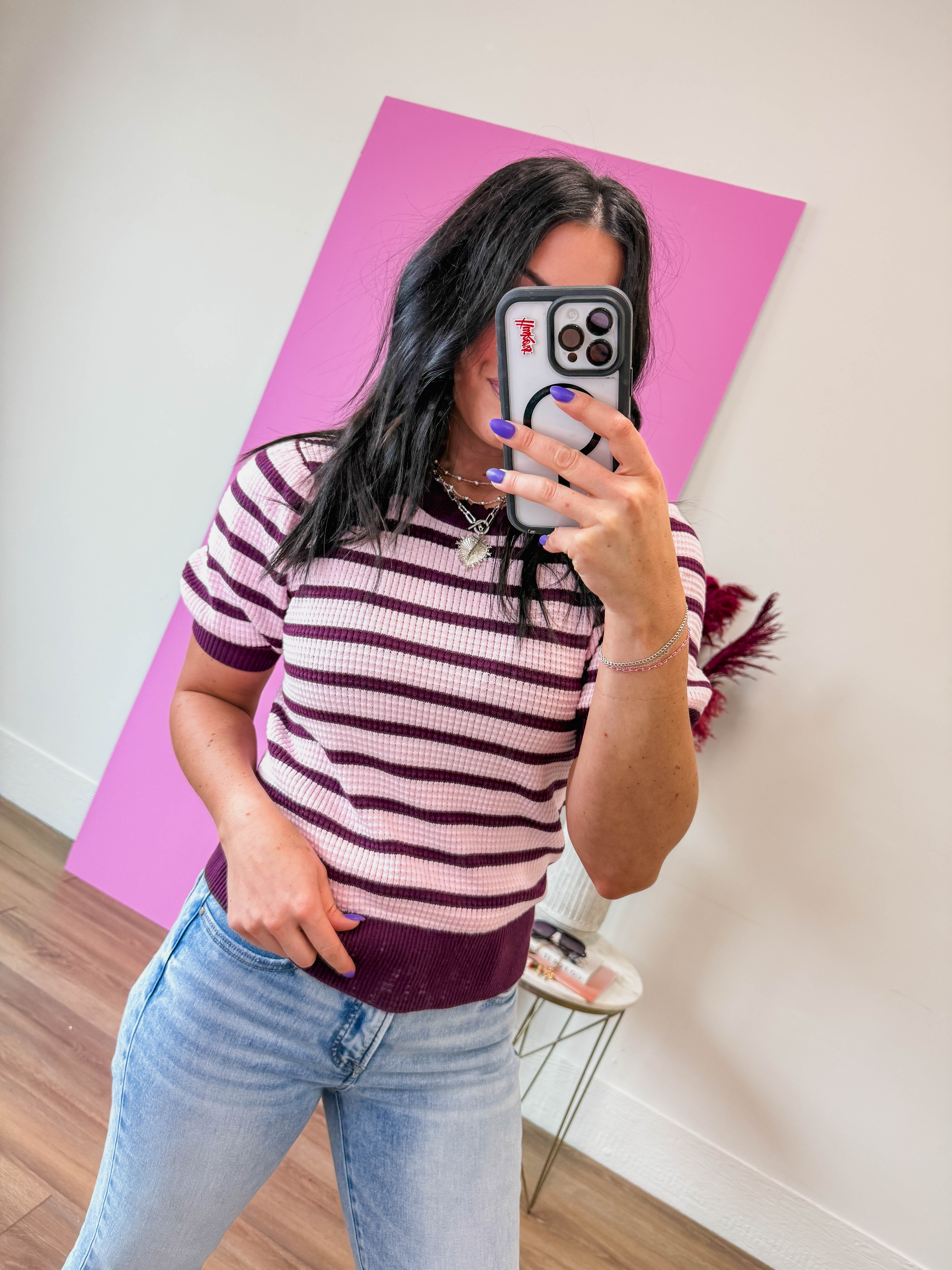 Elevate your basics with this striped knit top featuring charming scalloped edges. The classic stripe pattern offers timeless appeal while the delicate scalloped trim adds a feminine, refined touch. Soft and breathable, it's perfect for layering or wearing as a standalone piece with your favorite bottoms. A polished essential that brings subtle sophistication to any casual or dressed-up look.