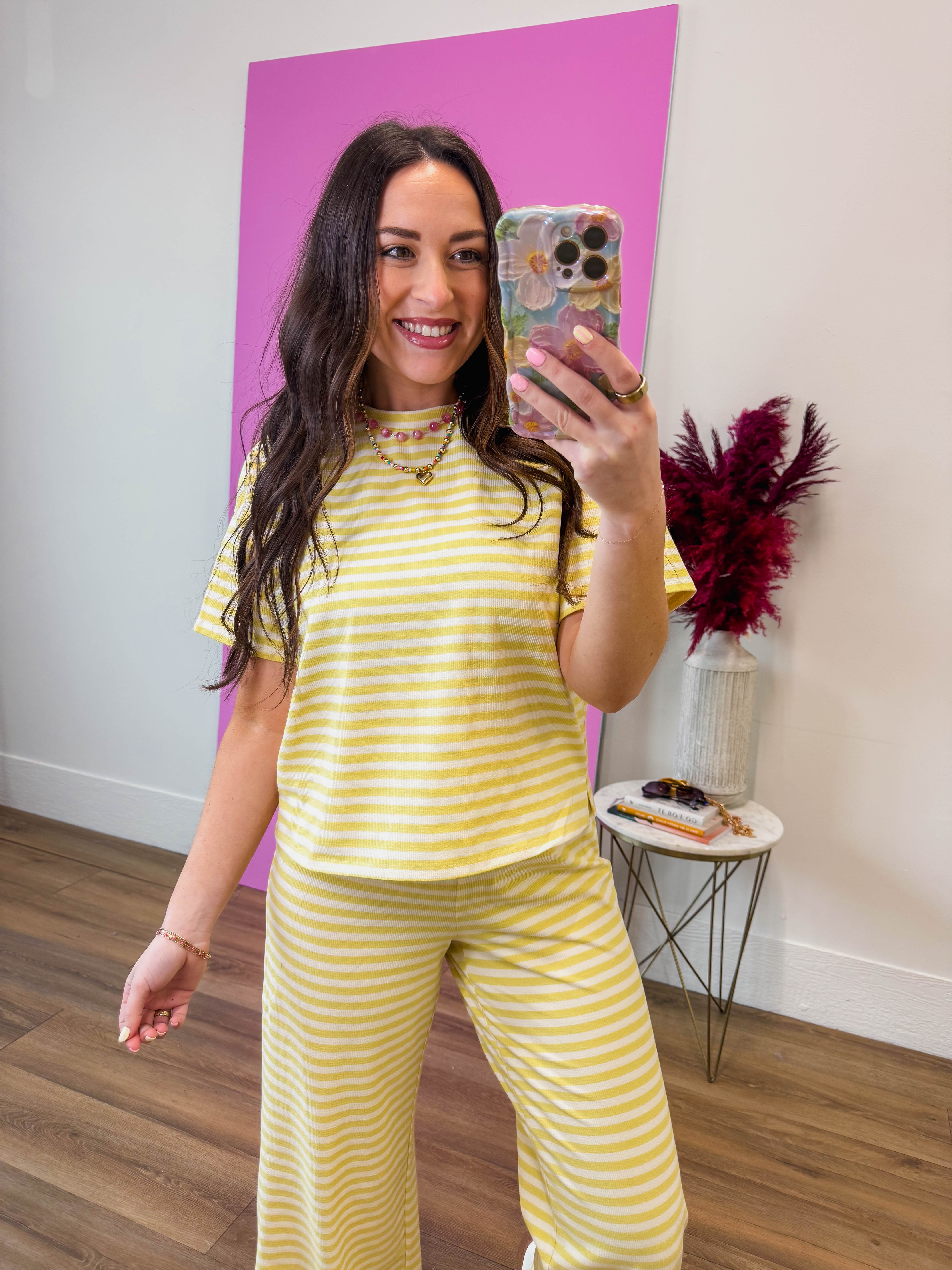 Effortless style meets vibrant flair with this striped tee in trendy yellow. Perfect for those grab-and-go days when you want to look put-together without the fuss. Pair it with our matching pants to create an instant coordinated look that turns heads.