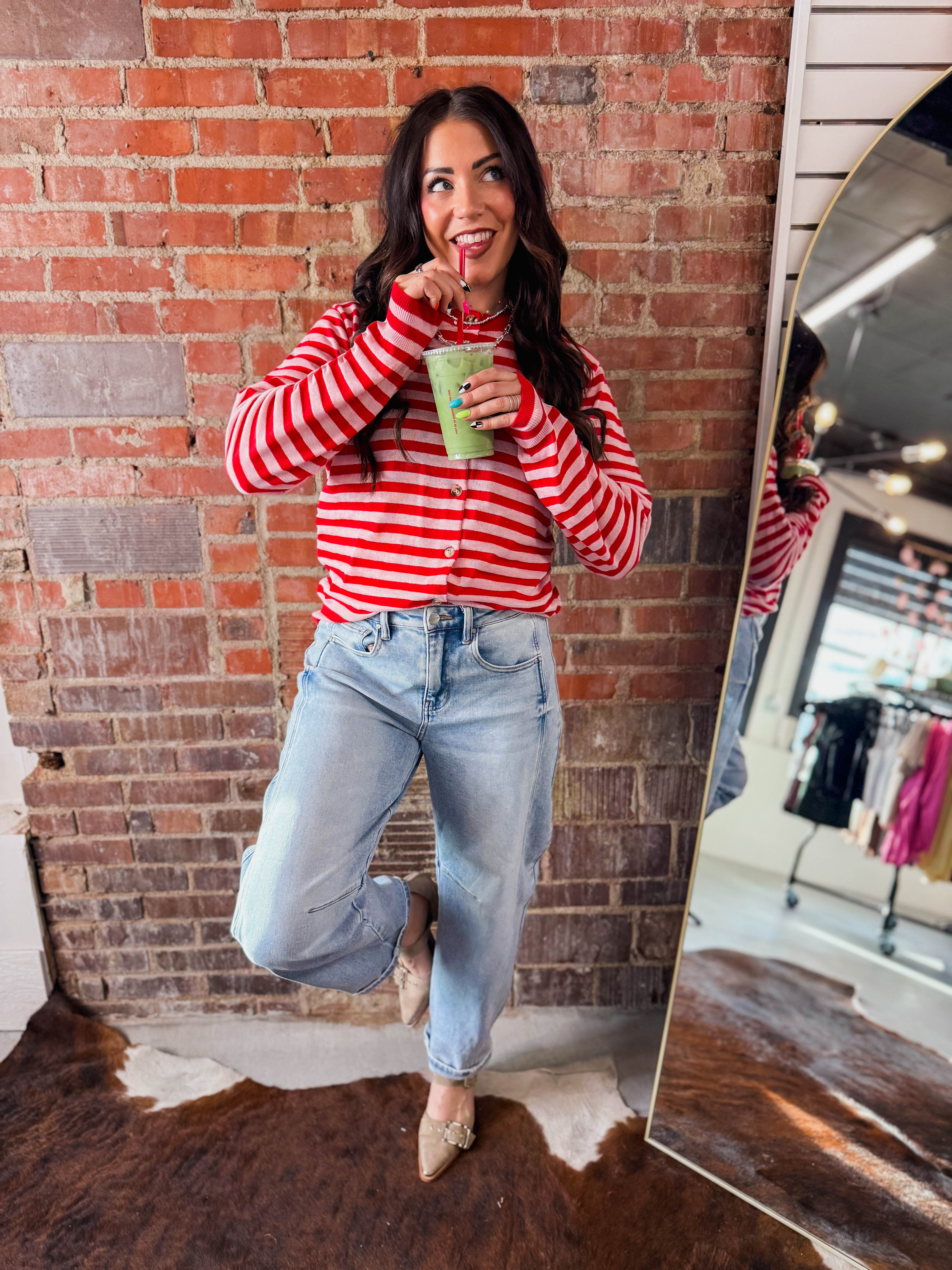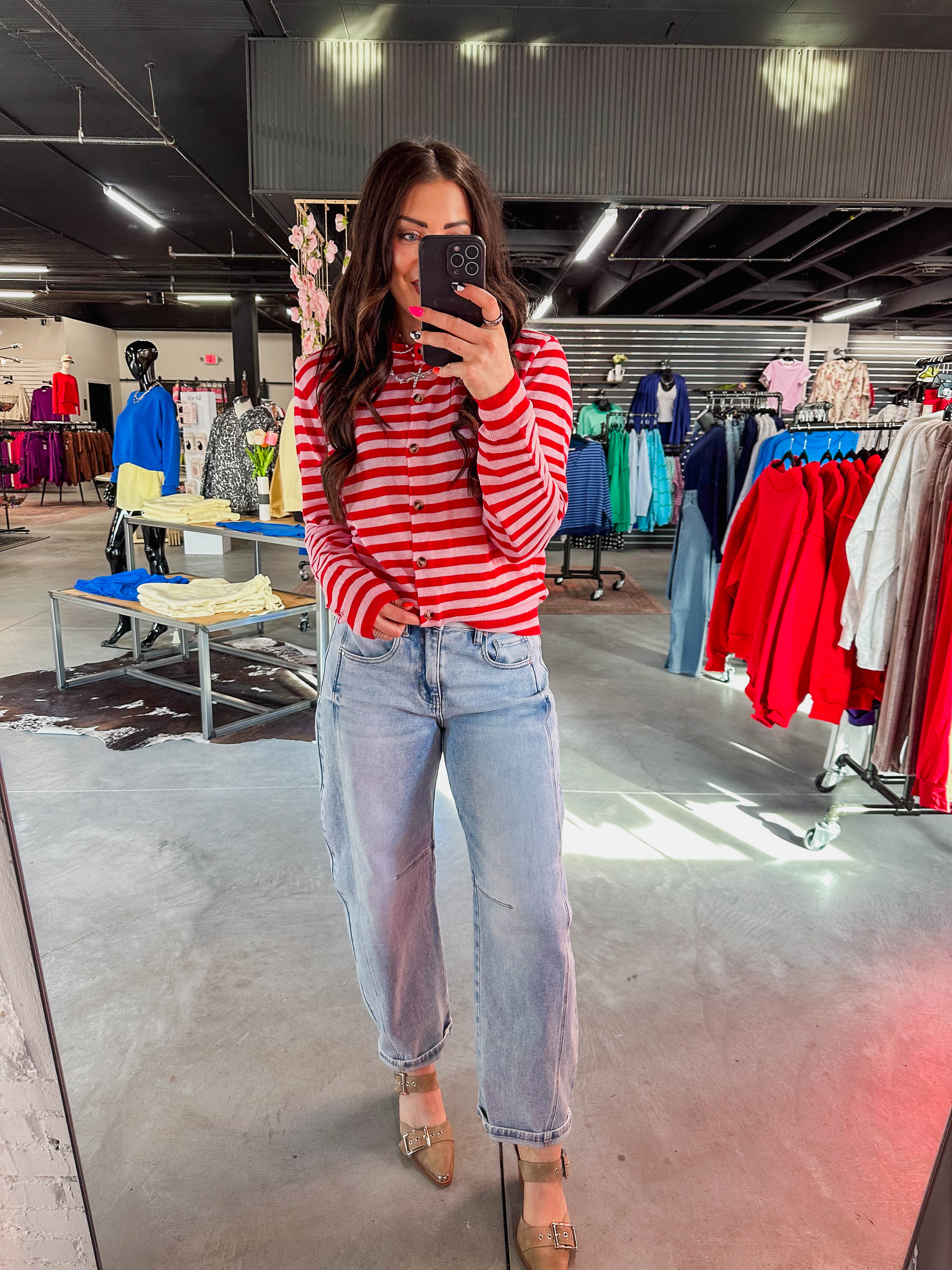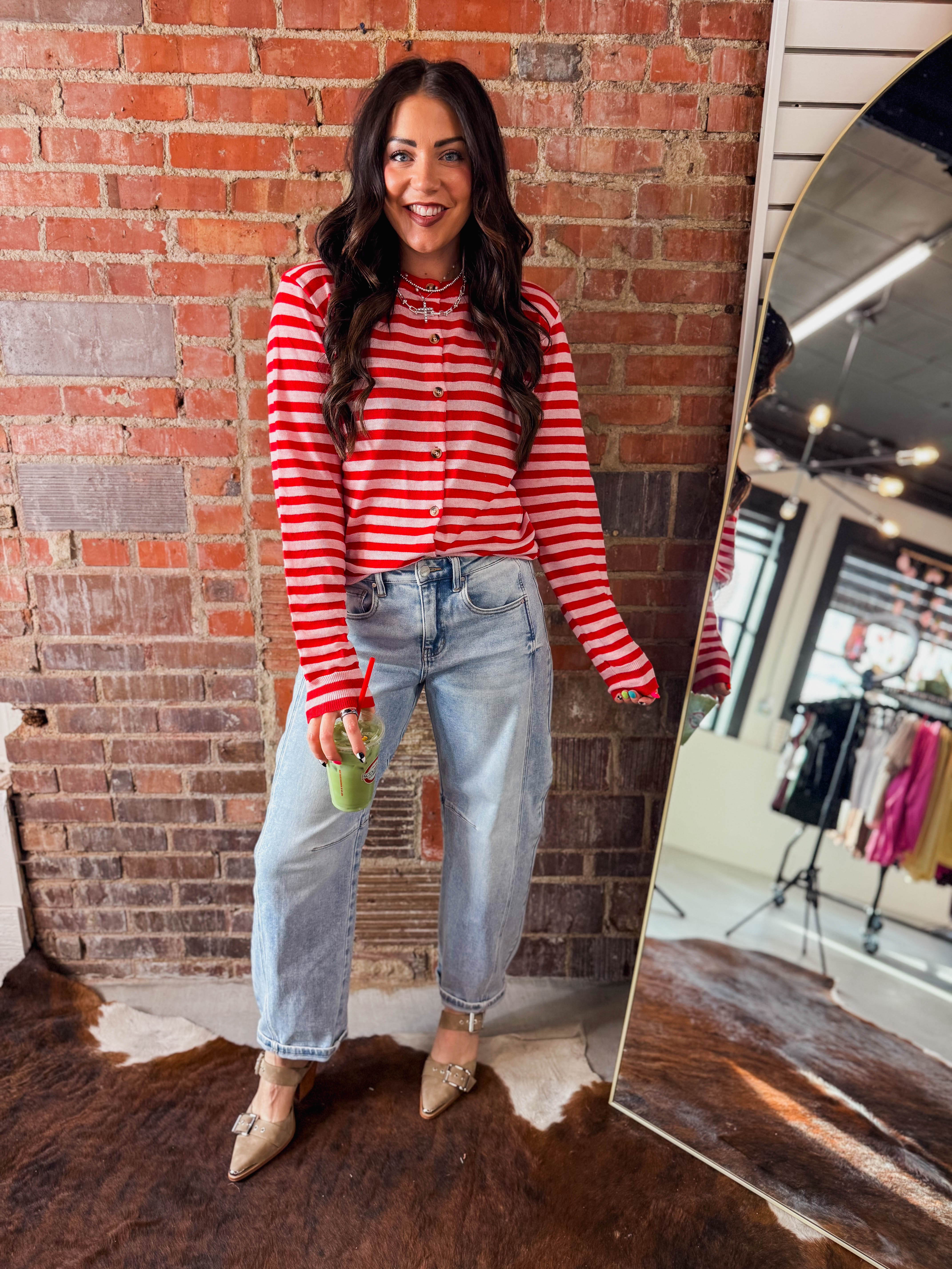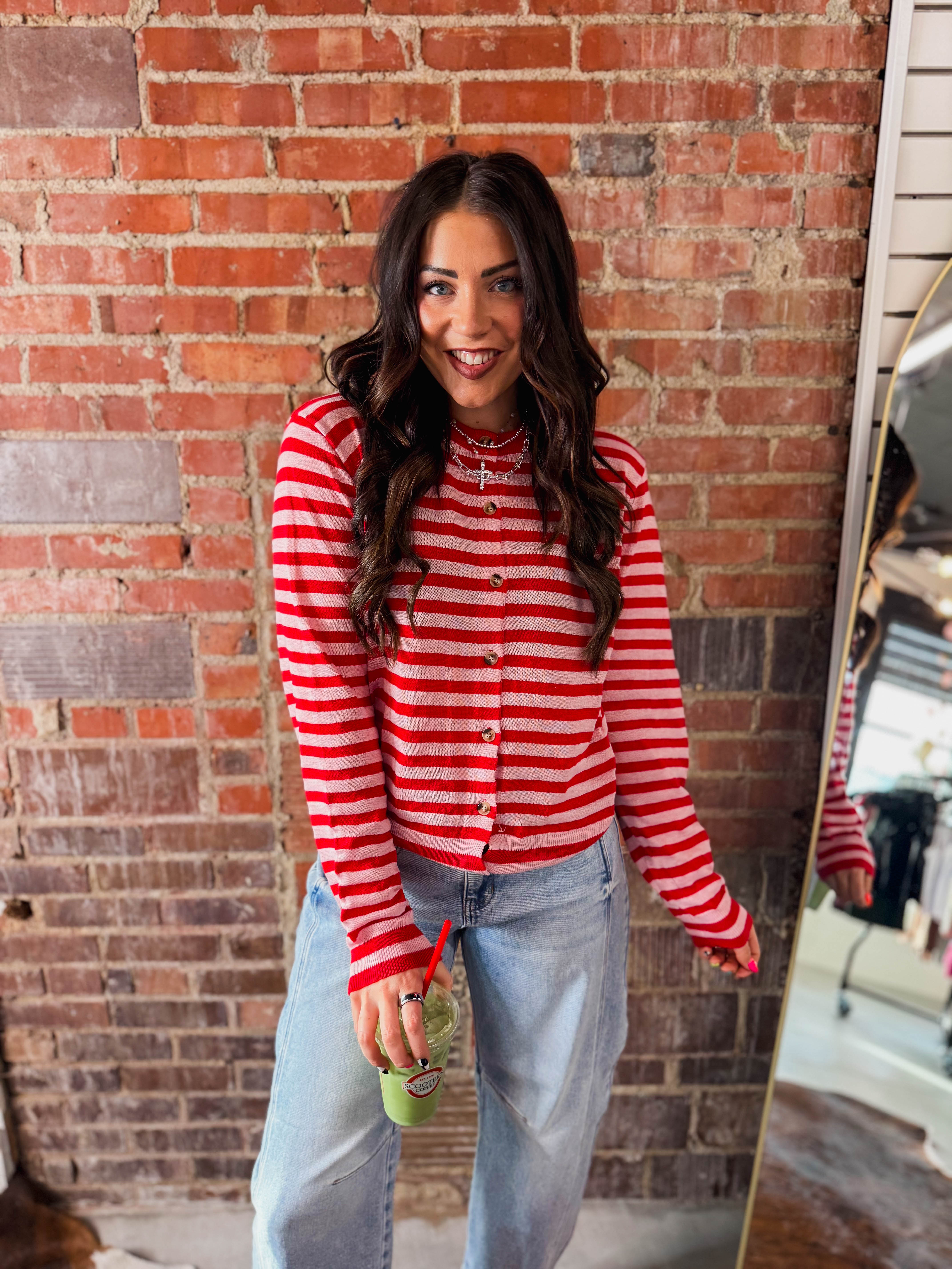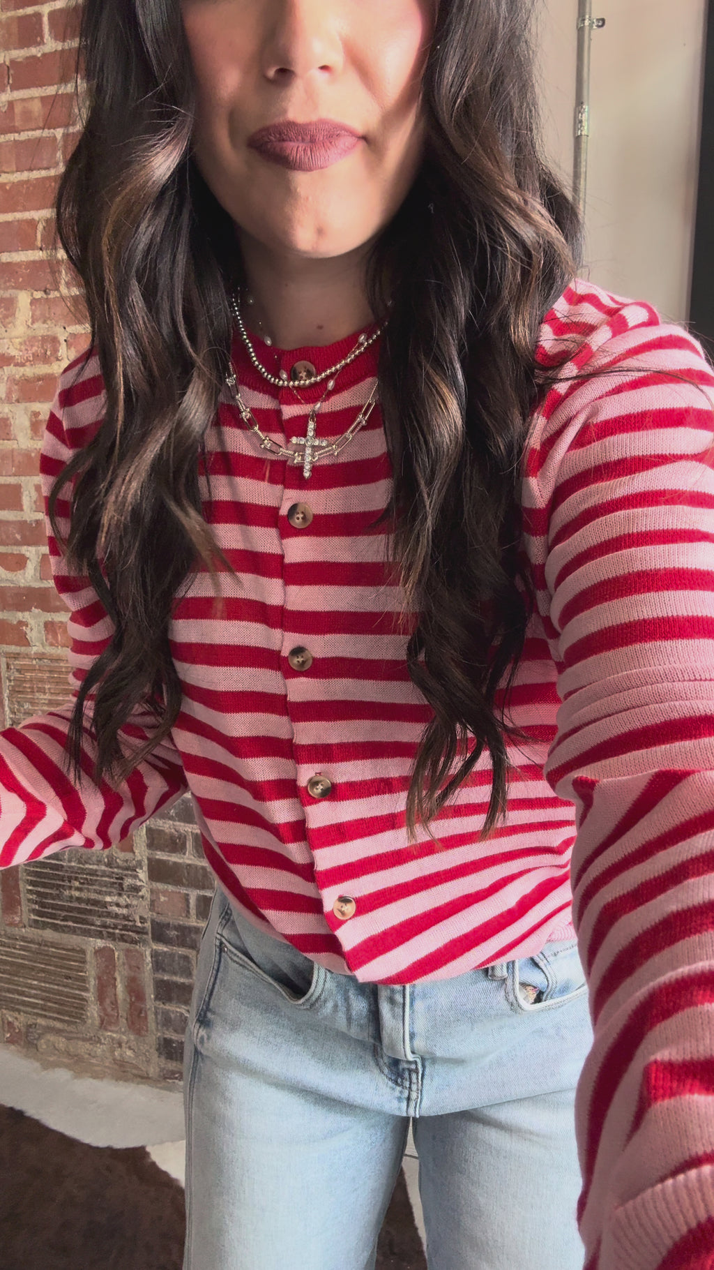 Wrap yourself in playful style with this striped cardigan that brings instant charm to any outfit. Featuring a classic round neckline, long sleeves, and a convenient button-front closure, it's as practical as it is fun. The bold stripe pattern paired with contrast trim delivers that perfect pop of color to brighten your day. Cozy, versatile, and undeniably cute—your new favorite layer awaits.