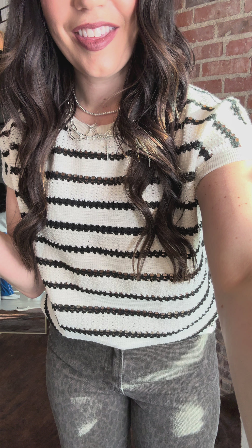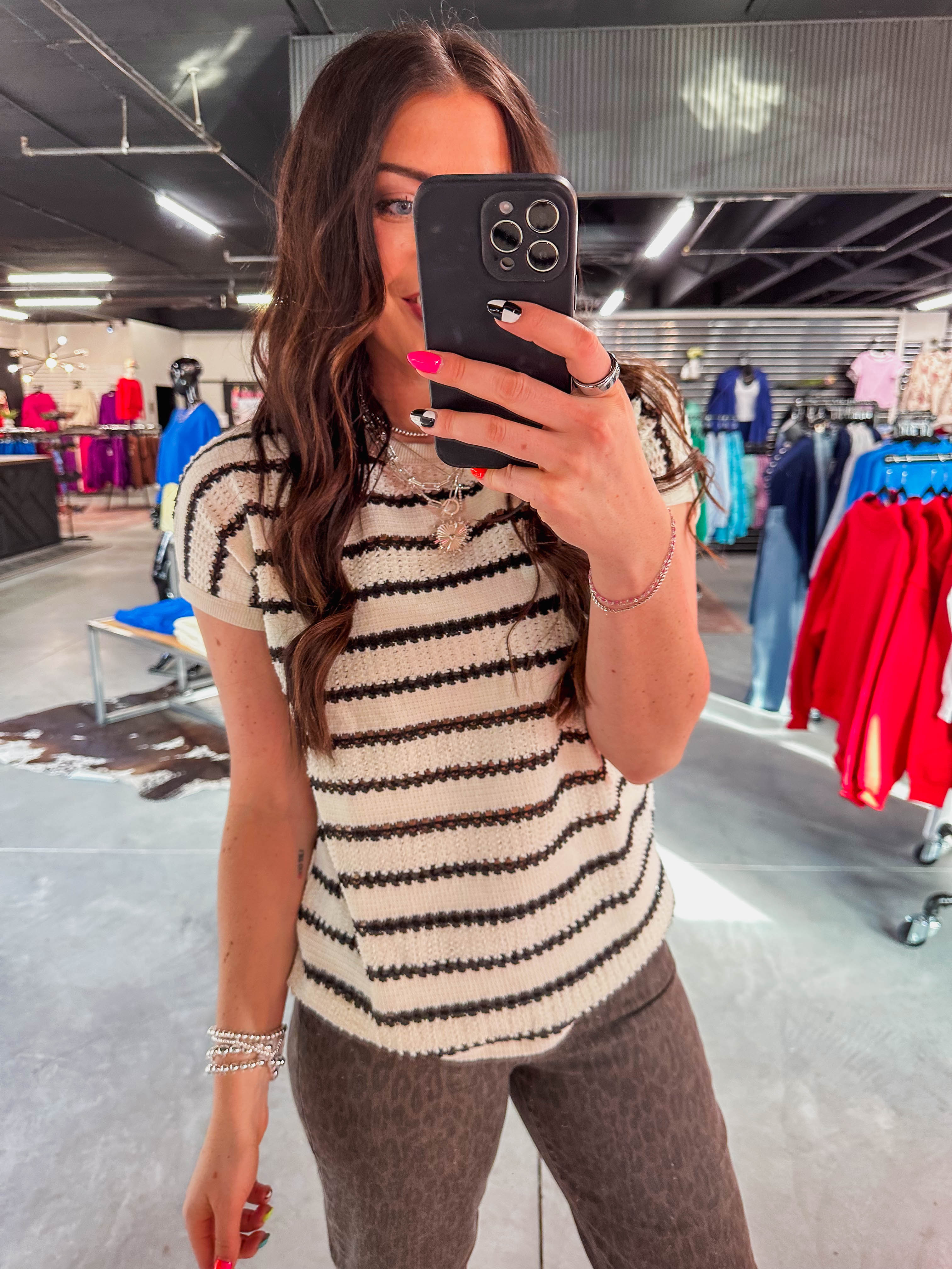 Effortlessly chic, this striped knit top transitions from office to weekend with ease. The crew neckline and extended short sleeves offer a polished silhouette, while the delicate pointelle knit adds texture and breathability. Perfect for layering or wearing solo, it's your new go-to for versatile style.