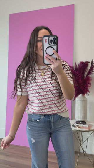 Embrace textured style with this crochet knit sweater featuring classic stripes and short sleeves. The intricate crochet construction creates visual depth and breathable comfort, making it ideal for layering or wearing solo. The striped pattern adds dimension while maintaining a timeless appeal. Perfect for casual outings or relaxed weekends, this sweater brings artisanal charm to your everyday rotation.