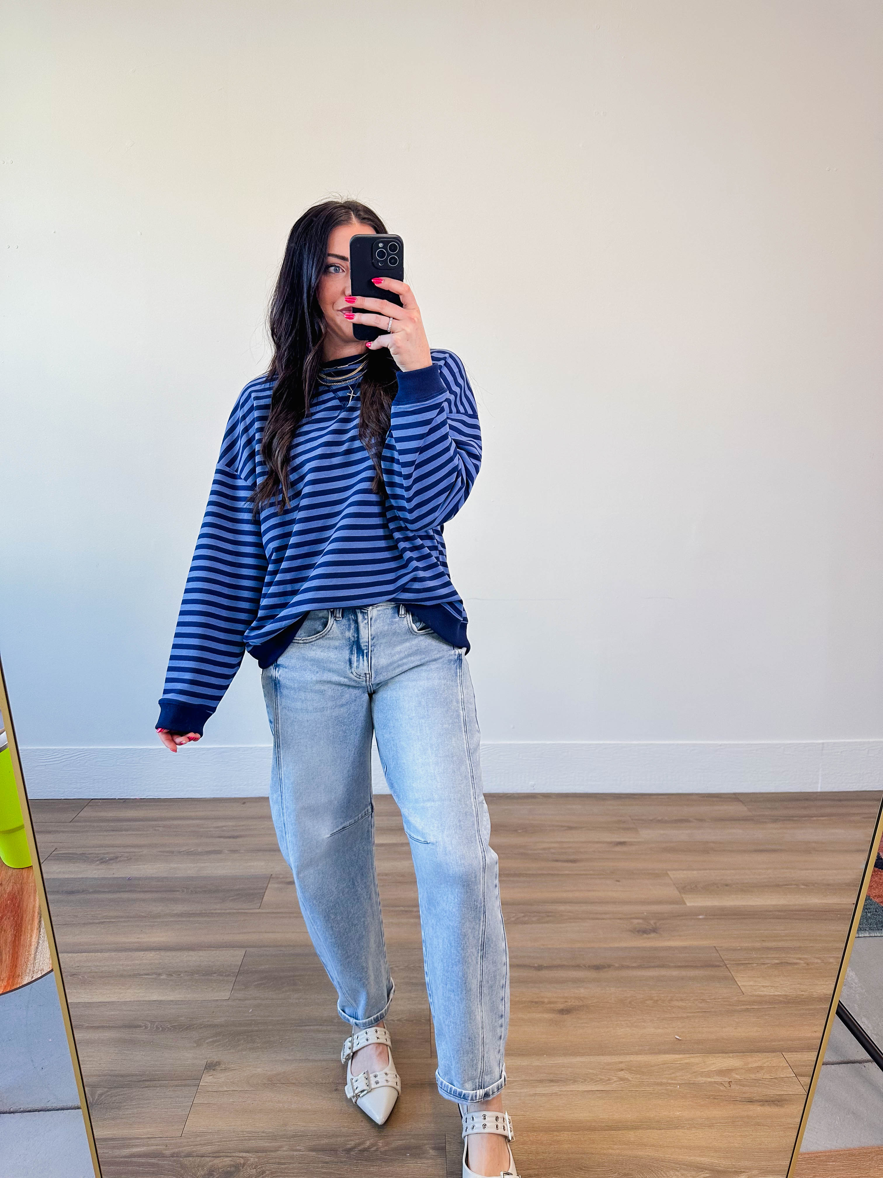 Rock a striped look that's anything but boring! This oversized pullover features a cozy crew neckline, long sleeves, and playful pink and red stripes with contrast trim that pops. Perfect for layering year-round, it's the kind of piece that makes getting dressed actually fun.