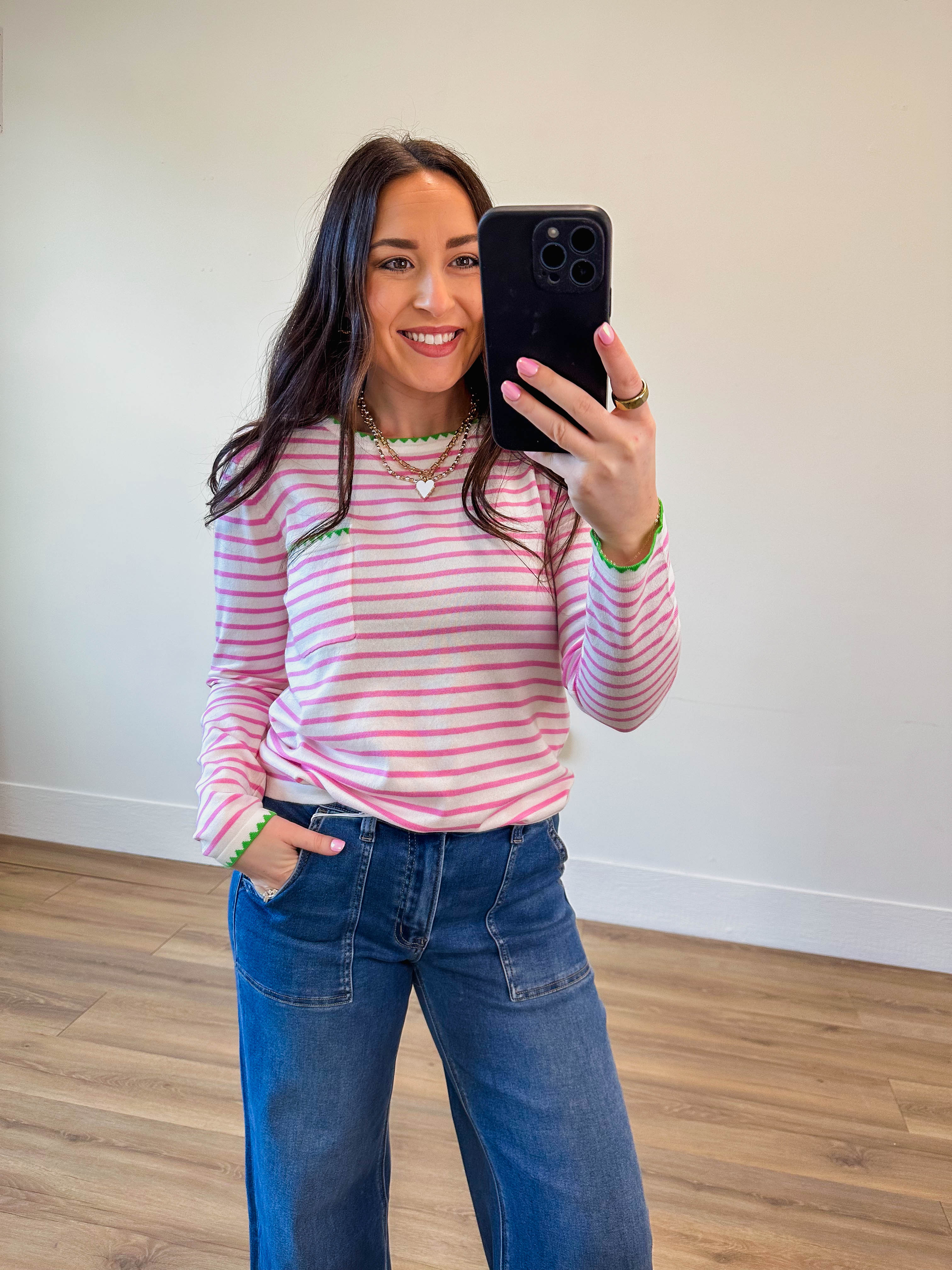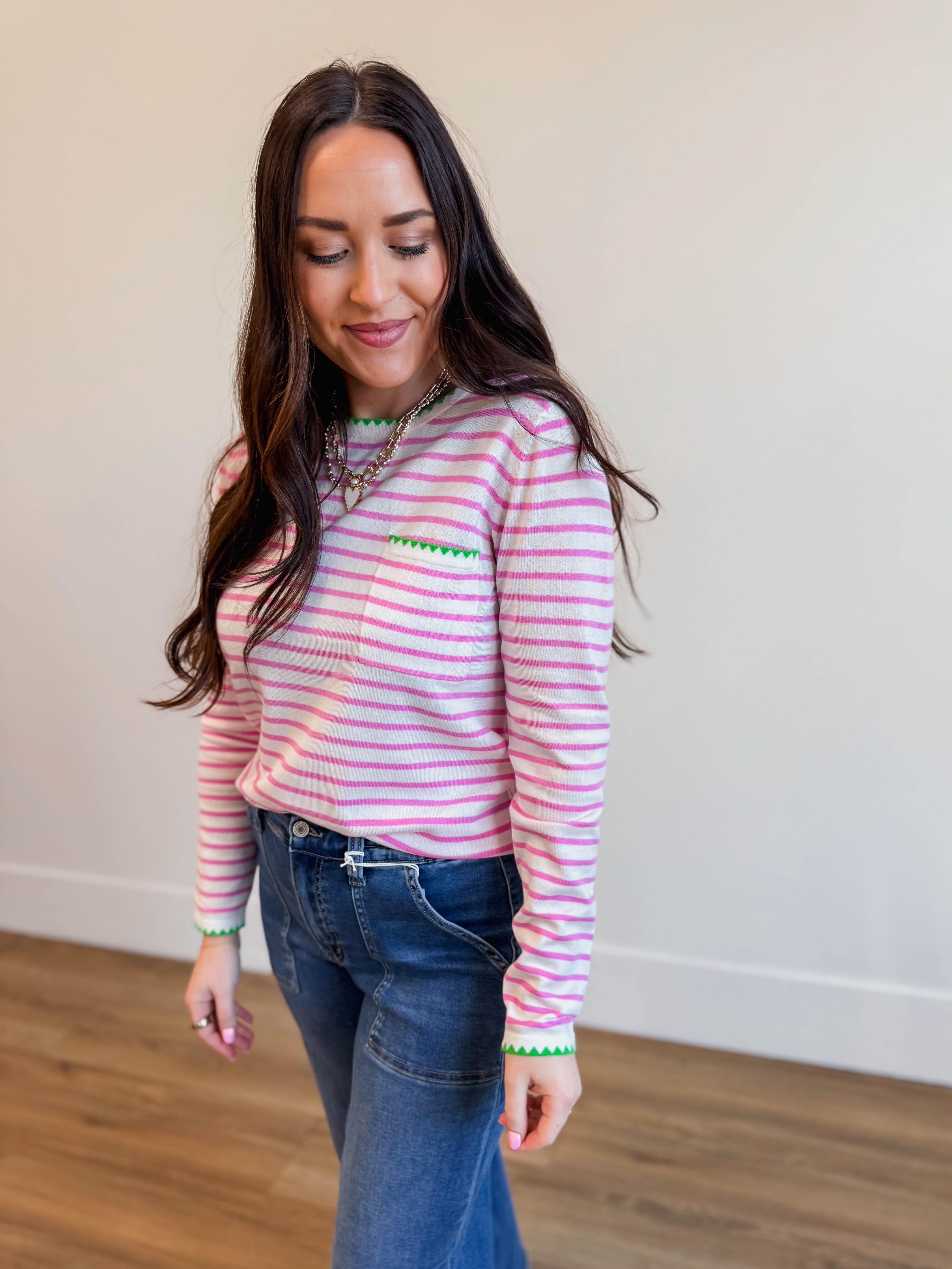 Throw on the Rhea and instantly upgrade your day. This striped pullover sweater is all about easy style—crew neckline, long sleeves, and a functional chest pocket keep things practical while the vibrant stripes inject personality into every outfit. Finished with quality blanket stitching, it's the kind of piece that seamlessly takes you from desk to drinks without missing a beat.