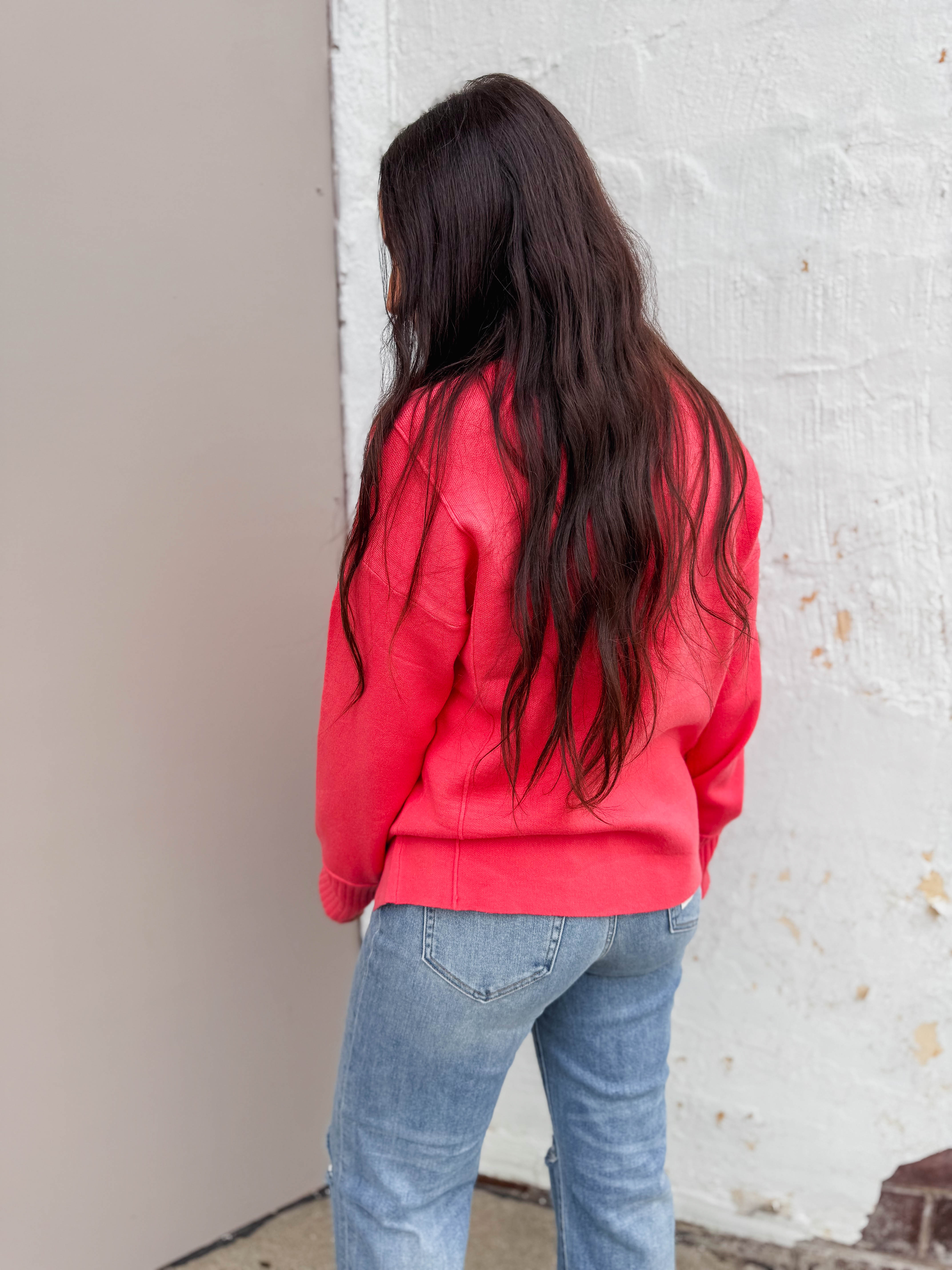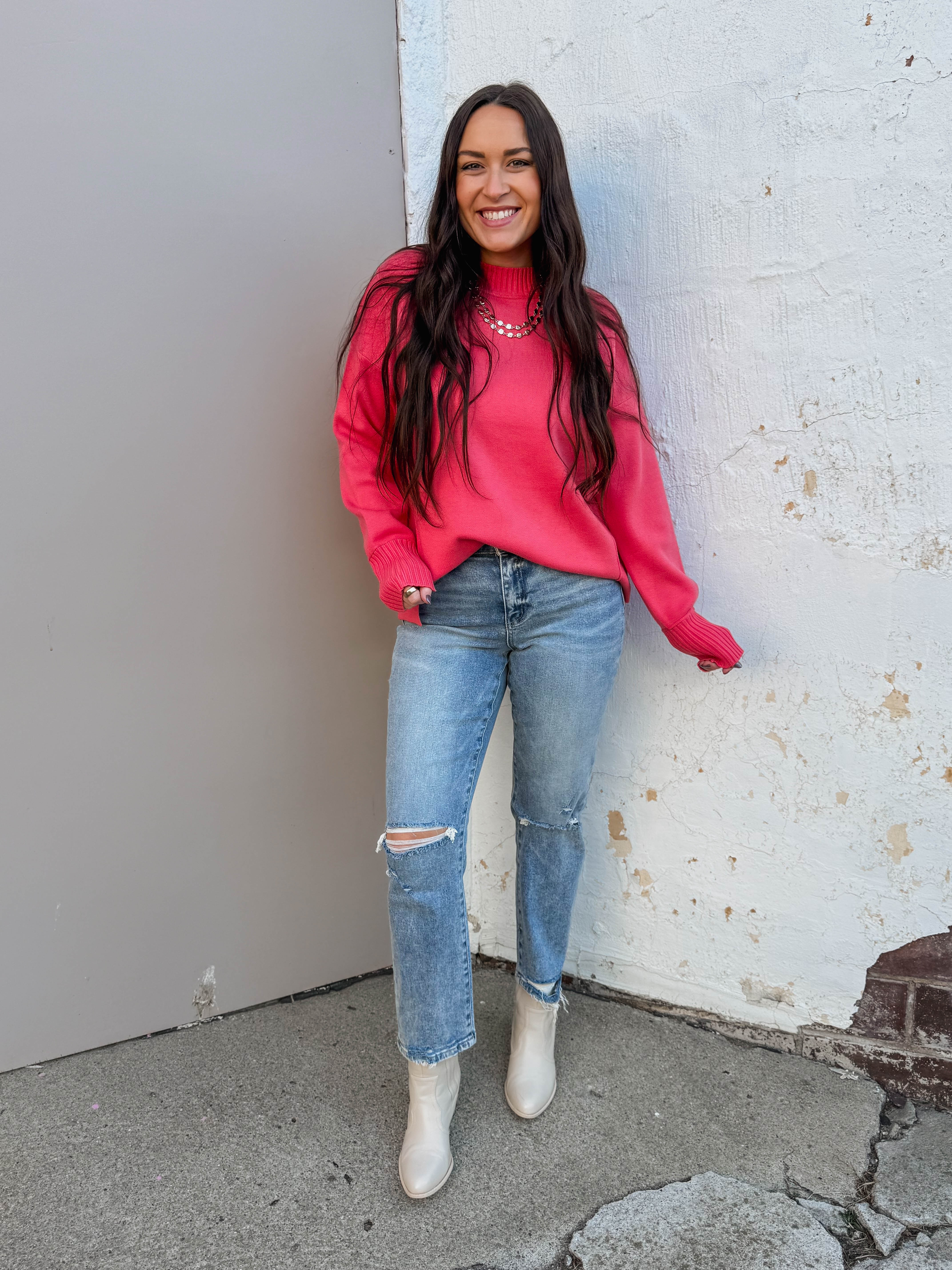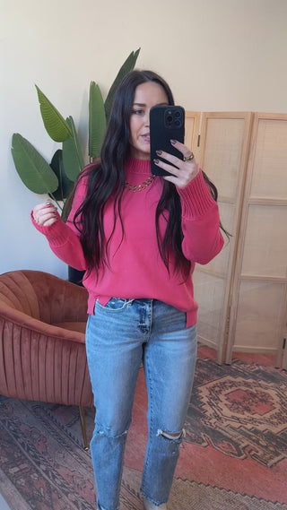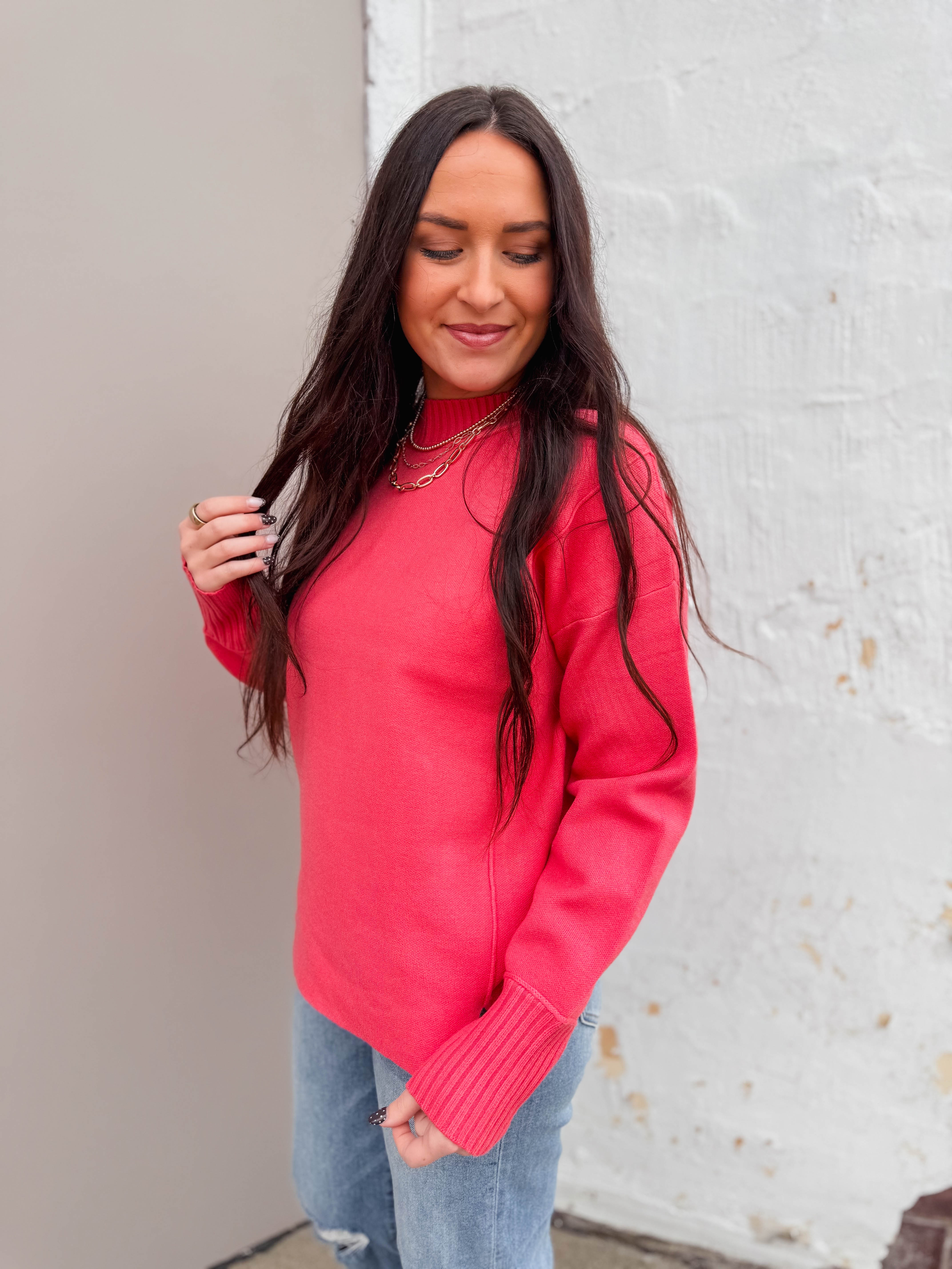 Cozy up in the Sophia Sweater, a simple pullover with playful twists. Featuring a chic mock neck, long sleeves, and side slits for easy movement, plus chunky ribbed hems and stylish shoulder seams that make this sweater stand out. Perfect for adding a pop of coral charm to any outfit!