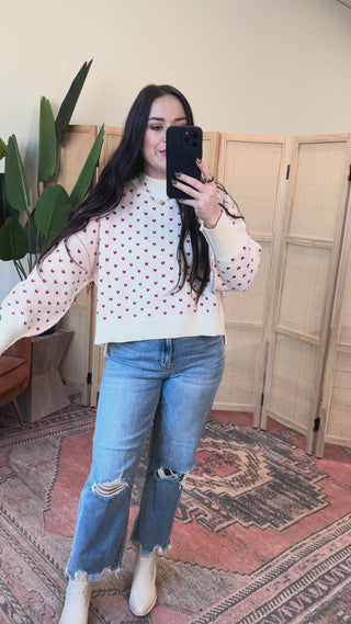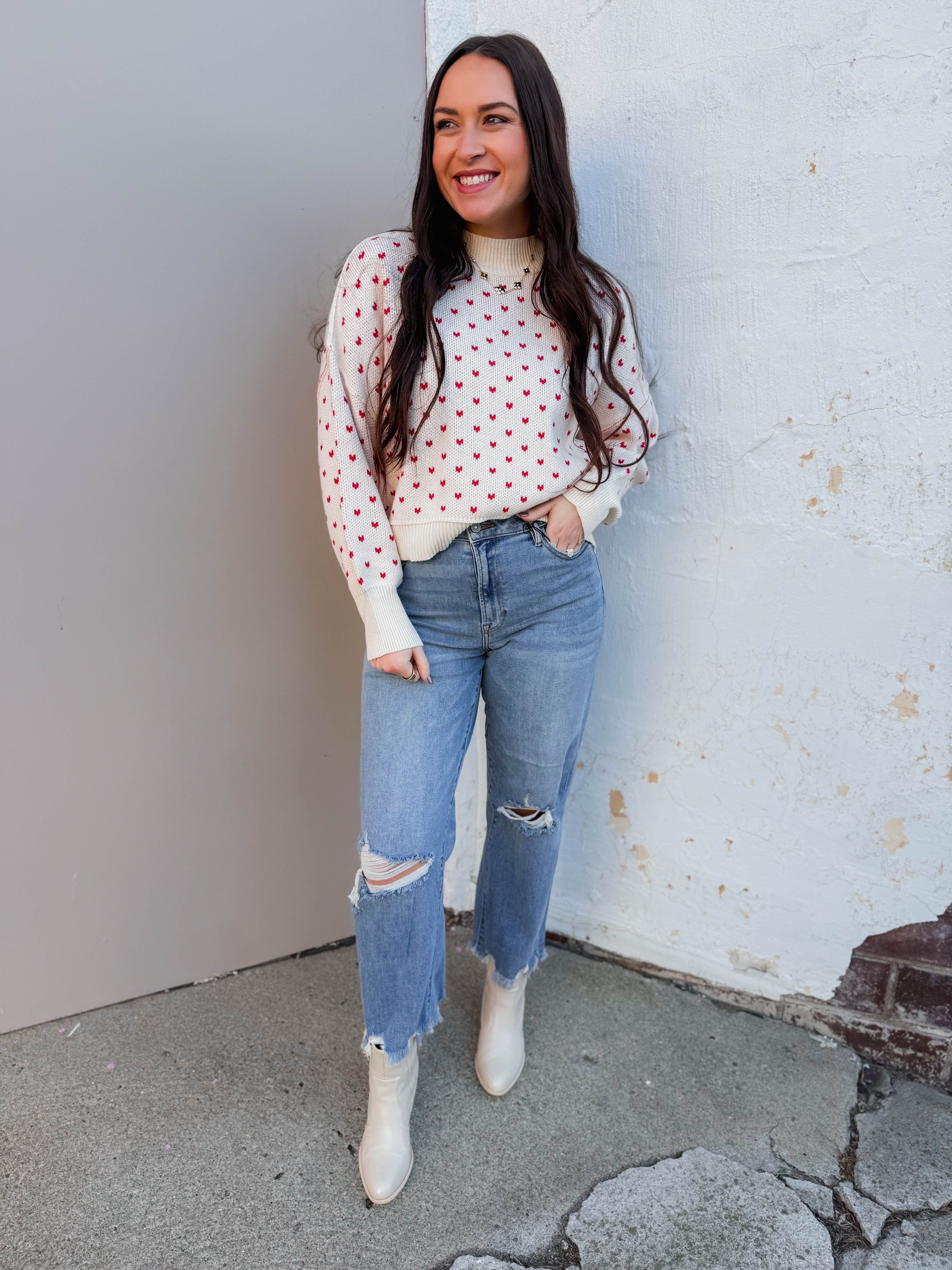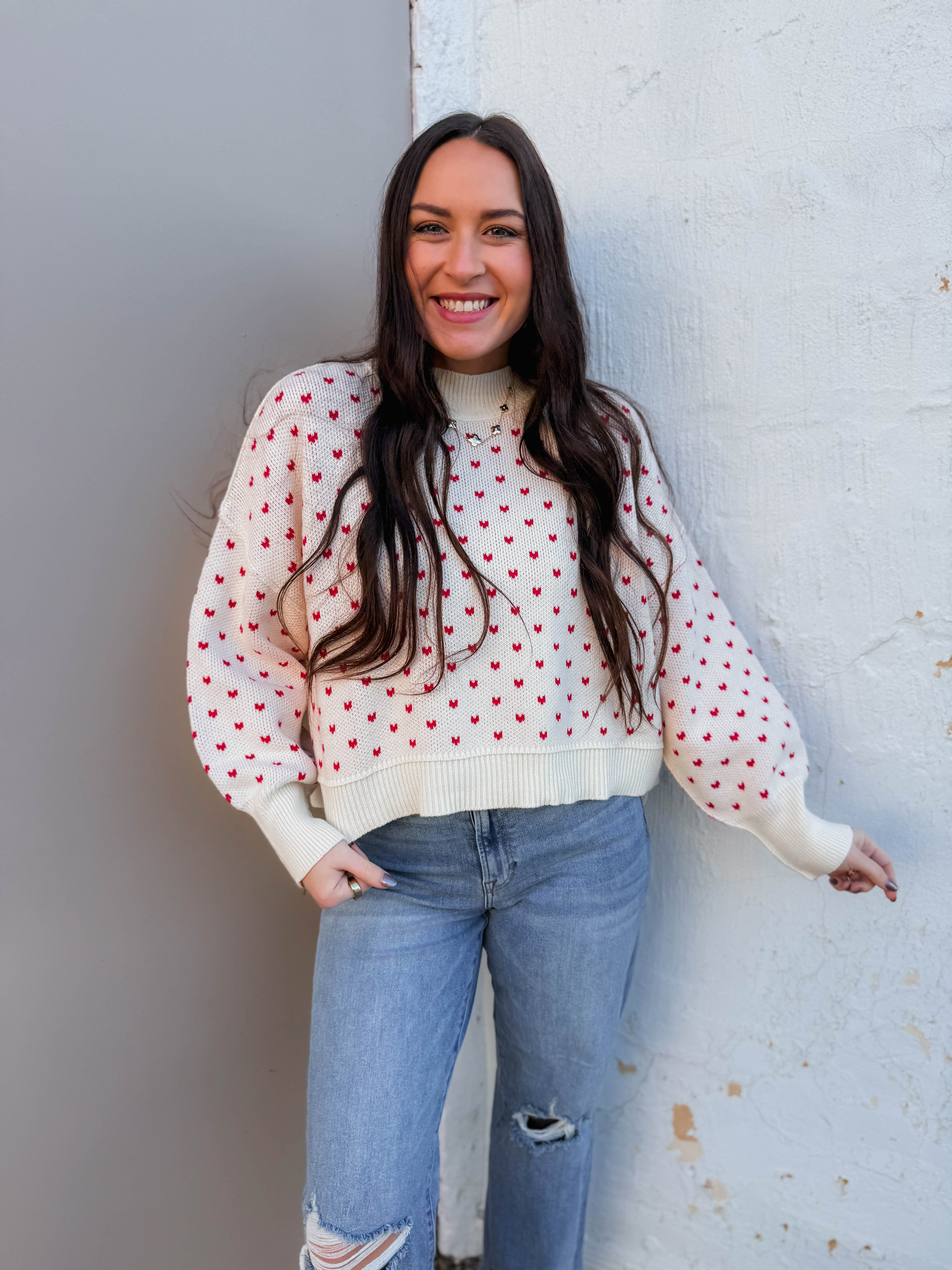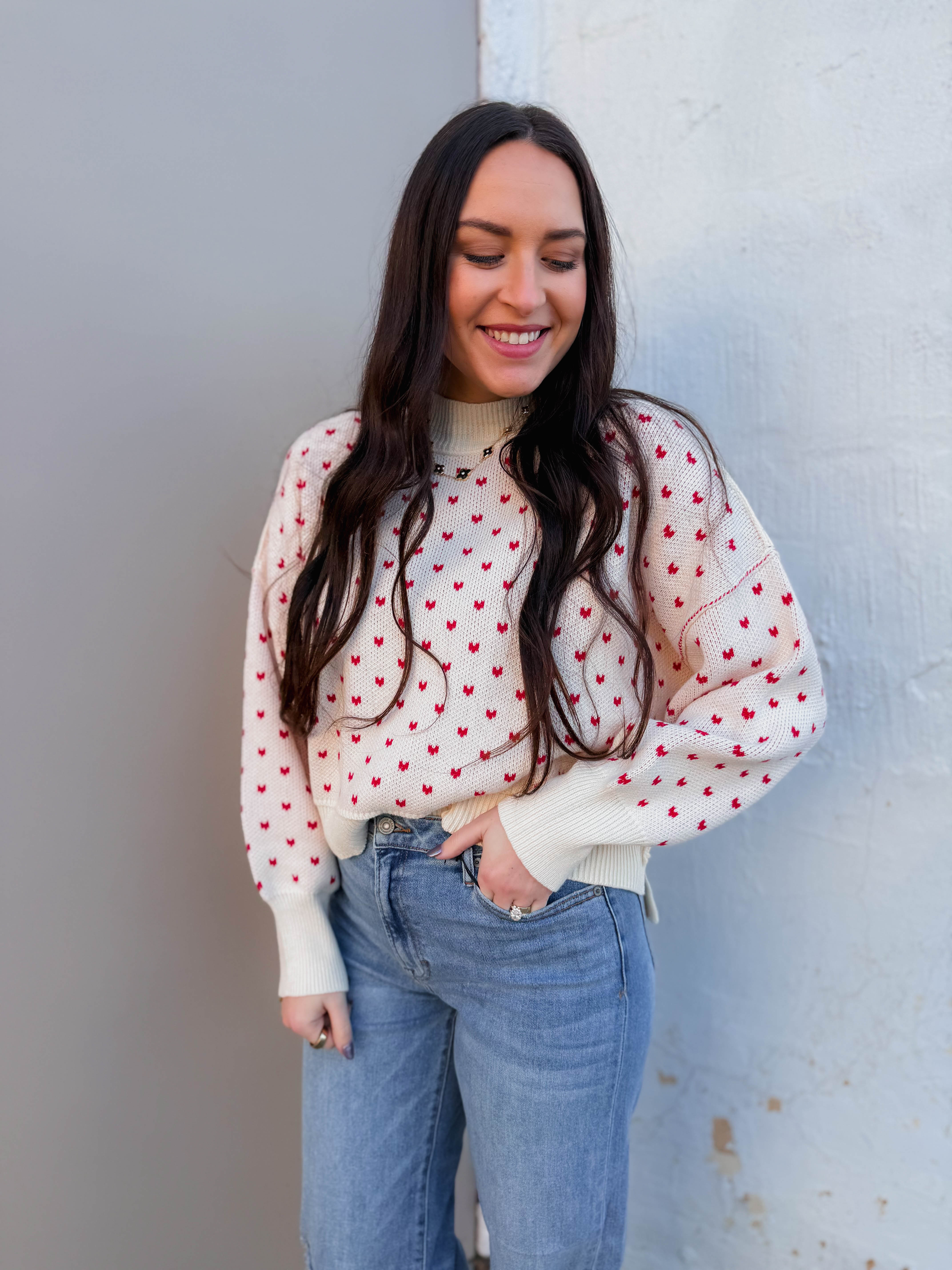 Cozy up in this adorable pullover sweater featuring an all-over heart pattern that's perfect for expressing your softer side. The mock neckline and relaxed fit make it effortlessly cute and comfy, whether you're heading to the office or hanging out on the weekend. Long sleeves keep you warm while the laid-back silhouette lets you move freely.