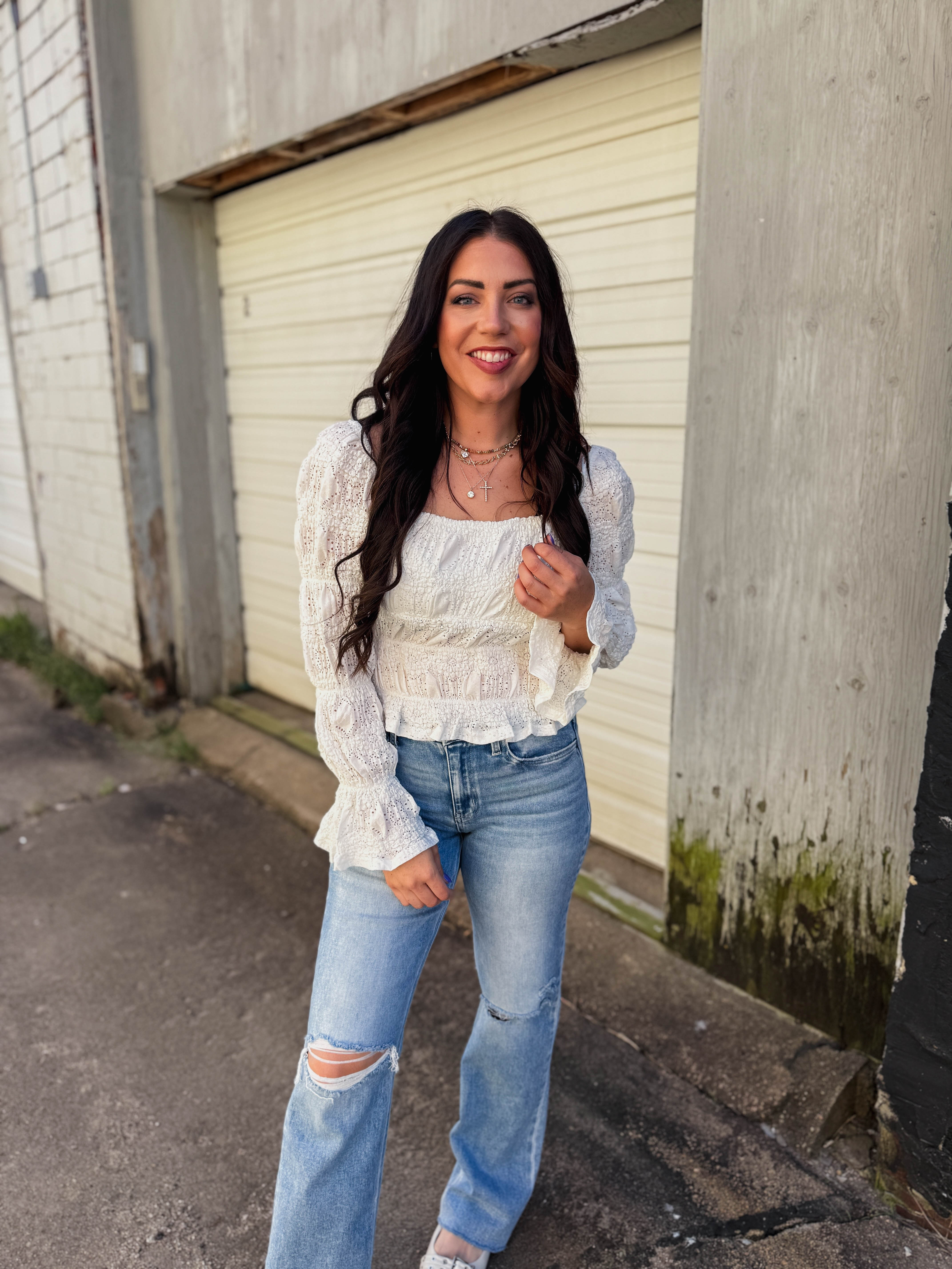 The Eden Lace Top features a flattering square neckline and long sleeves with charming gathered details. Its playful ruffle hems and cropped length make it perfect for concerts, family photos, or adding a cute touch to your everyday style year-round.