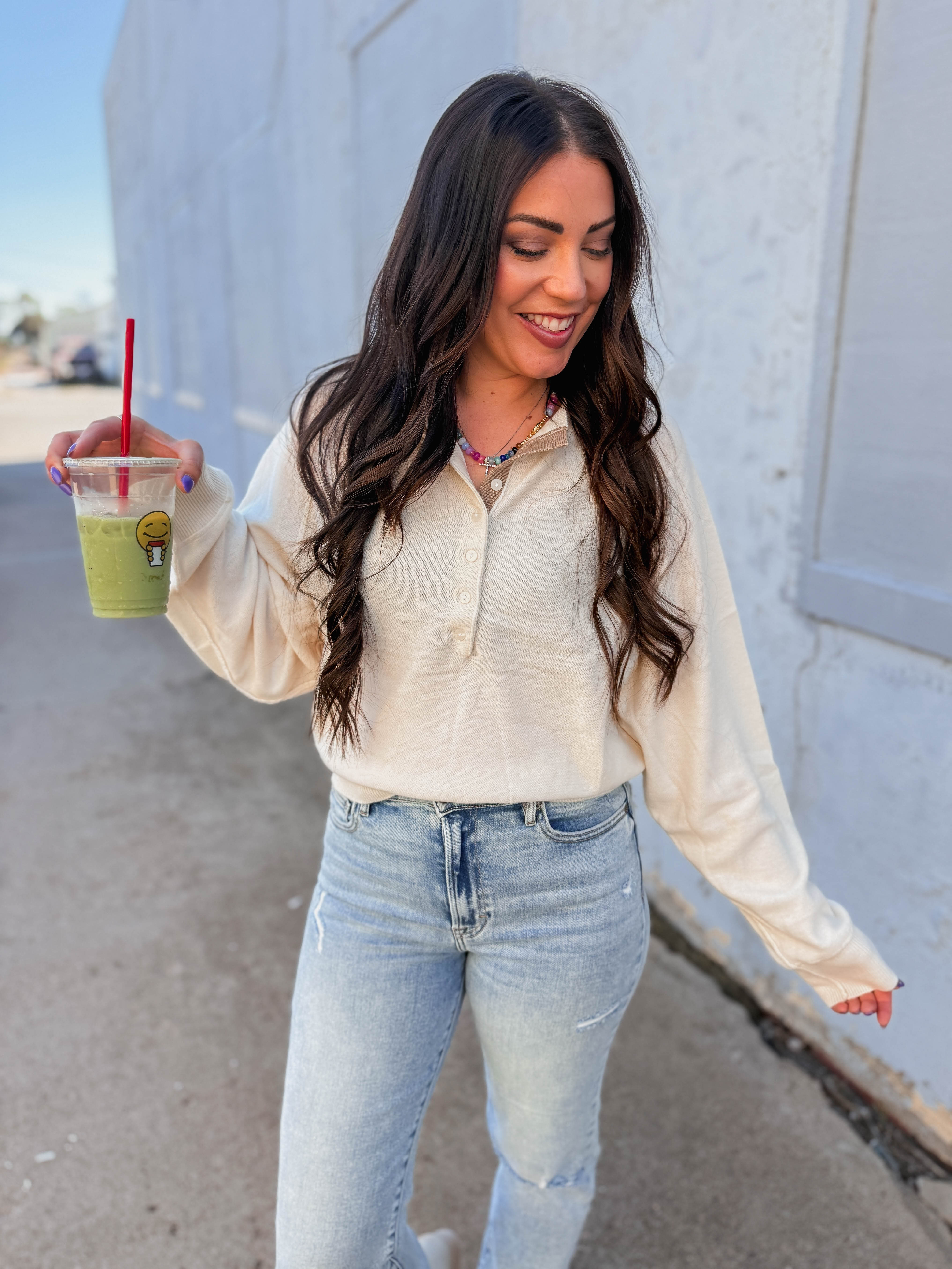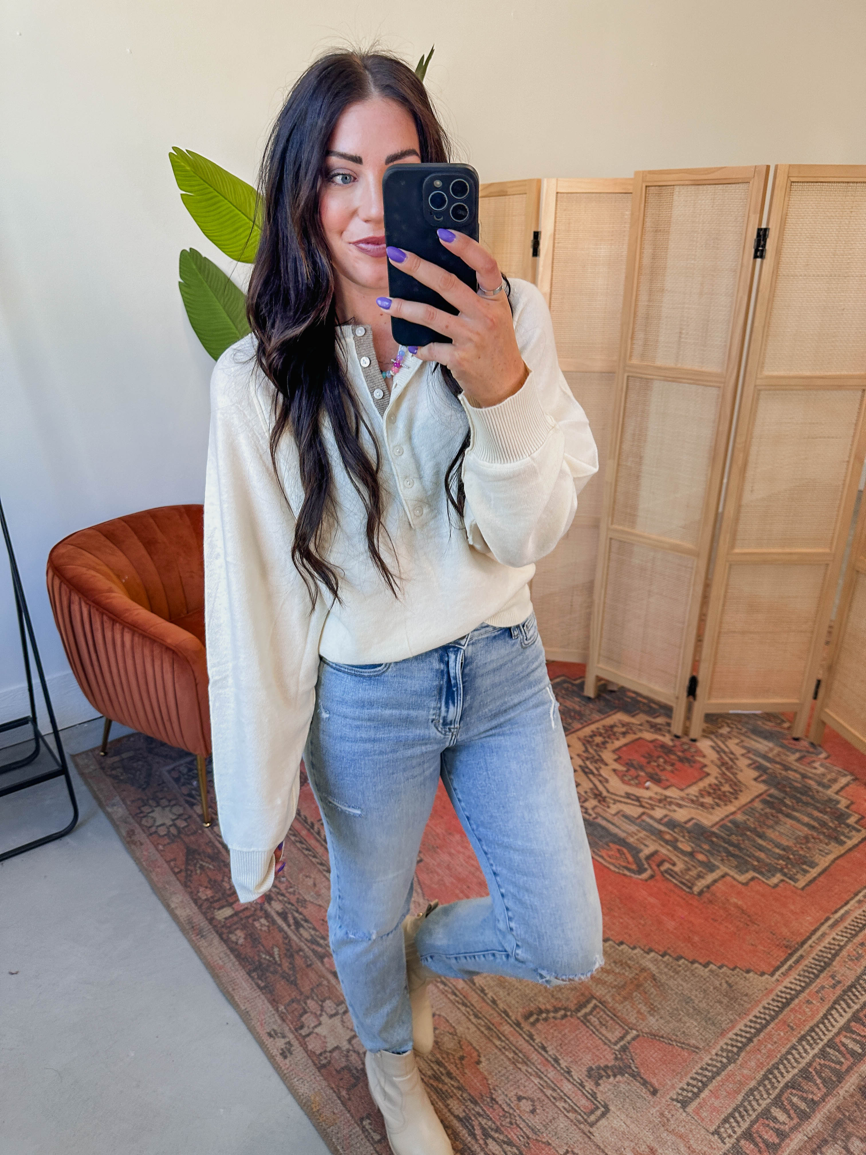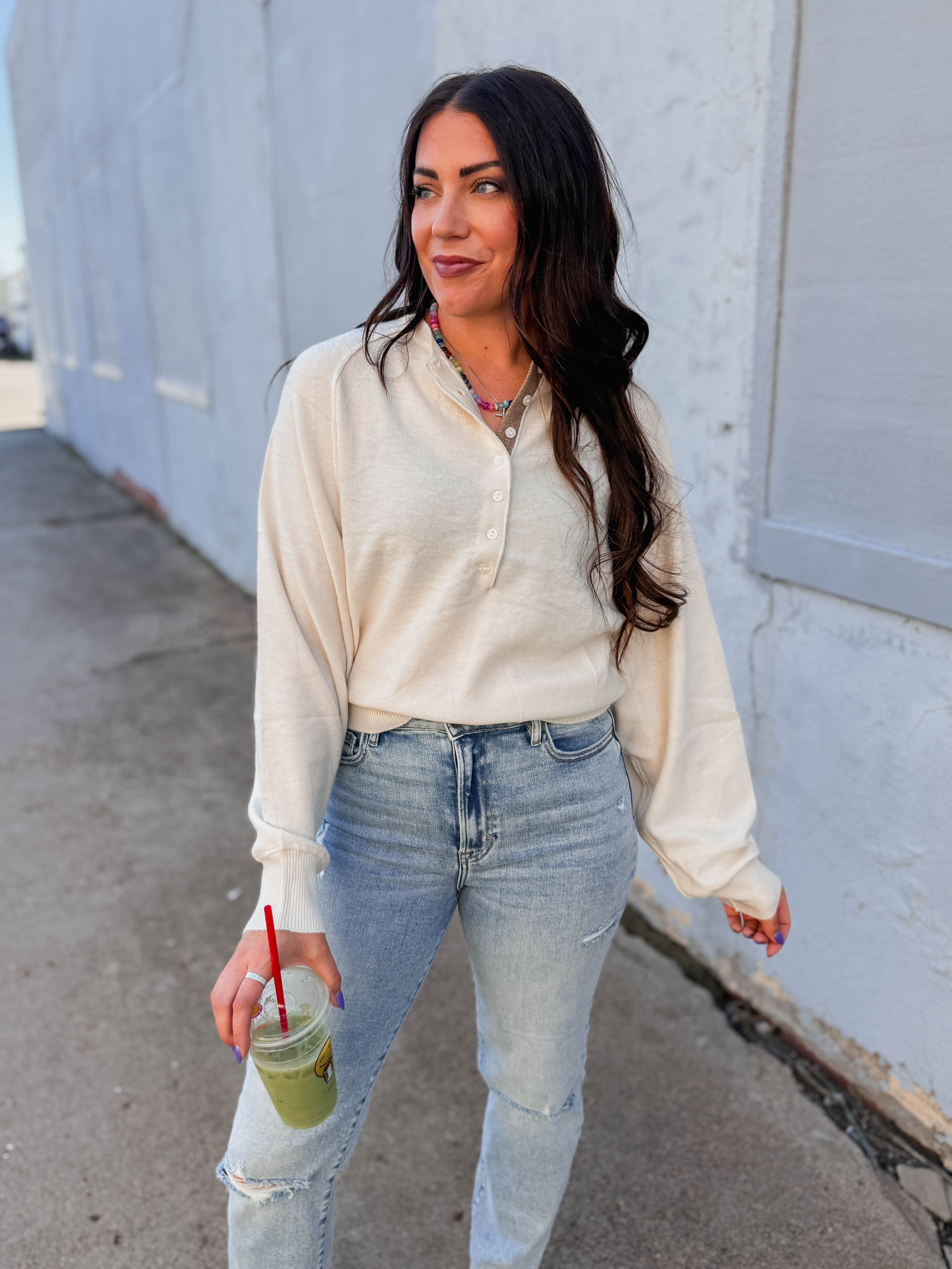 The Liliana Henley Sweater blends cozy comfort with effortless style. Featuring a classic Henley neckline with a half-button closure and ribbed hems, it’s perfect for breezy days. Long sleeves and a relaxed fit take you smoothly from work to weekend fun.