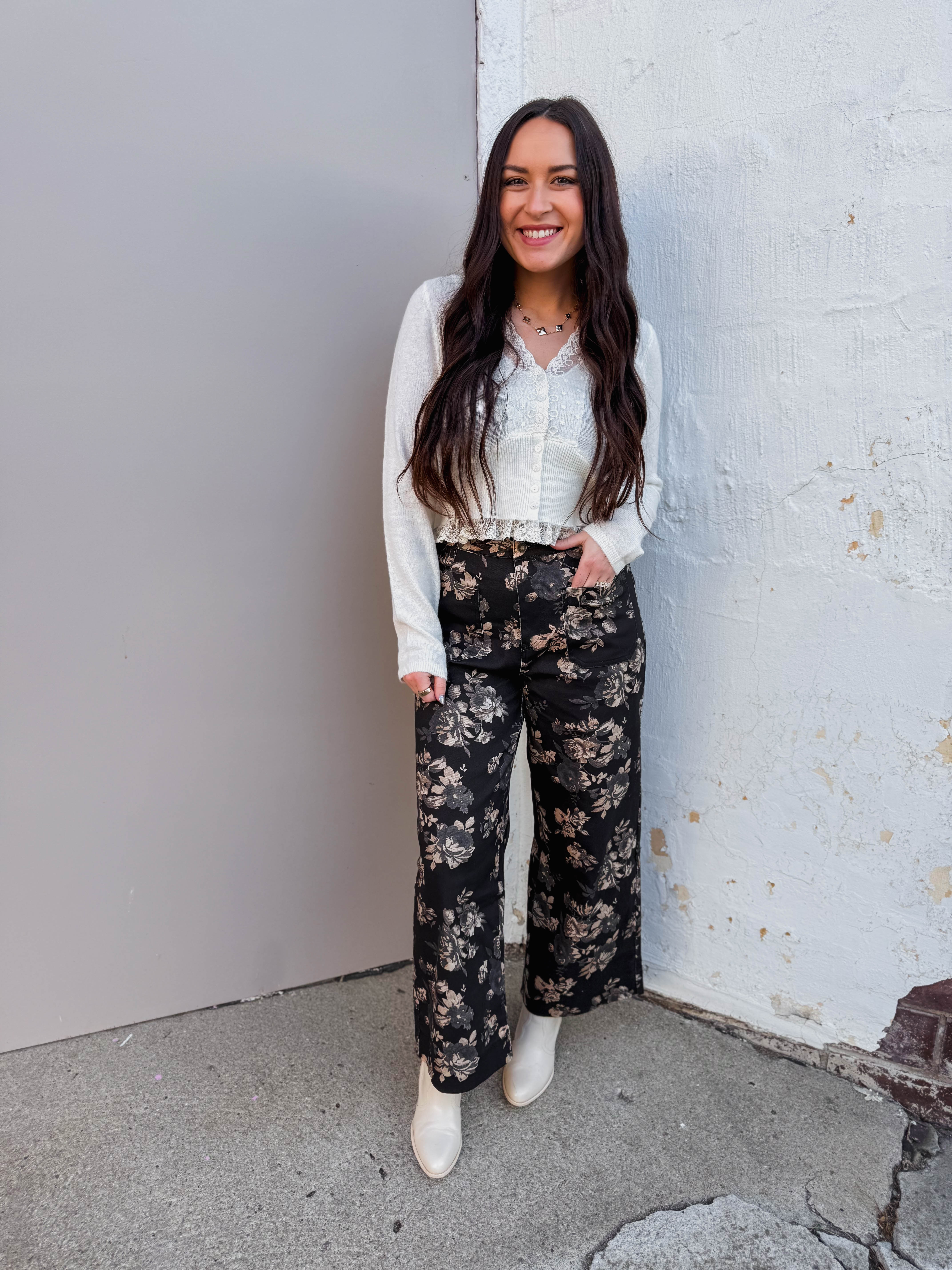 The Meadow Cardigan combines cozy comfort with playful boho charm. Featuring a flattering v-neckline, long sleeves, and delicate lace contrast, this button-front sweater is your new go-to for cute, feminine style all season long.