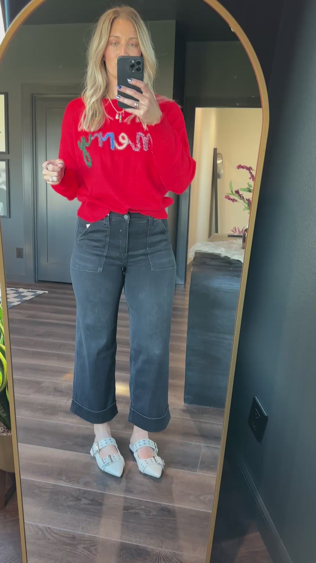 Celebrate the season in style with the Merry Tinsel Sweater. Featuring a fun “Merry” tinsel graphic, cozy crew neckline, and long sleeves, it adds a subtle pop of festive color perfect for spreading holiday cheer.