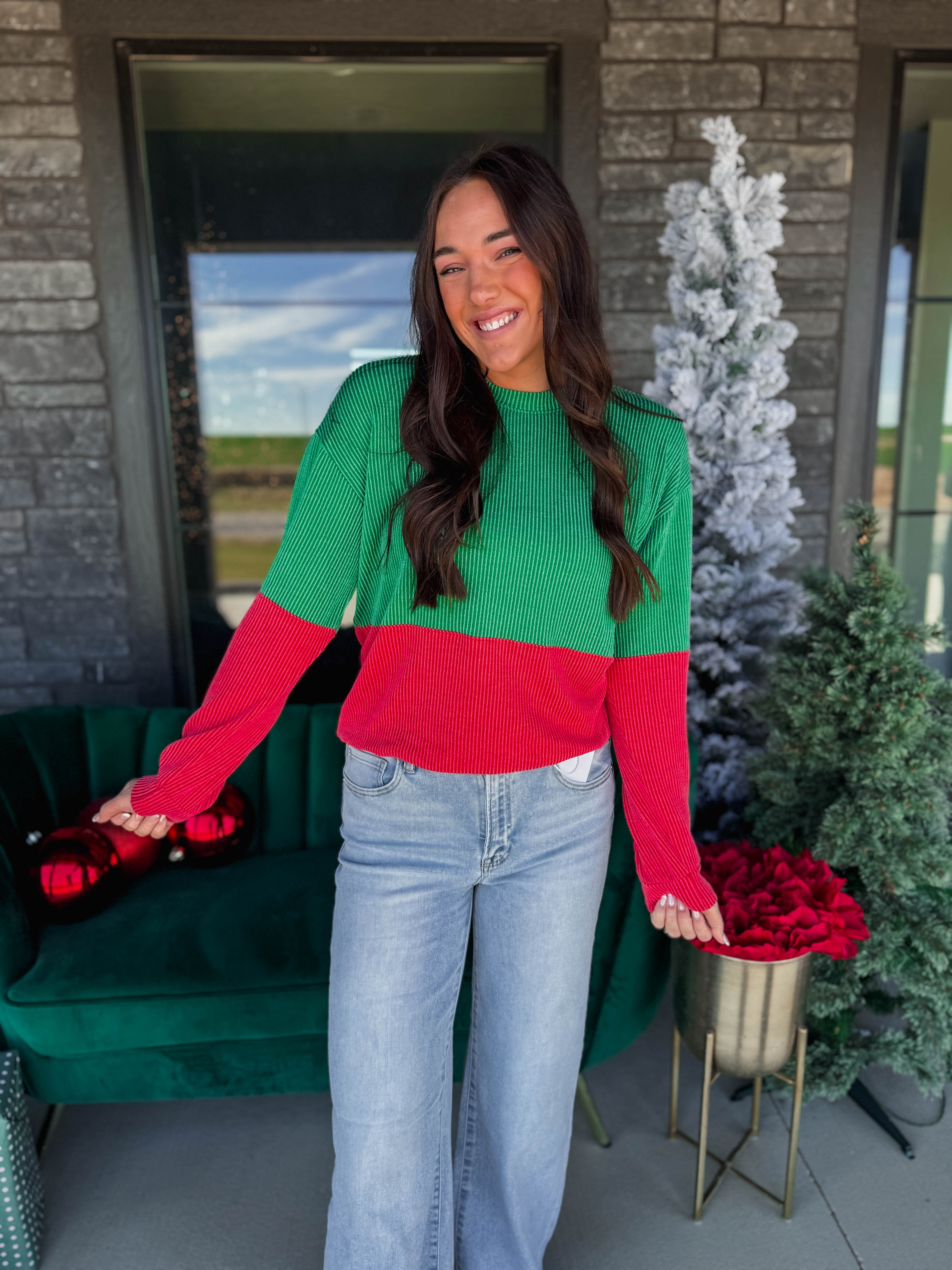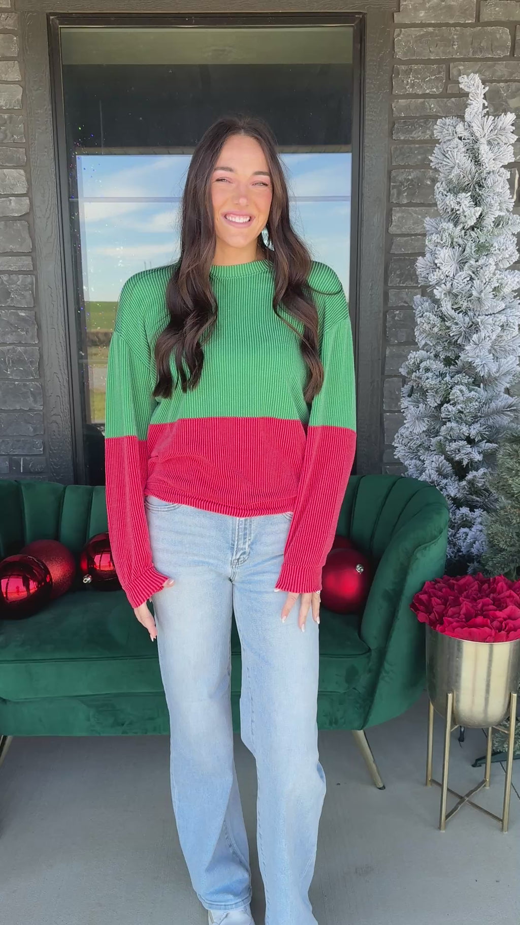 This festive pullover features a cozy corded knit with a playful color-blocked design in red tones. With a comfy round neckline and long sleeves, it’s the perfect cute top to brighten your holiday season.