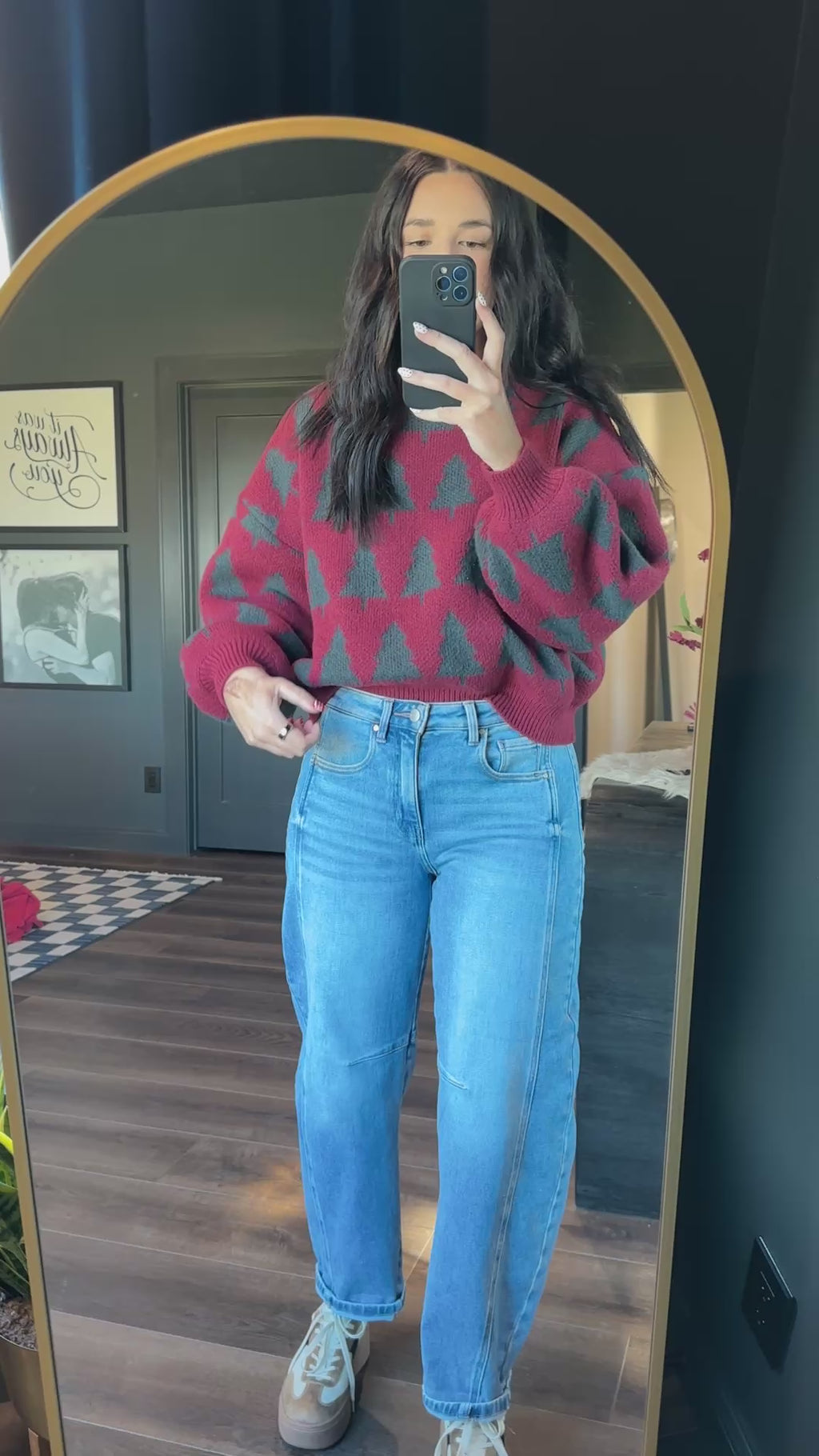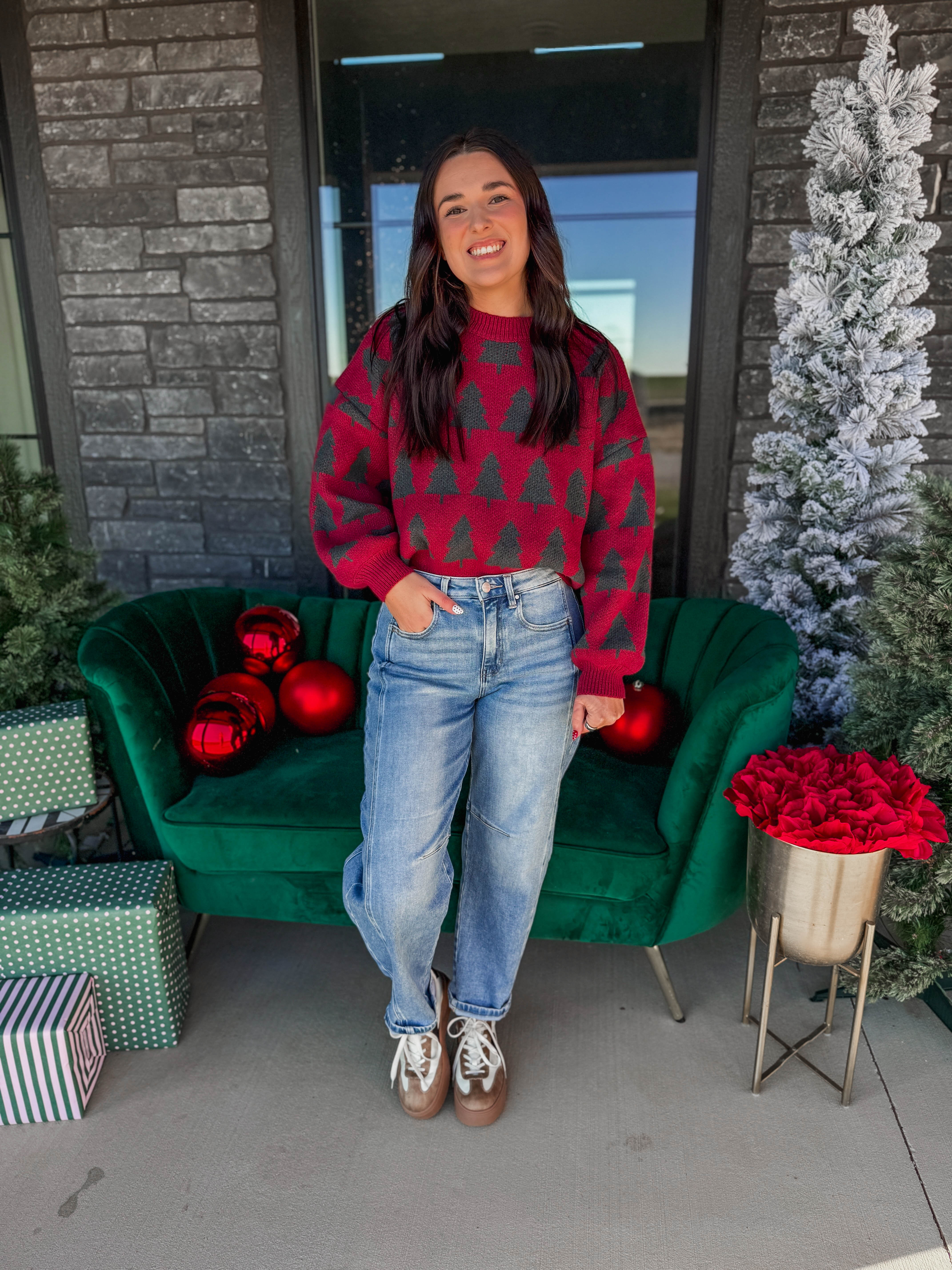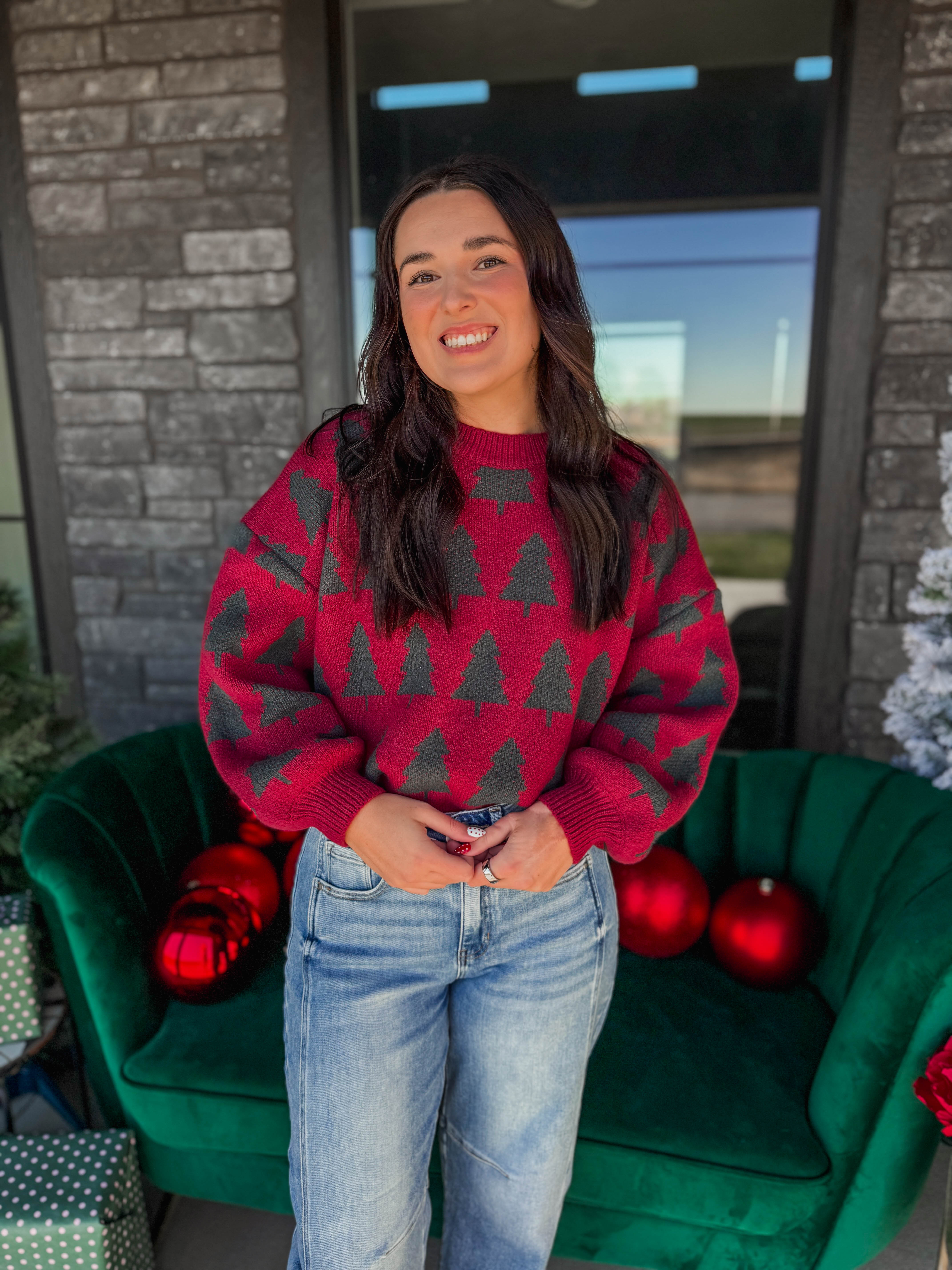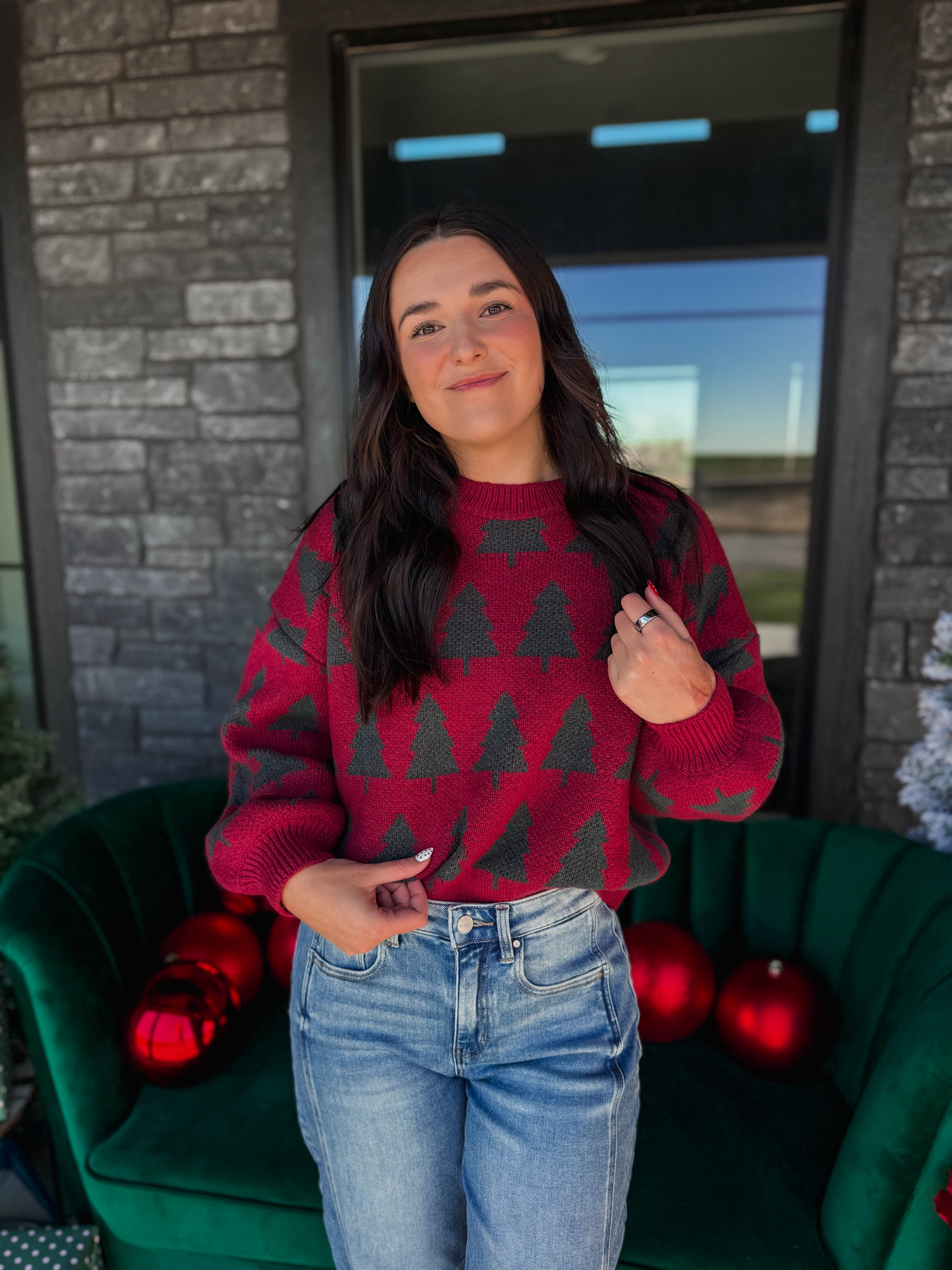 Stay cozy and festive in the Evergreen Dreams Sweater! Featuring a charming Christmas tree pattern, crew neckline, and snug ribbed hems, this pullover is perfect for holiday cheer. Long sleeves keep you warm while spreading merry vibes all season long.