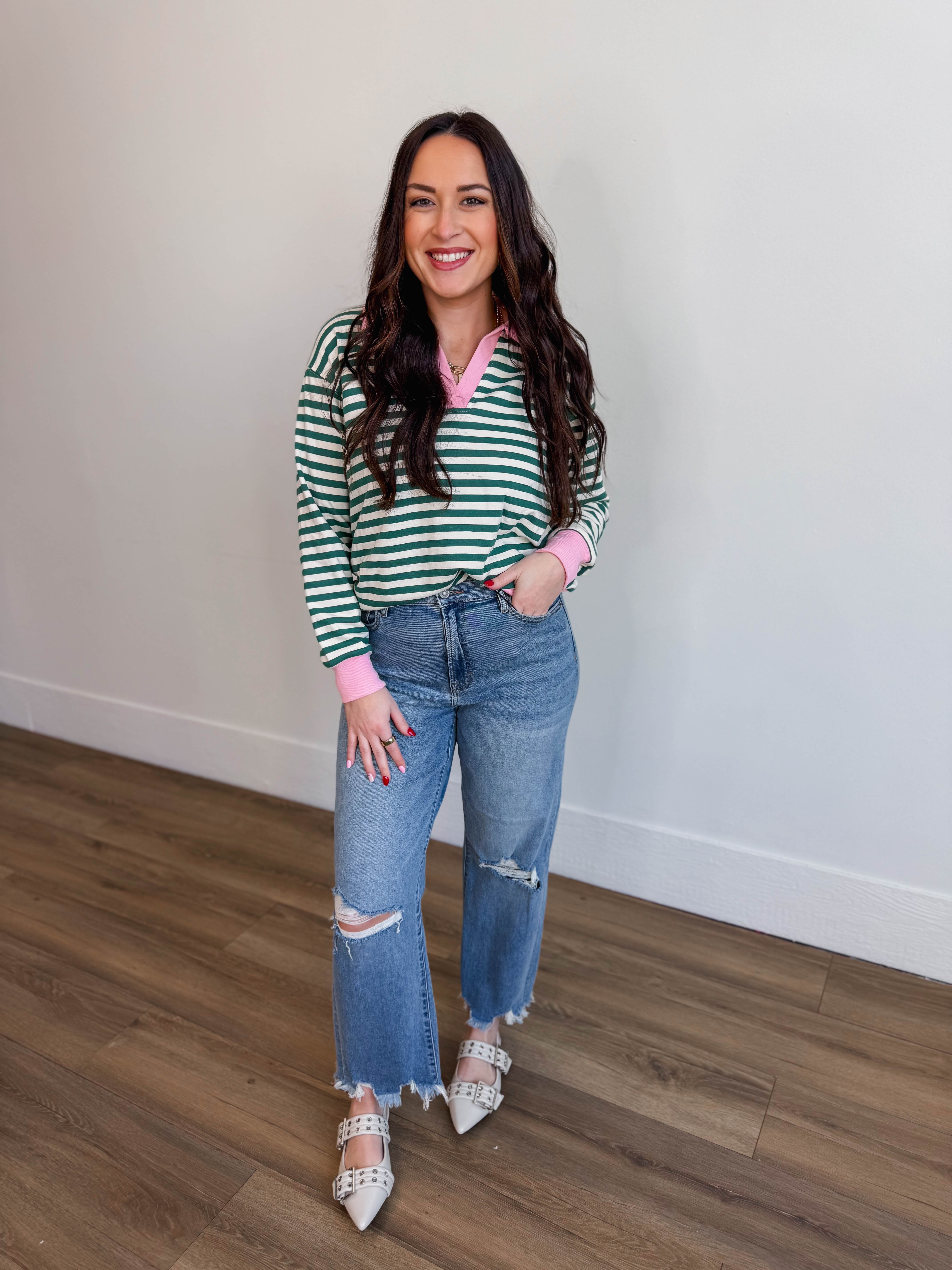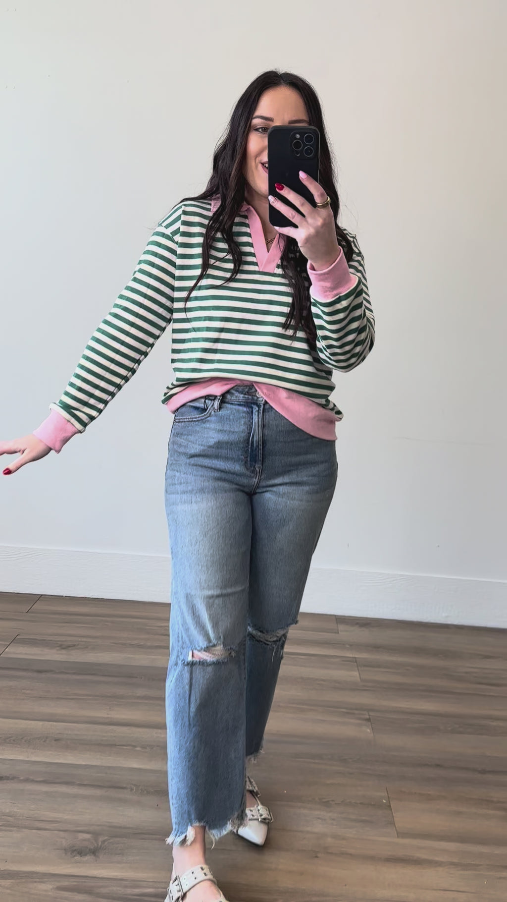 Throw on the Kami Striped Pullover and go from office to coffee shop in style. This pullover sweatshirt features a classic polo collar, long sleeves, and a bold striped pattern with contrast trim that adds just the right splash of personality. Versatile enough for work, fun enough for the weekend.