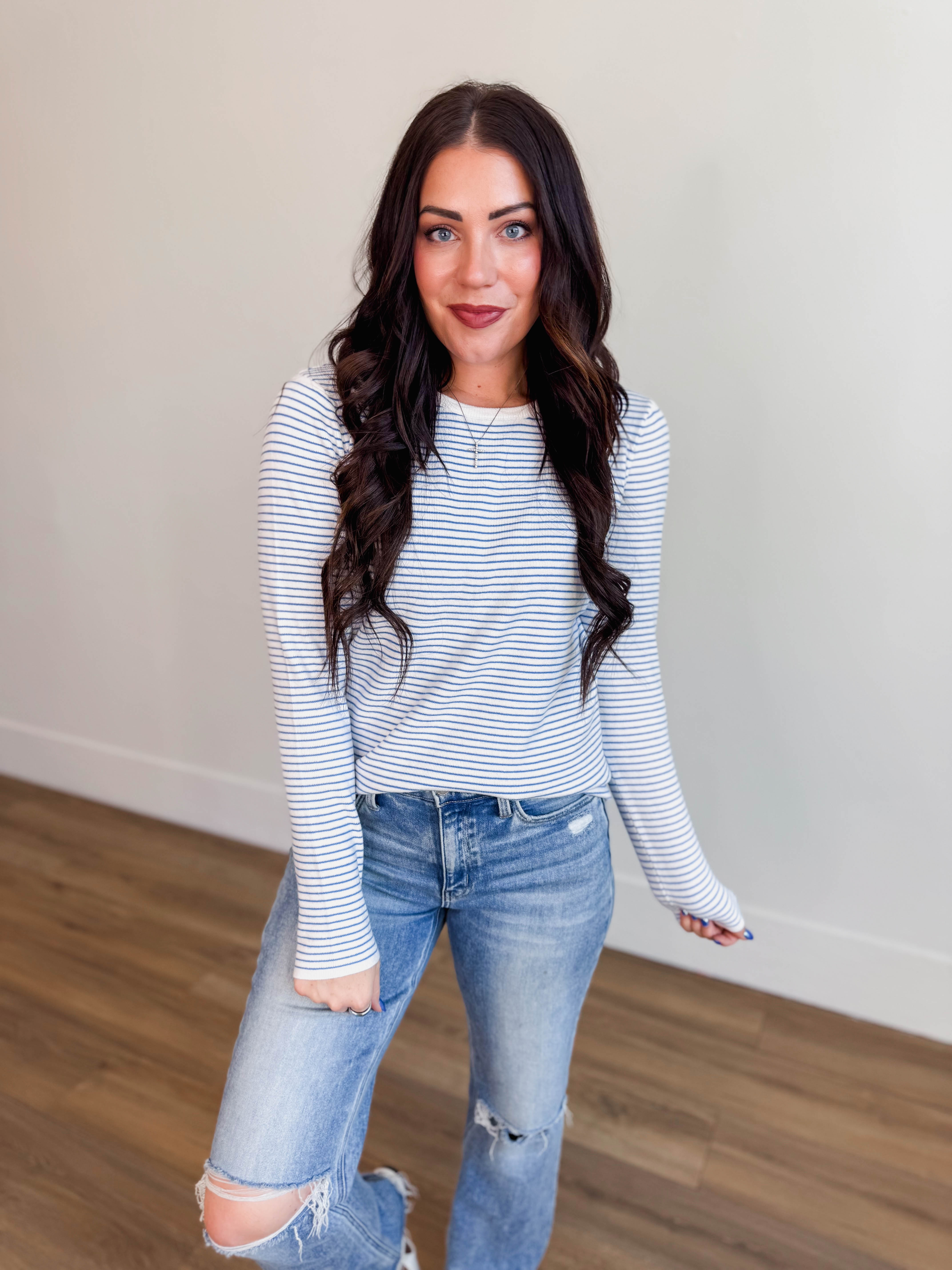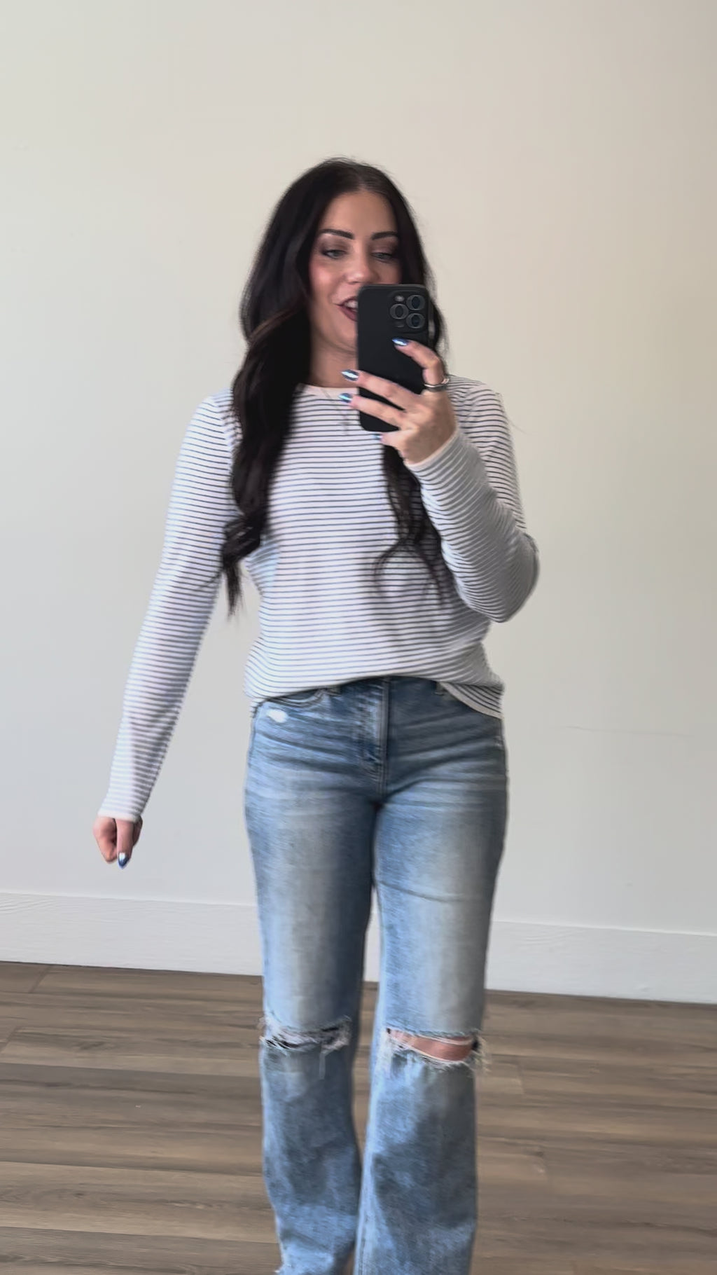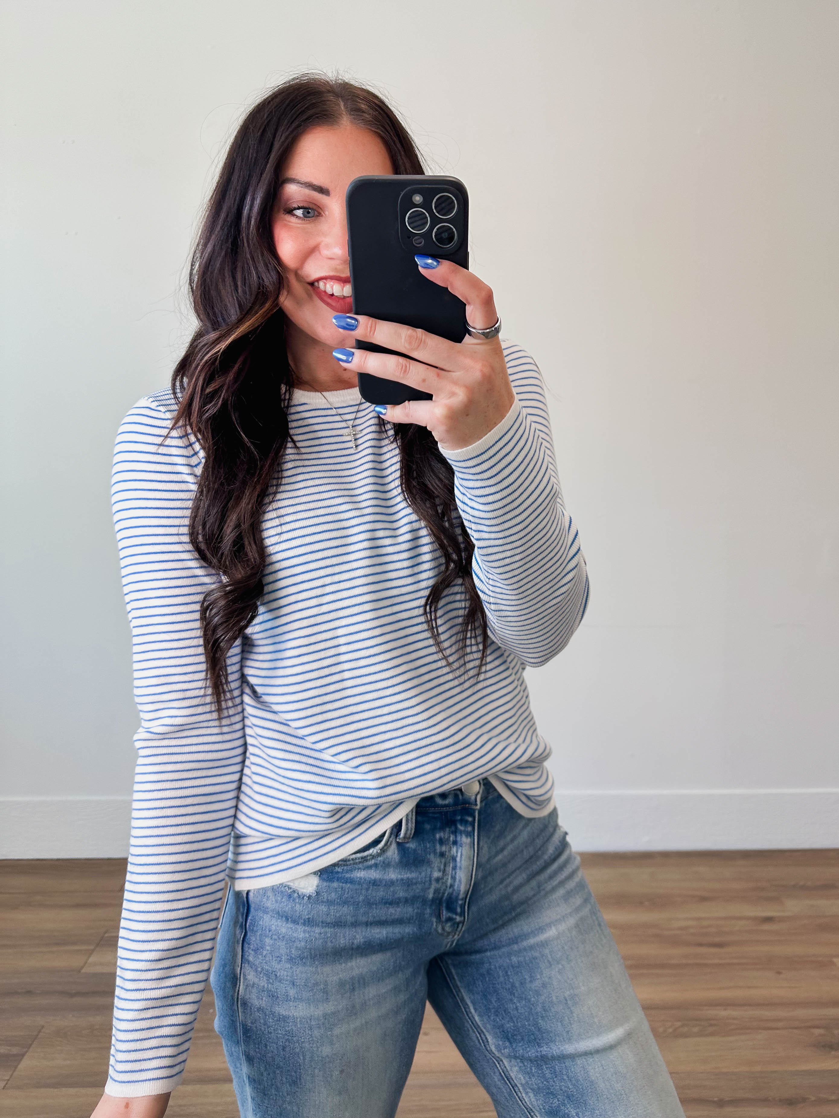 The Kerri Striped Sweater features a cozy crew neckline and long sleeves, perfect for layering from work to weekend. Its classic fit and subtle pinstripes add a playful twist to your everyday look. Easy to wear, hard to resist!