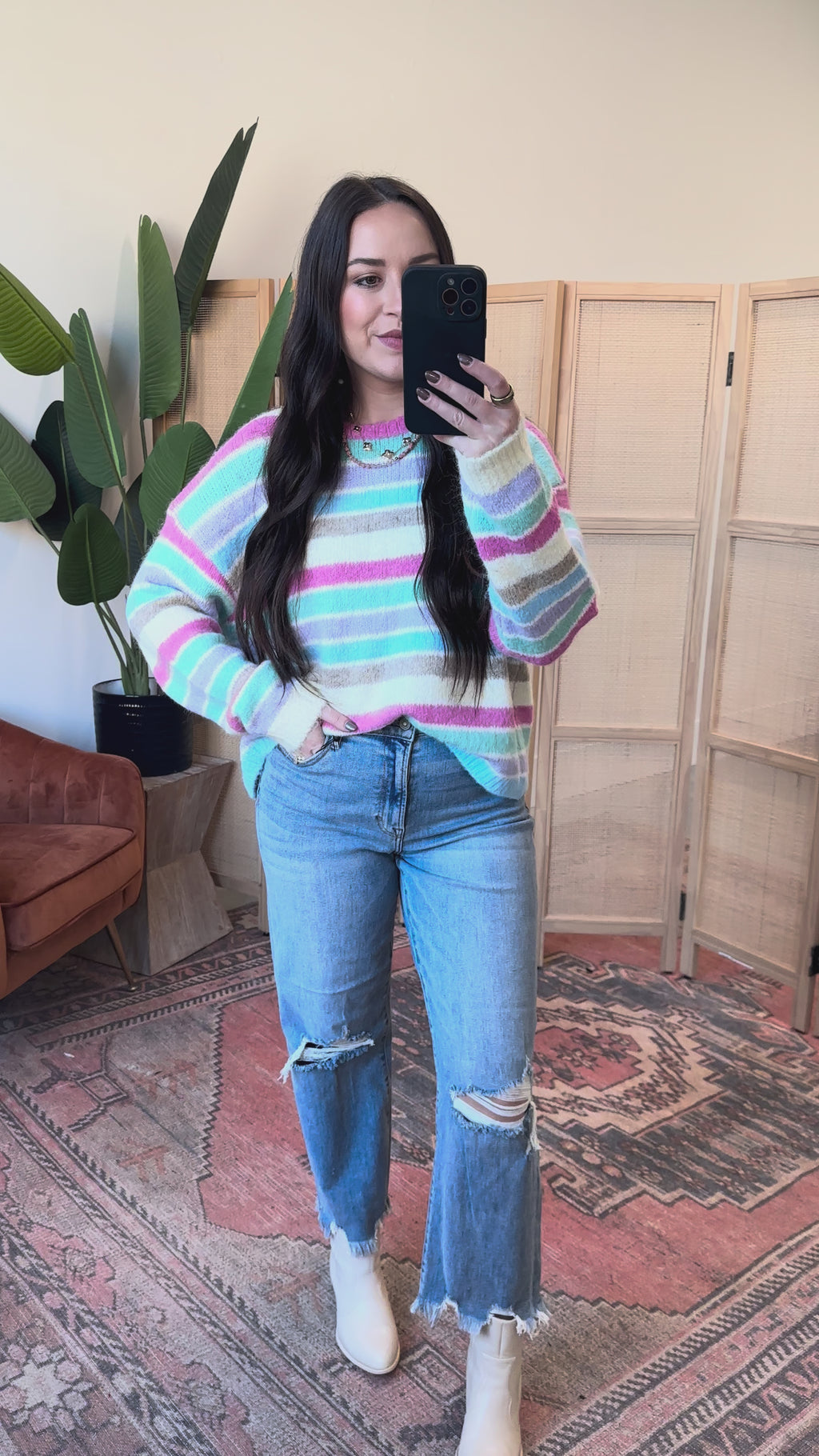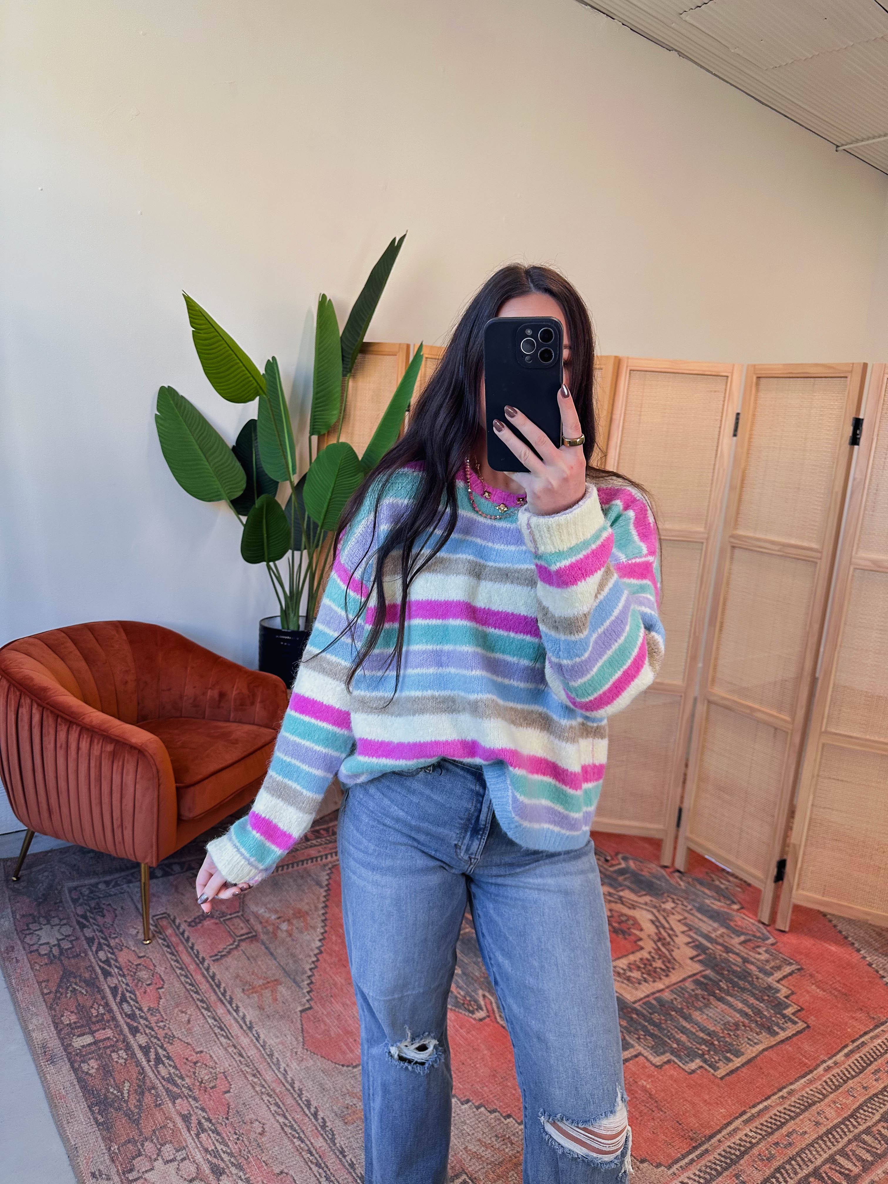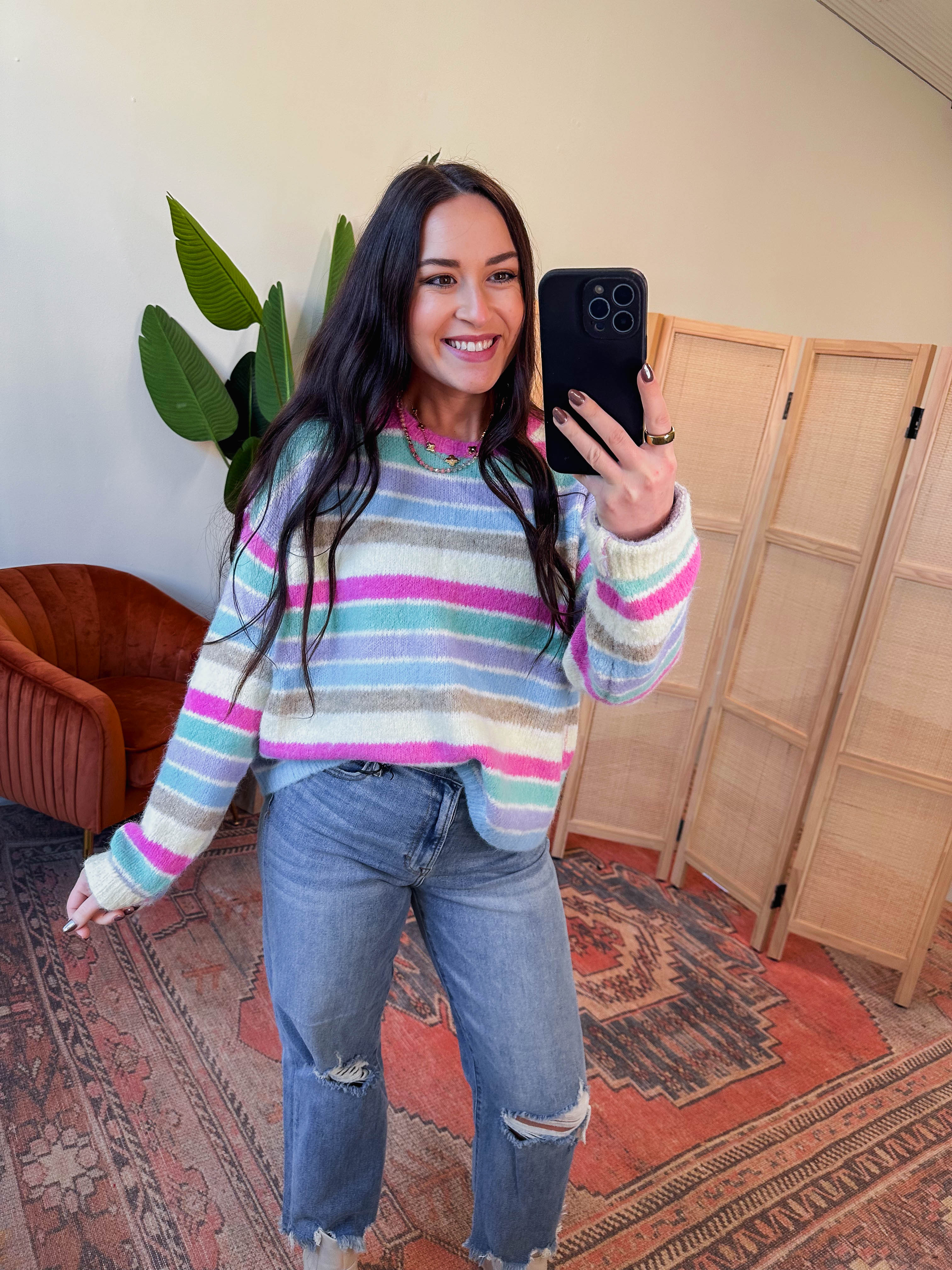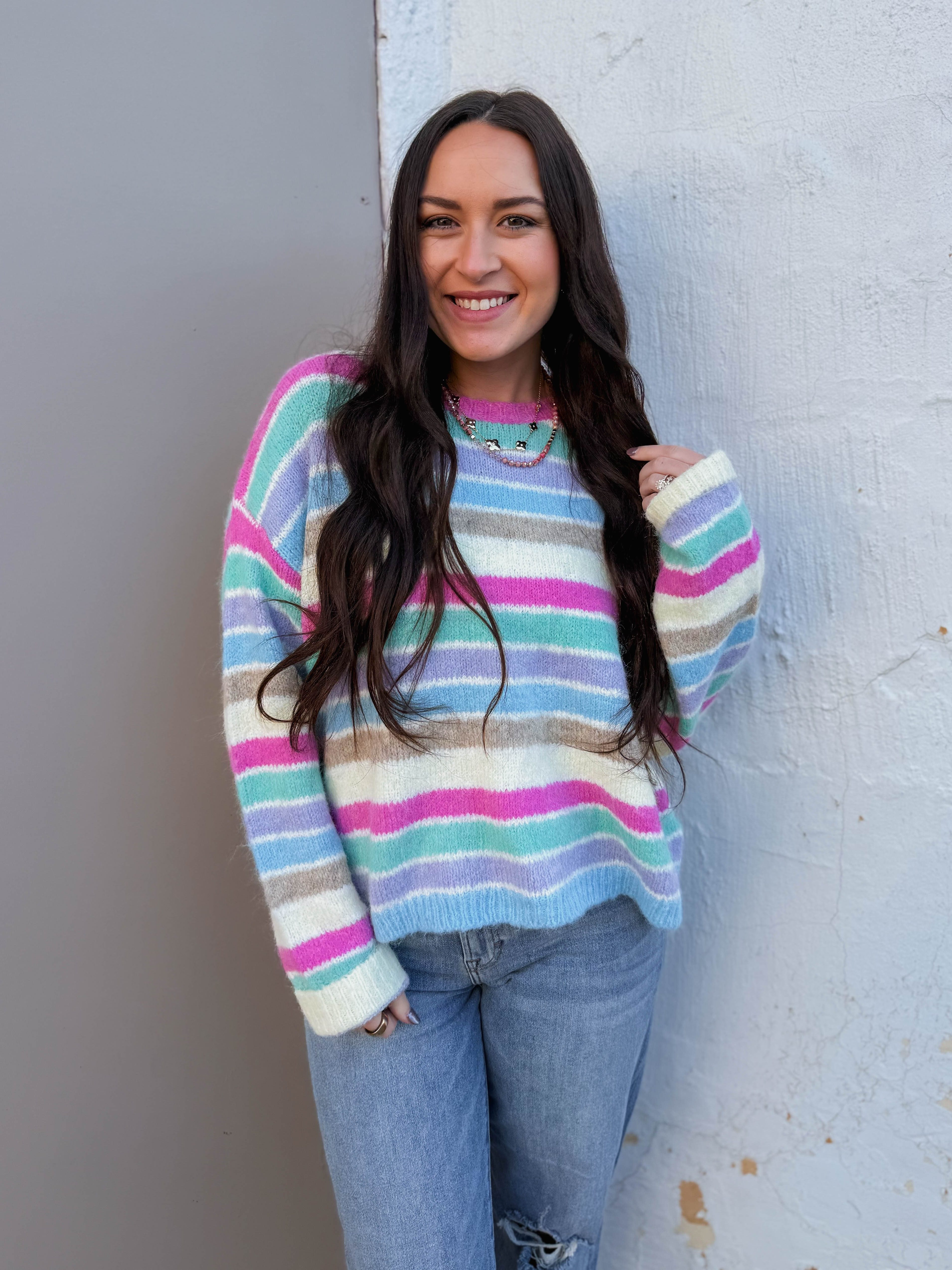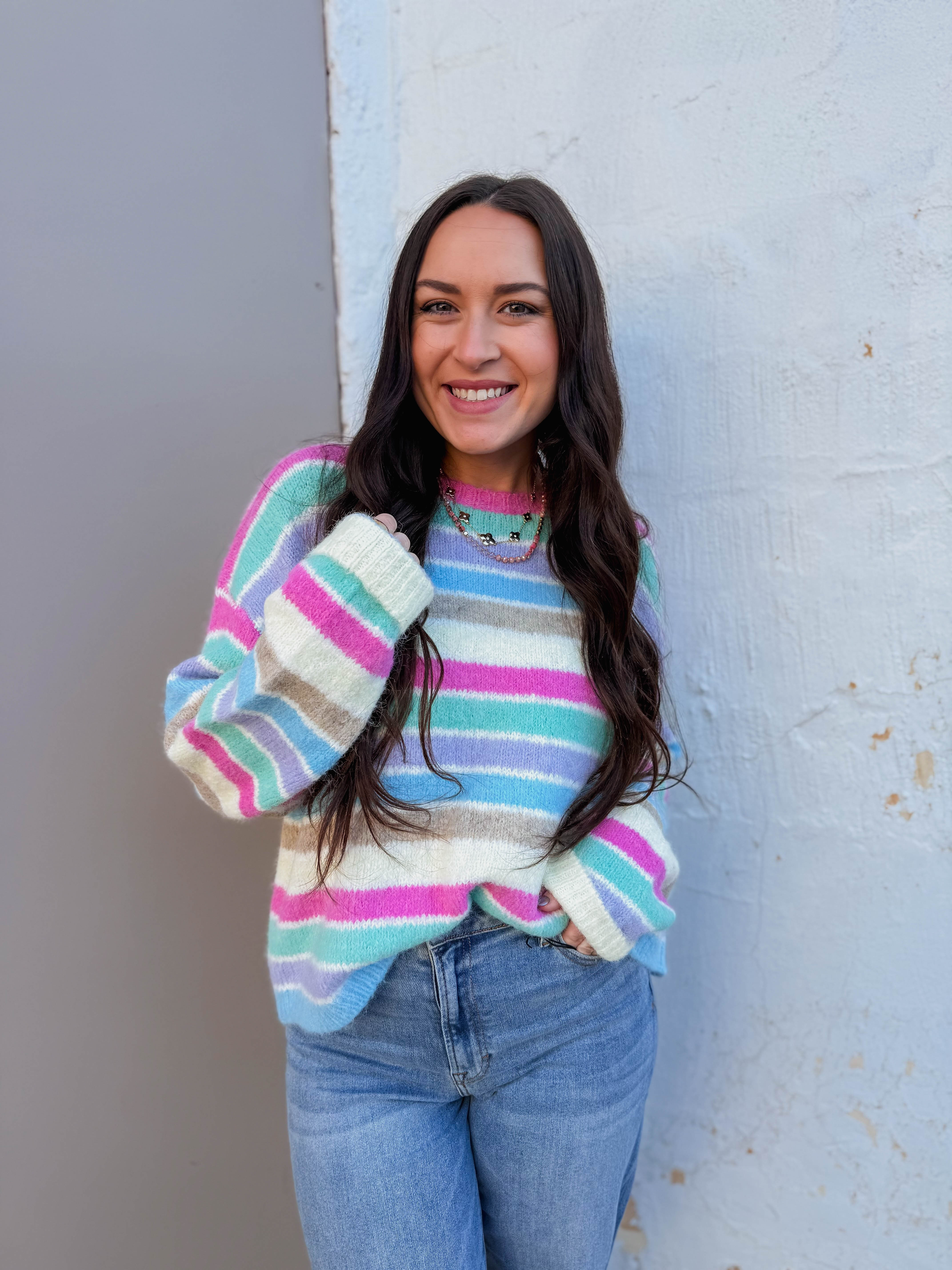 Effortlessly transition from office to weekend in the Kollins Striped Sweater. Featuring a classic crew neckline and long sleeves in a soft brushed knit, the multicolor stripes add just the right pop of personality. Cozy enough for casual days, polished enough for work—your new go-to layer for any occasion.