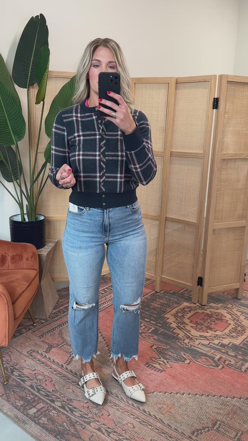 The Monica Cardigan is your go-to for easy style with a playful twist. Featuring a cozy round neckline, comfy long sleeves, and a button-front closure, its classic plaid print adds charm from workdays to weekends. Effortless layering has never looked this fun!