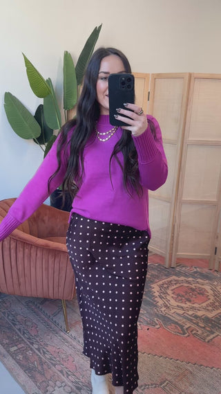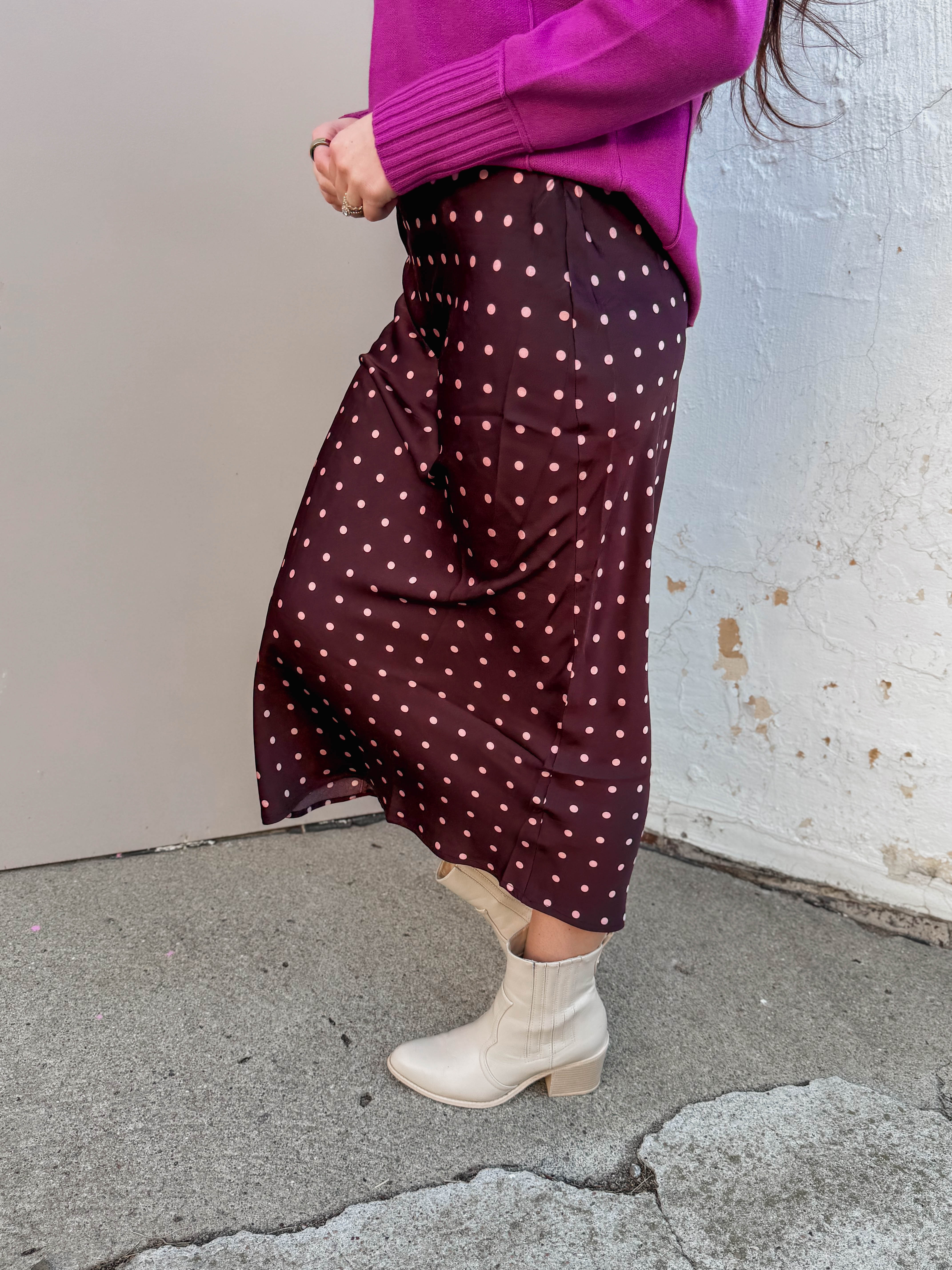Step out in style with the Spot On Midi Skirt! This high-waisted satin beauty features a playful polka dot pattern and a flirty flare hem. Perfect for workdays or weekend fun, it effortlessly dresses up or down to match your mood.