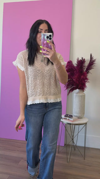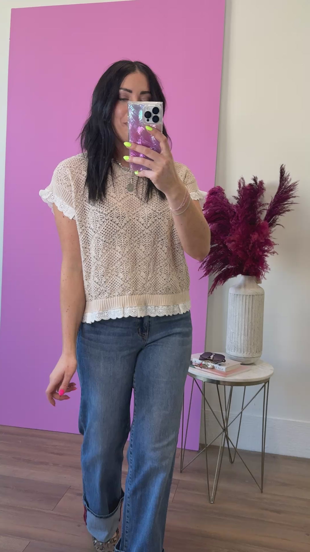Showcase delicate details with this crochet knit top featuring charming eyelet trim and short sleeves. The intricate crochet texture adds visual depth and bohemian appeal, while the eyelet detailing brings a feminine touch. Breathable and lightweight, it's ideal for warm weather layering or wearing solo. A versatile piece that effortlessly elevates casual and dressed-up looks alike.