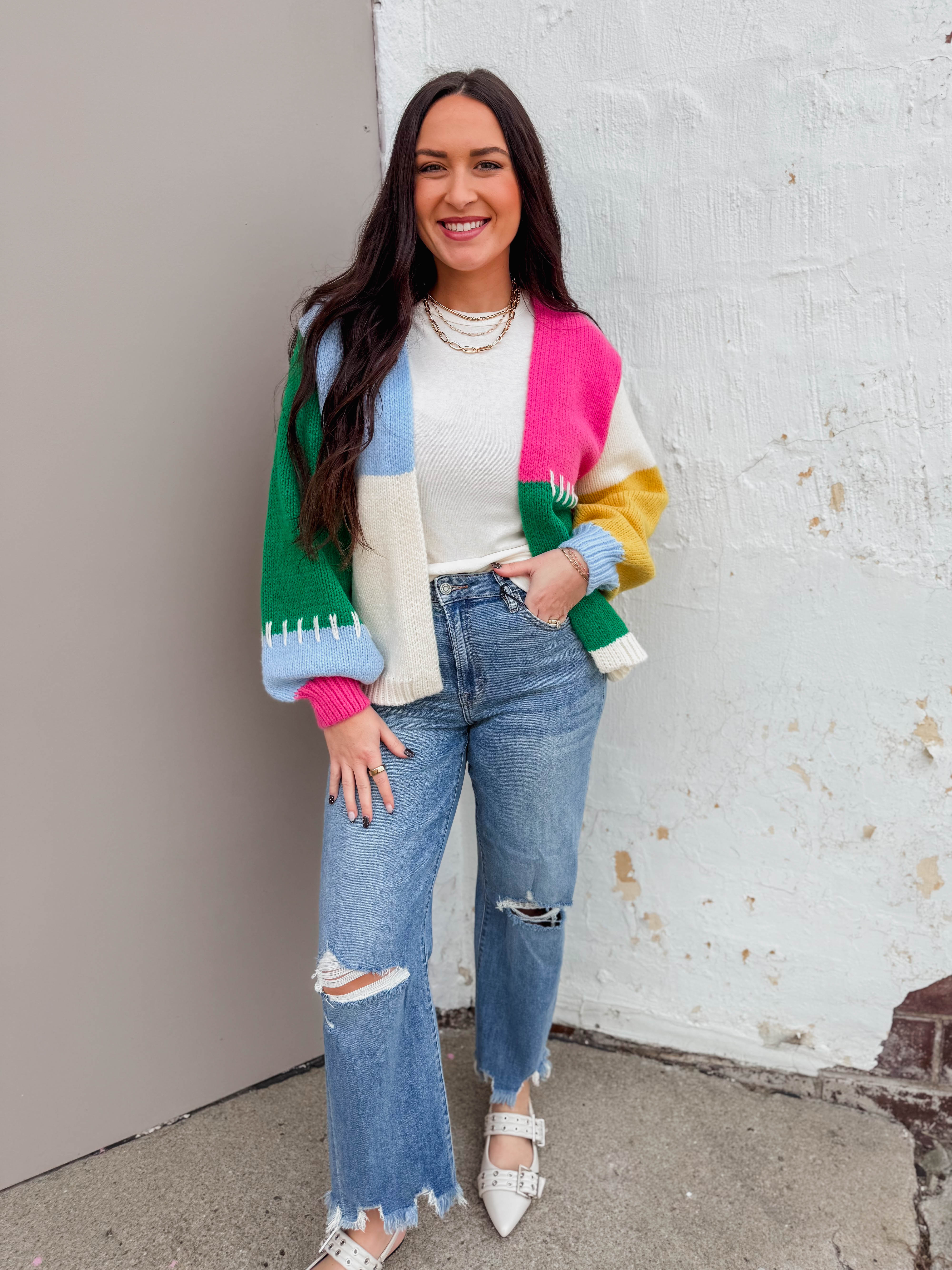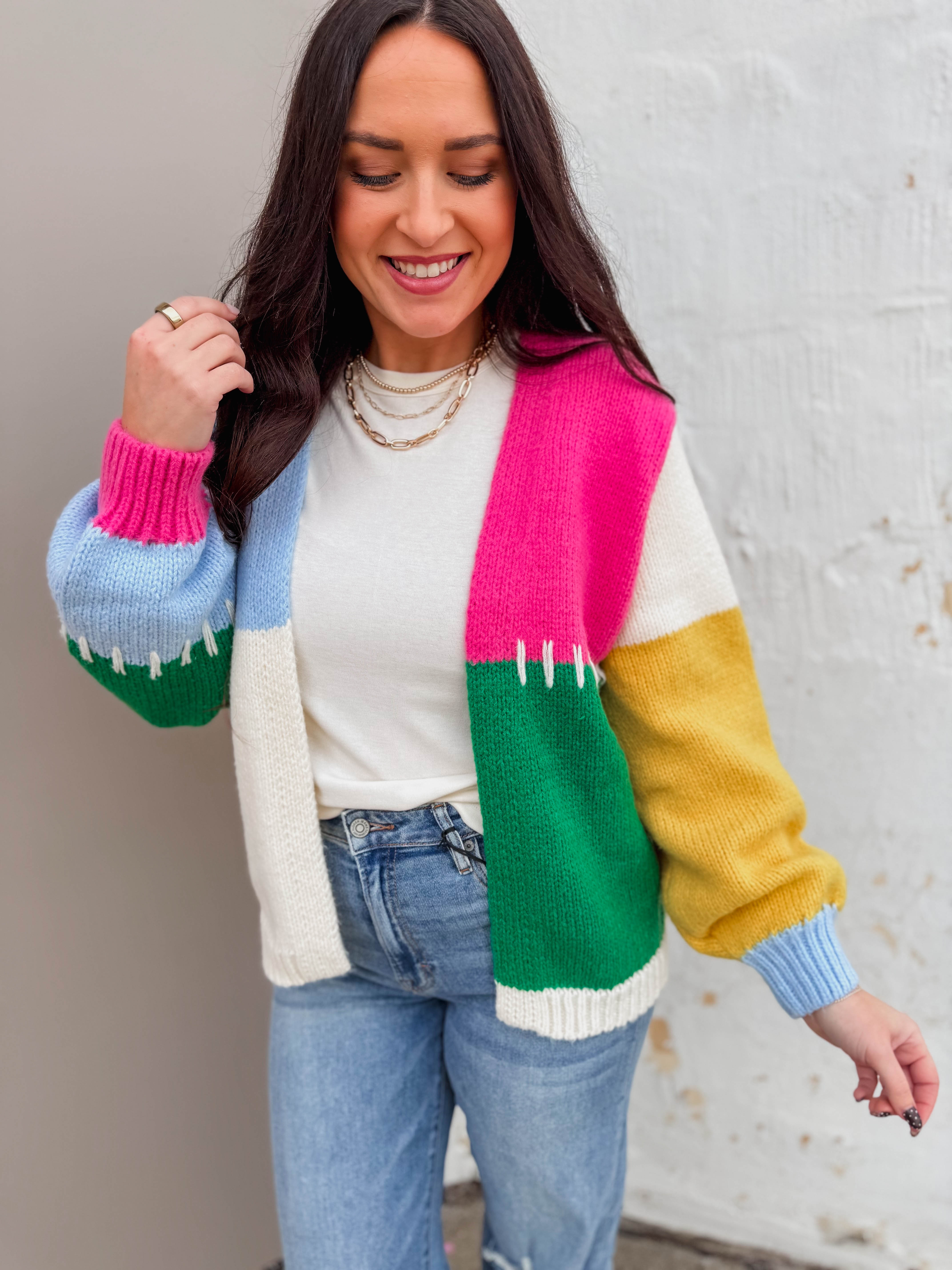 Add a fun pop of color to any look with the Jade Color Block Cardigan. Featuring an open front, long sleeves, and playful stitch detailing, it's perfect for taking you from work to weekend in style.