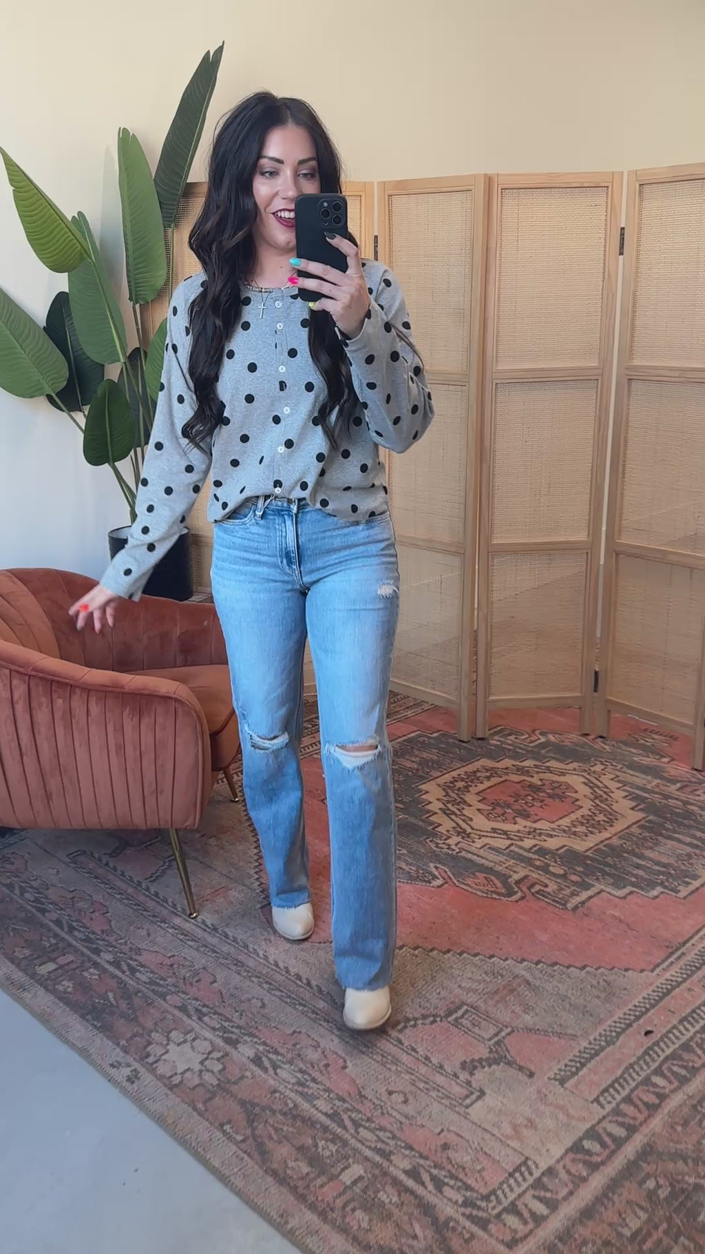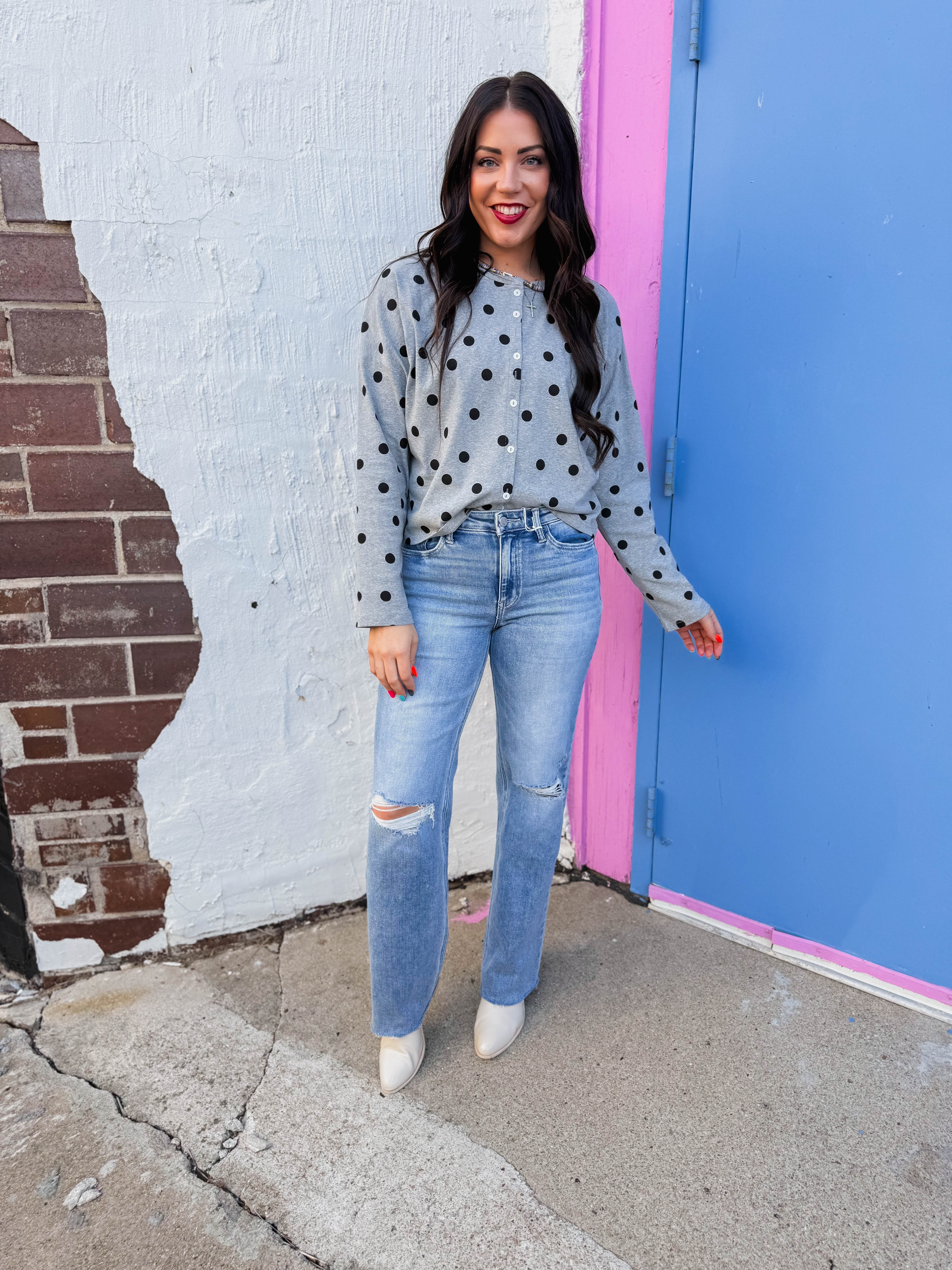 Effortlessly chic, the Sweet Spot Cardi transitions from office to weekend with ease. Featuring a classic round neckline, long sleeves, and convenient button-front closure, it's the perfect layering piece. The playful polka dot pattern adds a fun, trendy touch that keeps things interesting.
