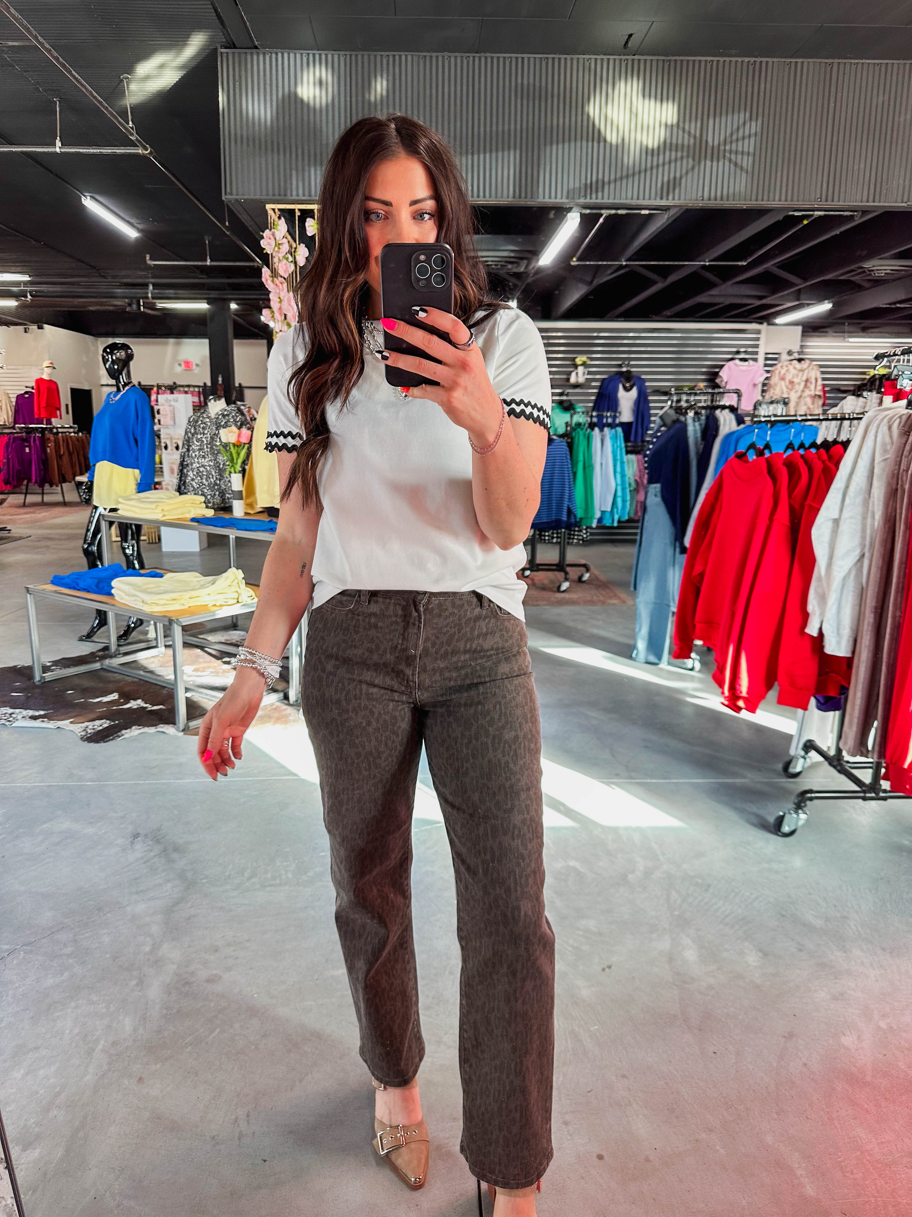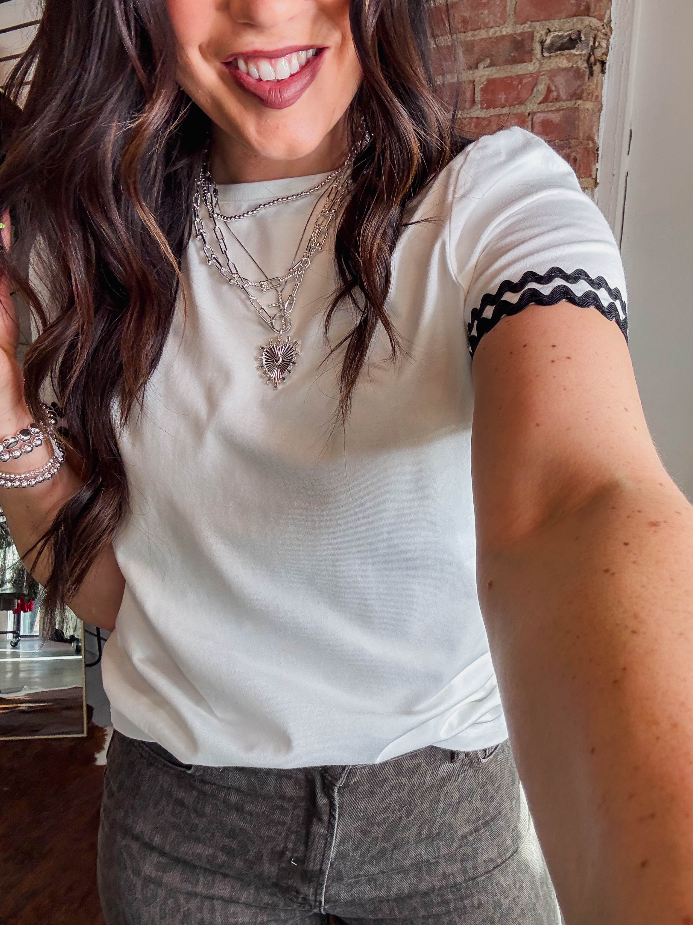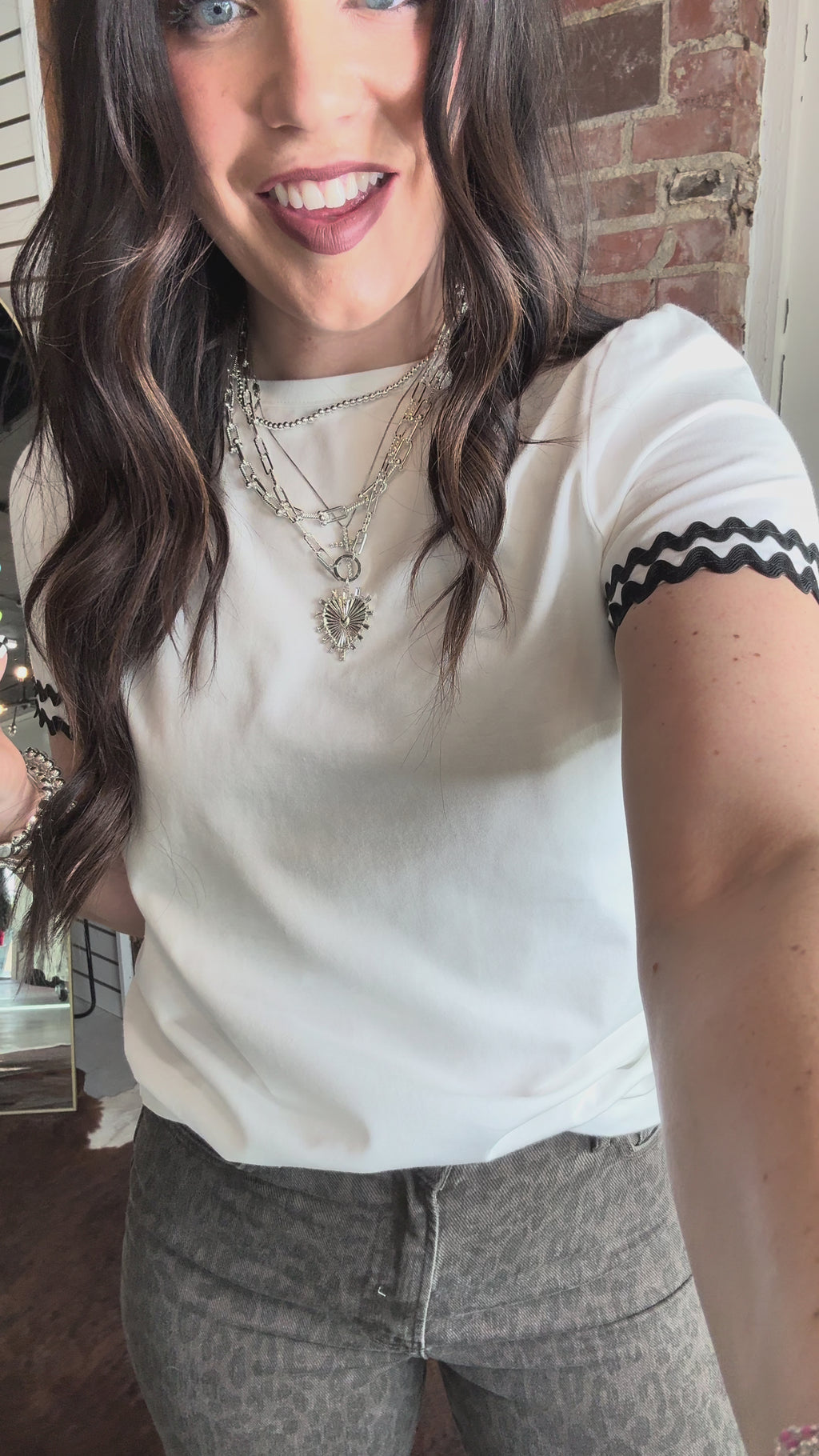 The Gwen Top is your go-to basic with a playful edge. Featuring a classic crew neckline and short sleeves, this everyday essential gets a fun twist with charming ric rac trim along the cuff hem. Perfect for effortless style that doesn't take itself too seriously.