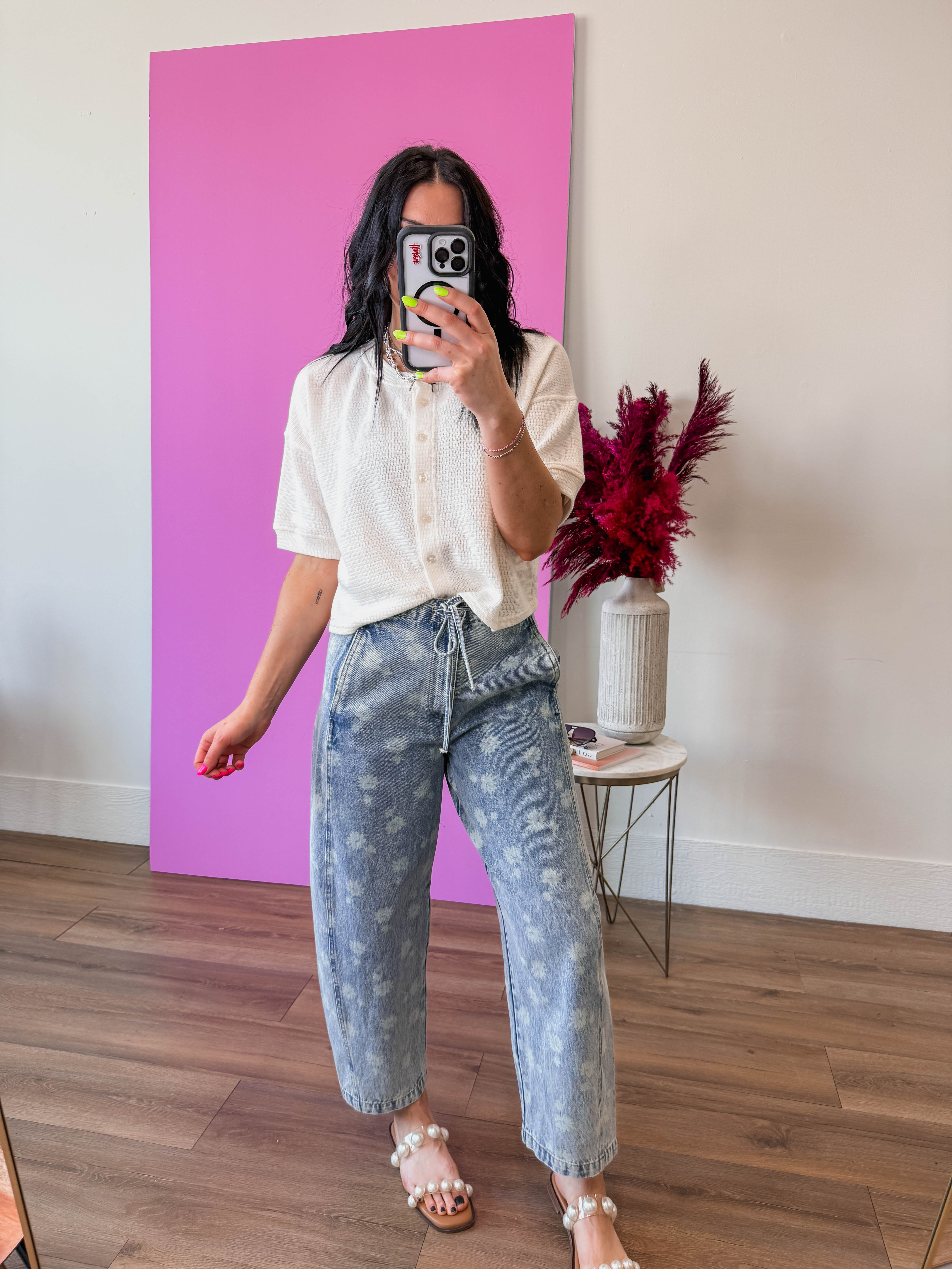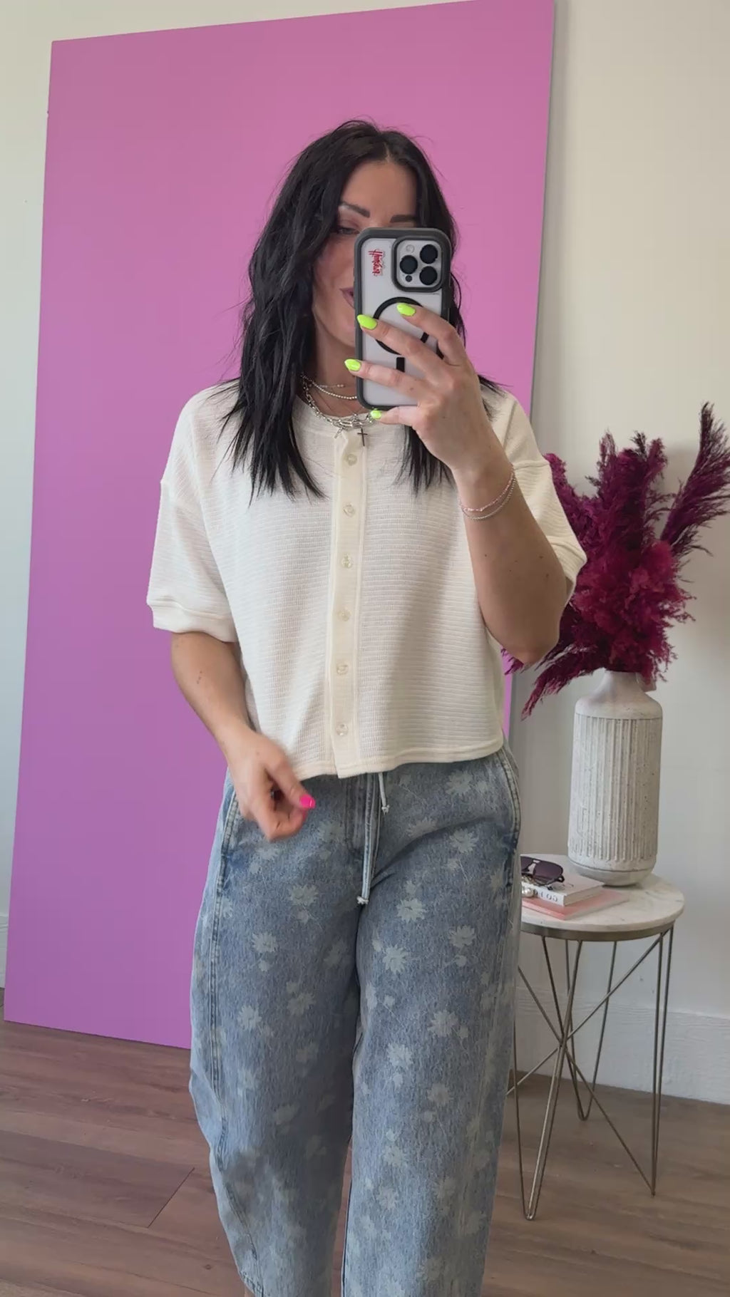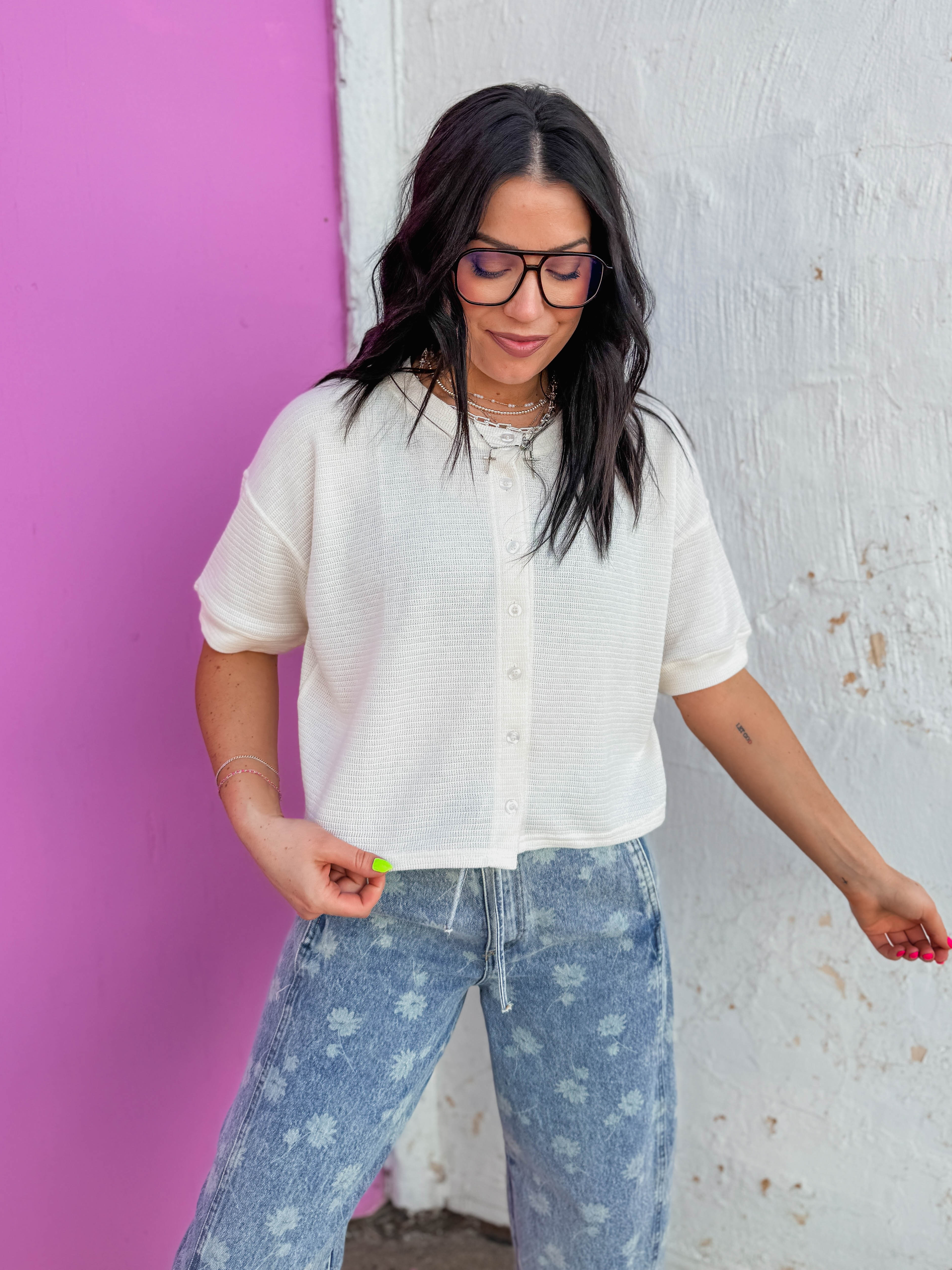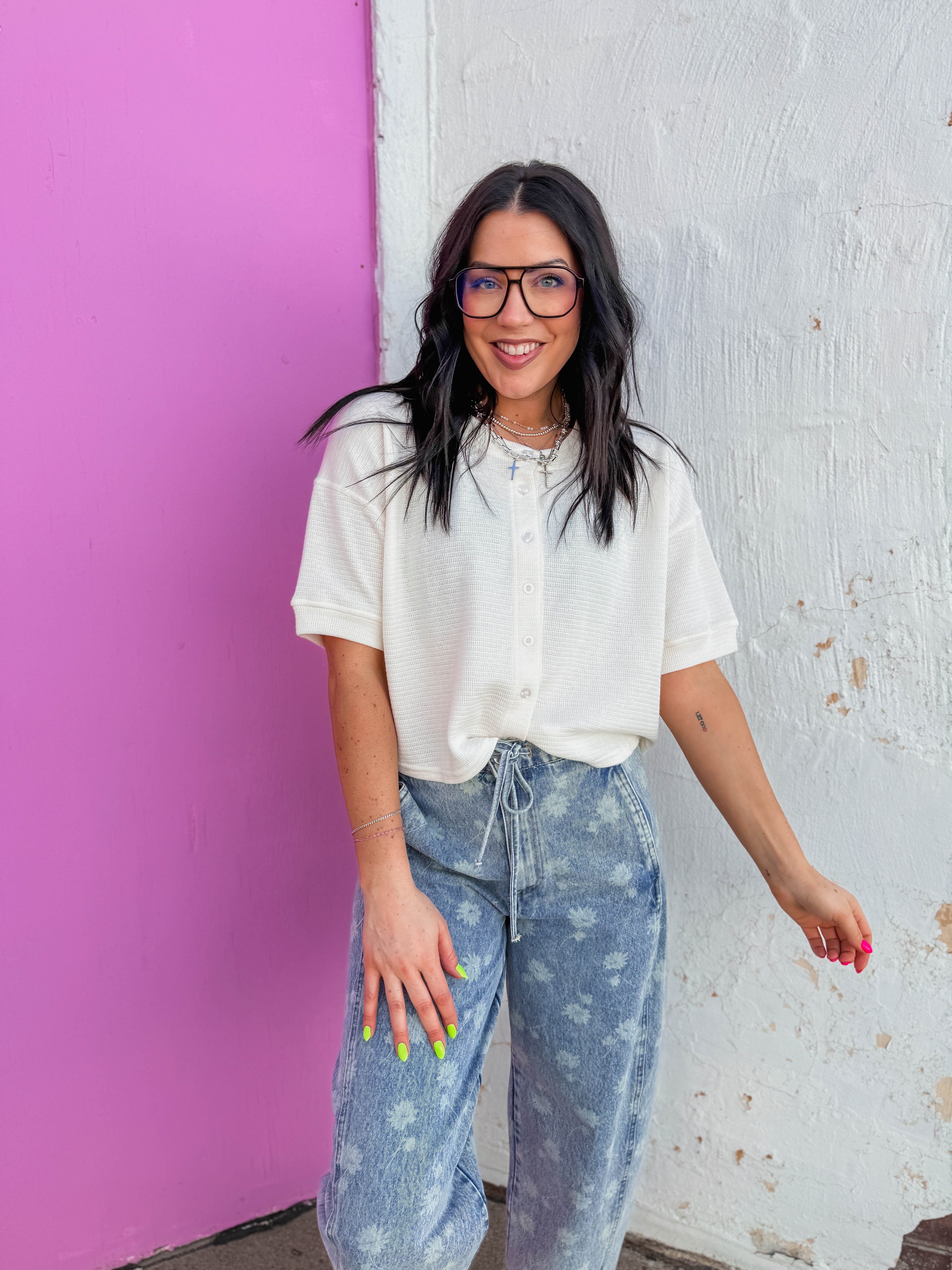 This versatile top combines the comfort of a classic tee with the functionality of a cardigan. The button front closure allows you to wear it open as a lightweight layer or buttoned up as a standalone piece, making it endlessly adaptable to any outfit. Soft and breathable, it's perfect for layering over basics or pairing with your favorite bottoms.