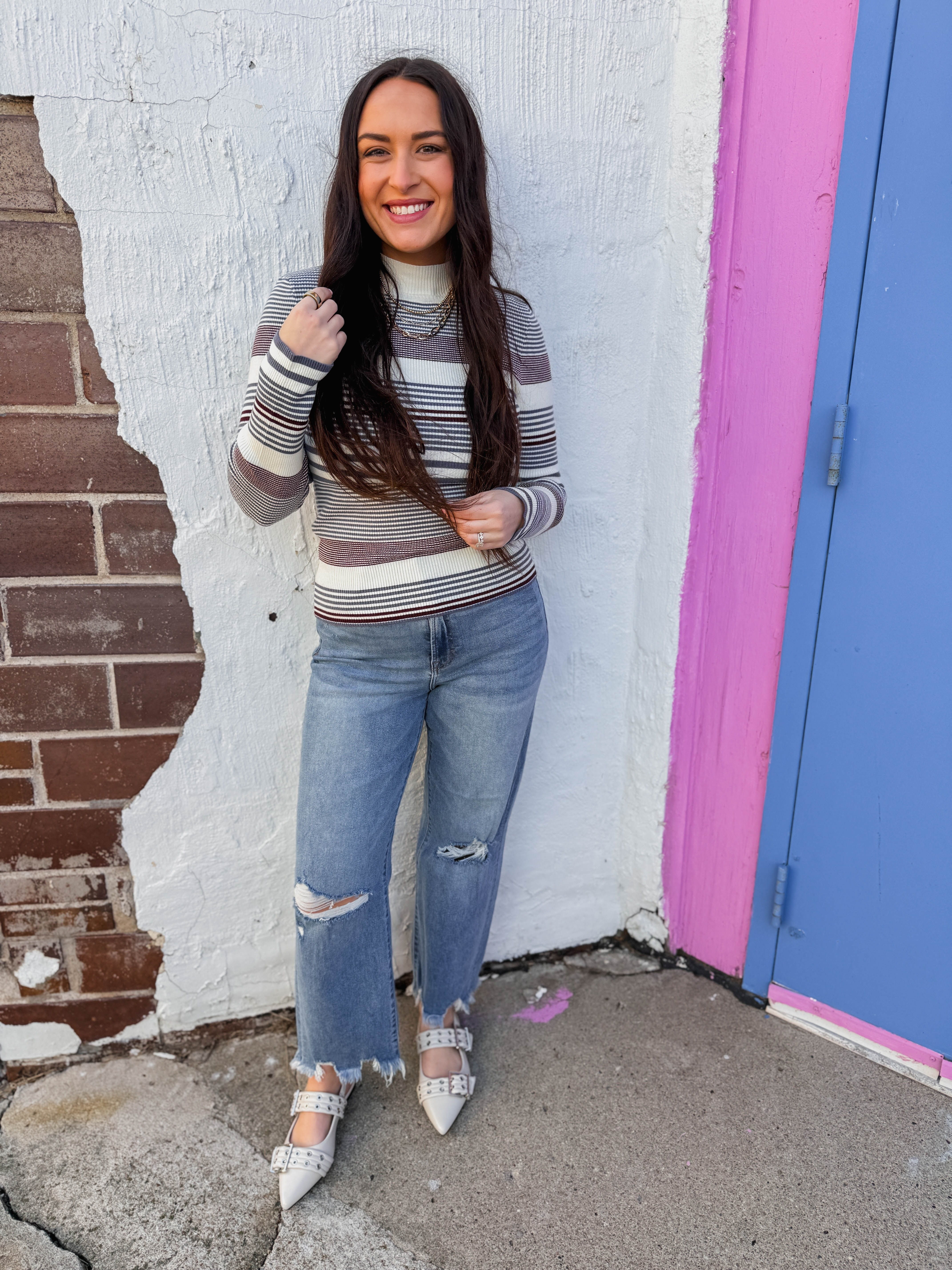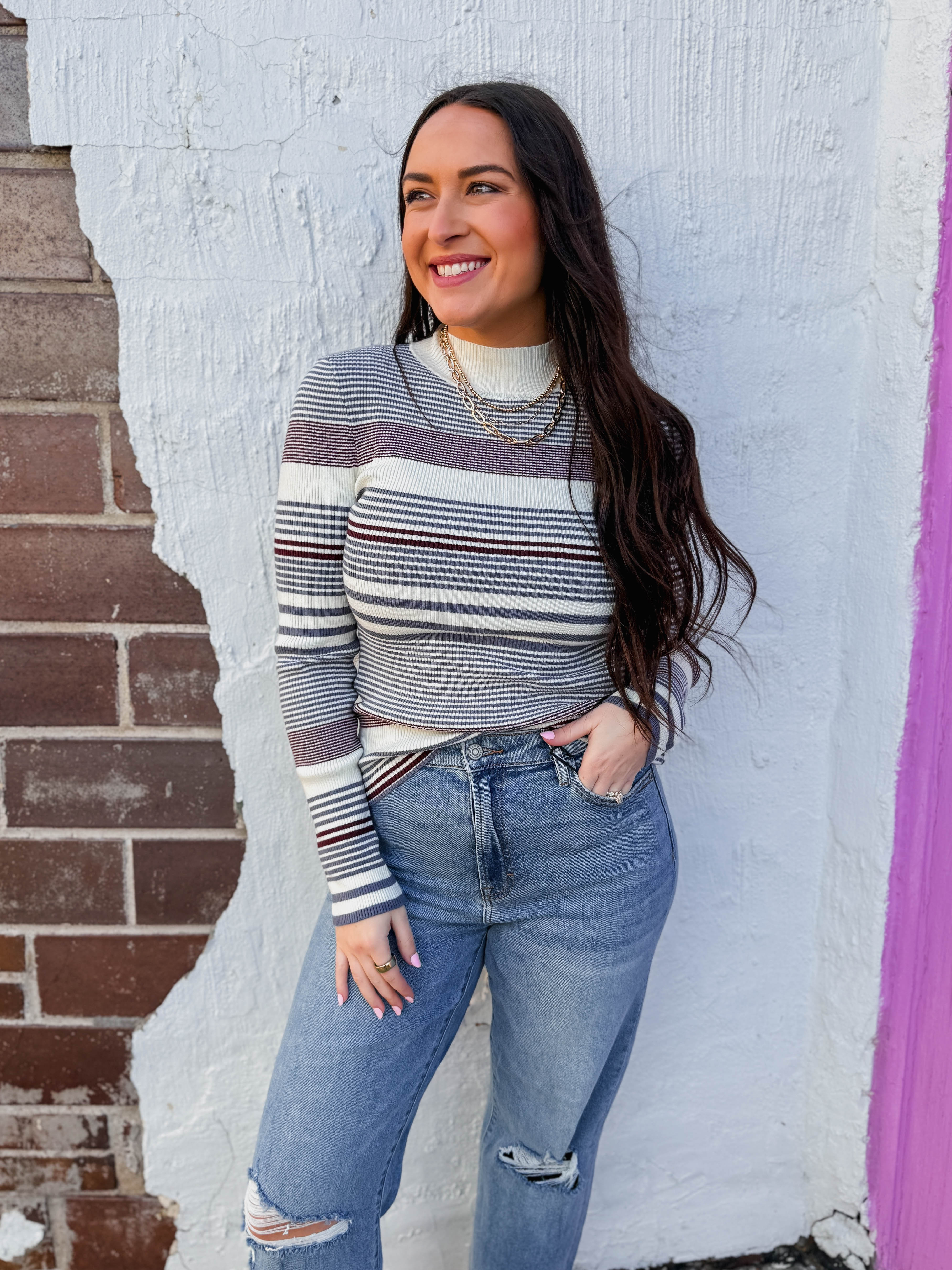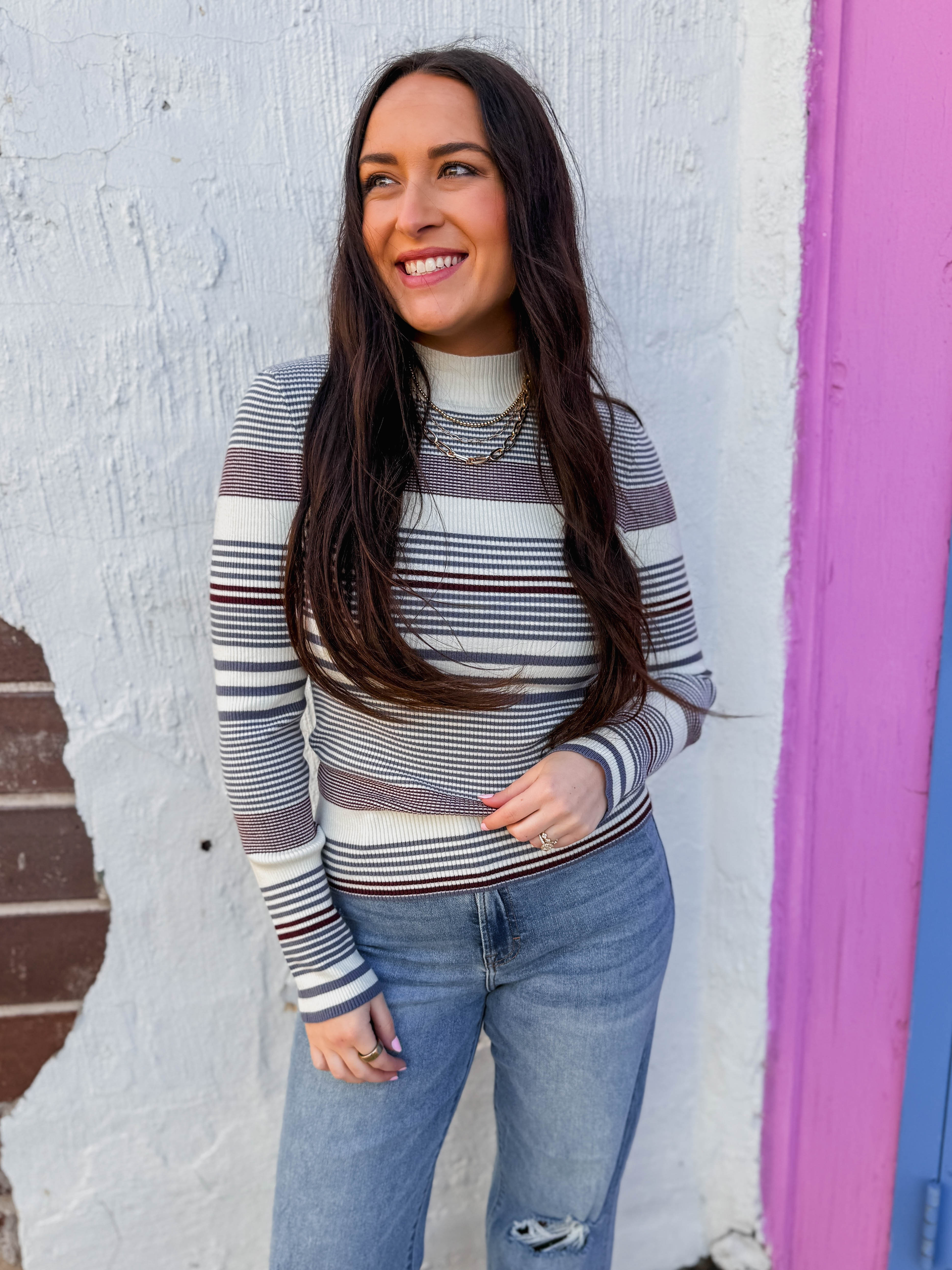 The Britt Striped Sweater features a cozy mock neckline and long sleeves, perfect for layering from work to weekend. Its soft, stretchy fabric hugs your silhouette comfortably, while the playful stripes add a fun twist to your everyday look.