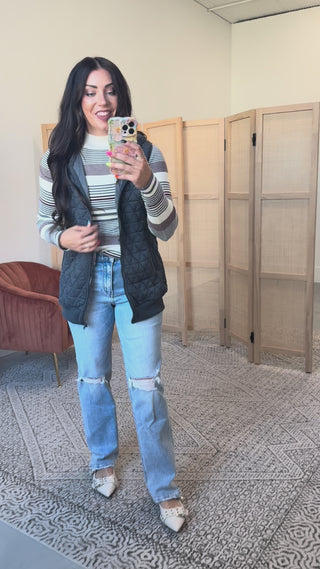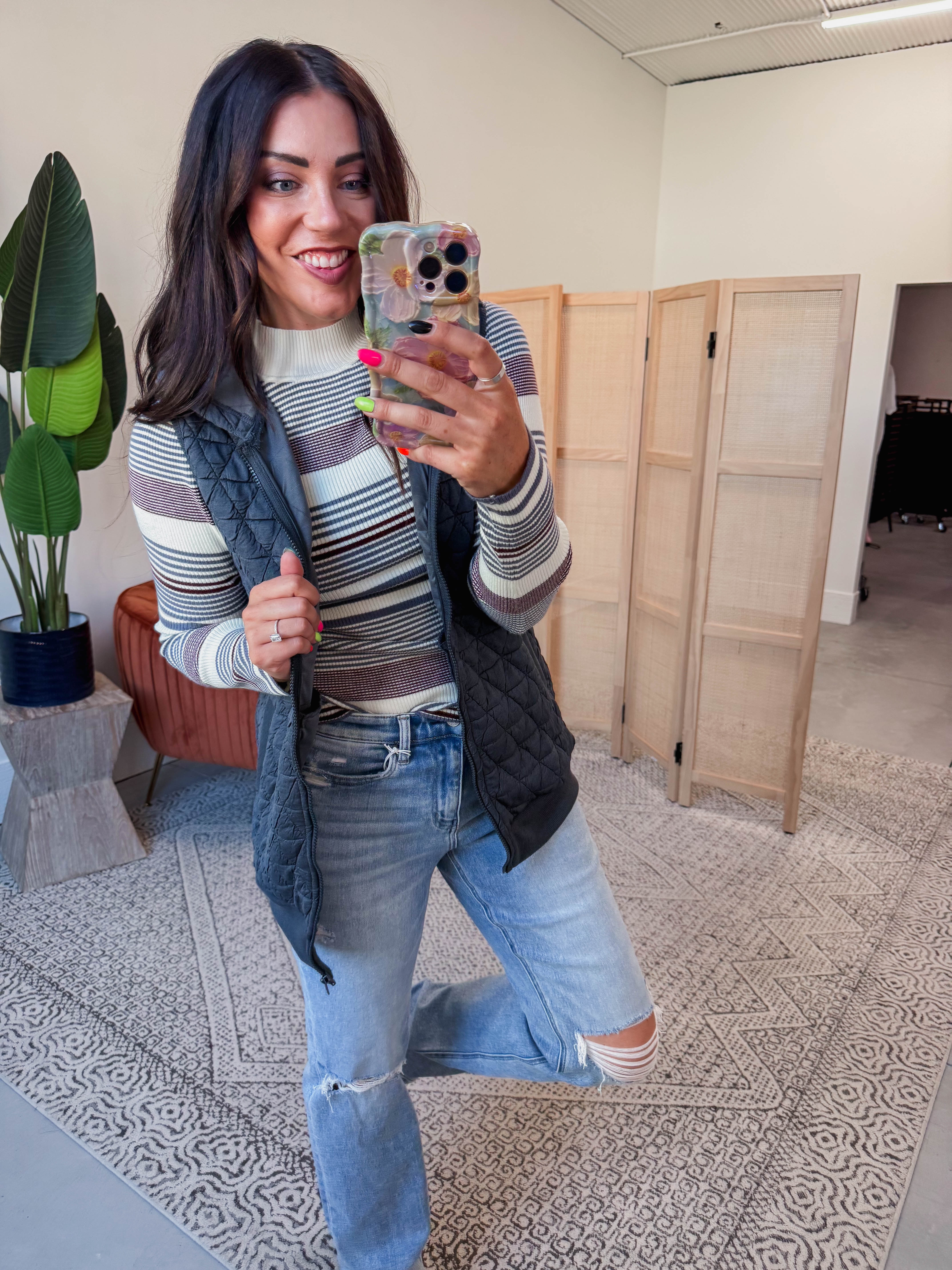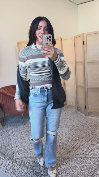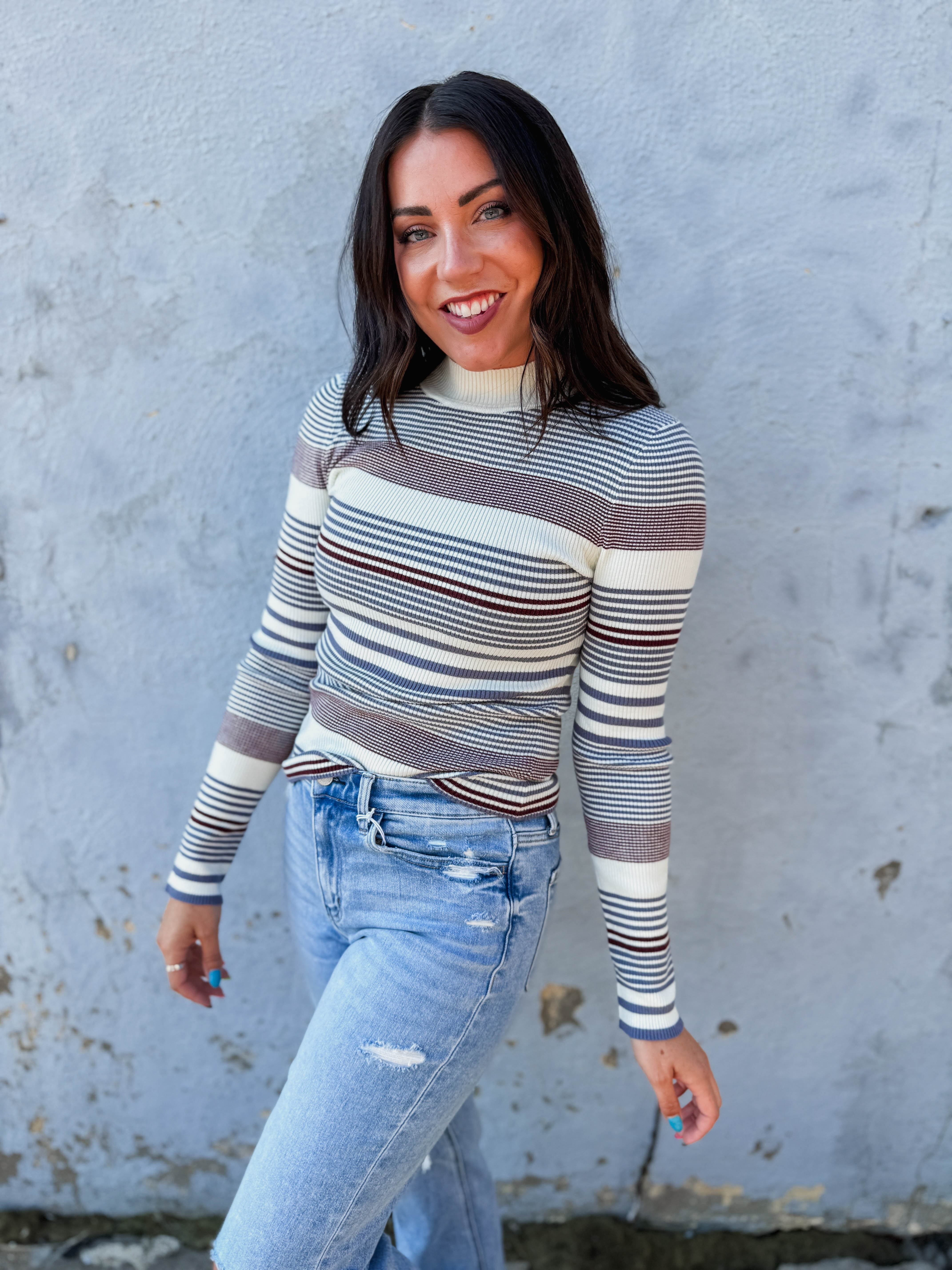 The Britt Striped Sweater features a cozy mock neckline and long sleeves, perfect for layering from work to weekend. Its soft, stretchy fabric hugs your silhouette comfortably, while the playful stripes add a fun twist to your everyday look.