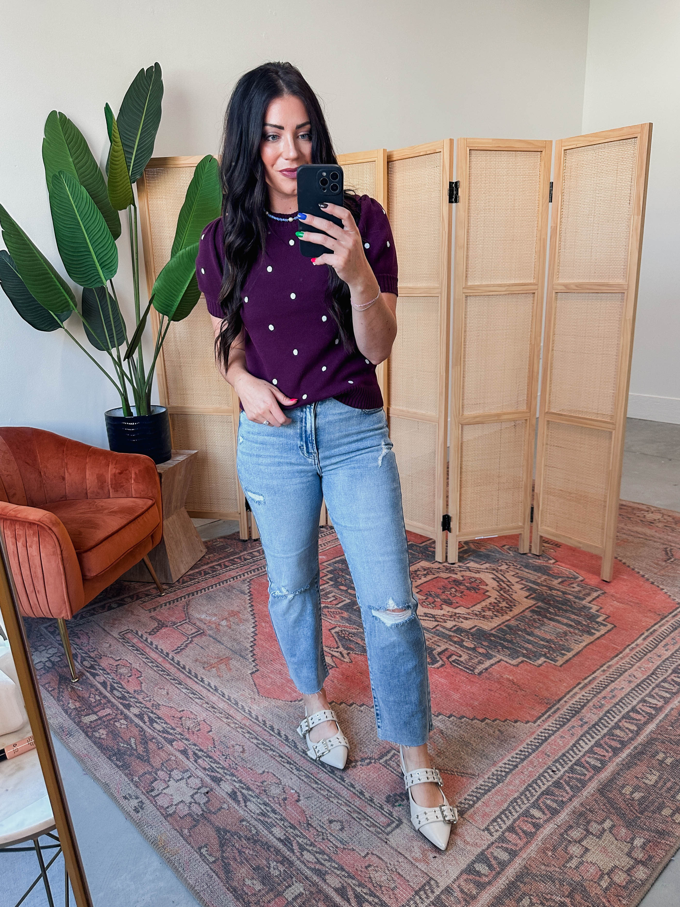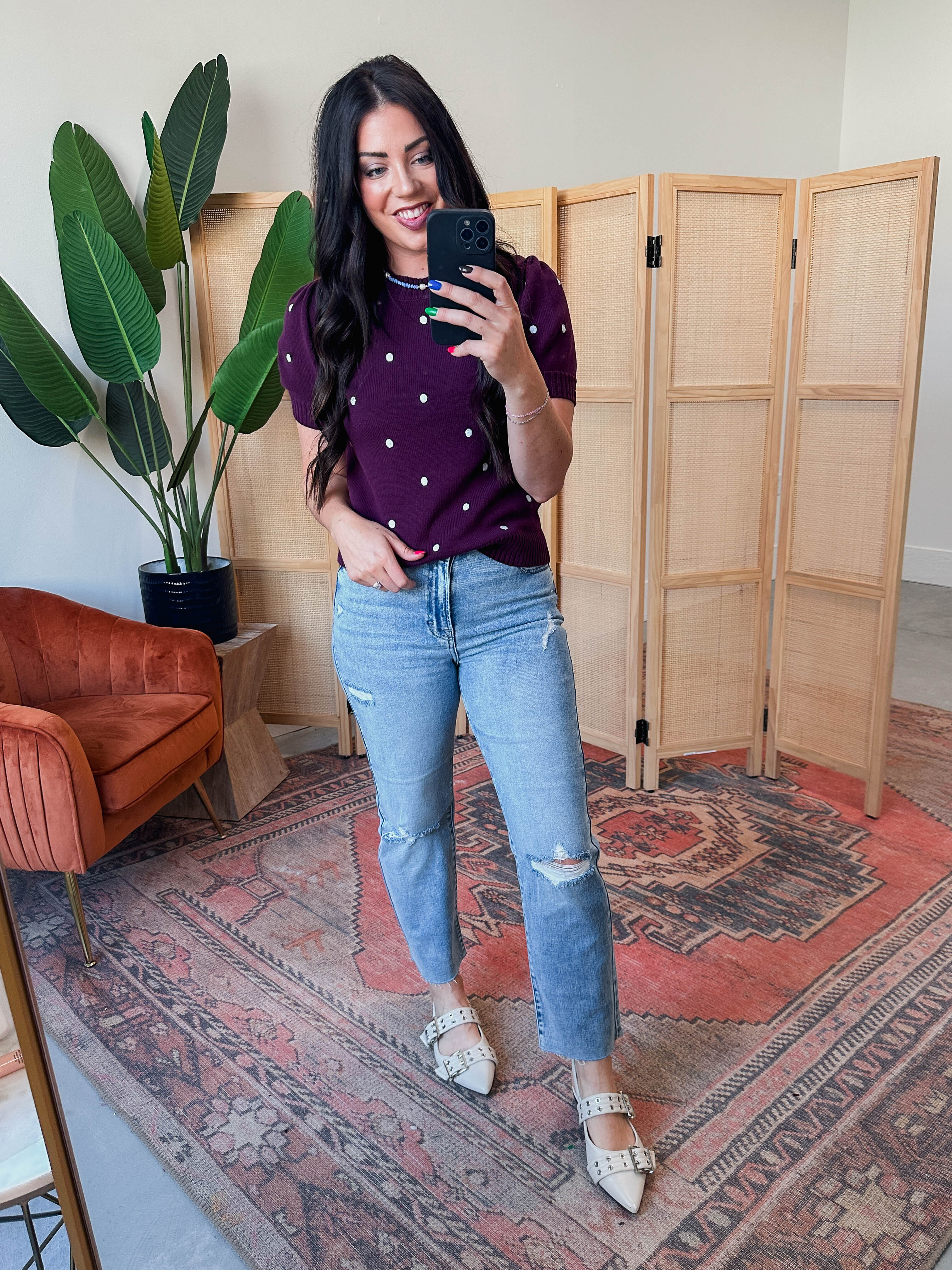 The Kali Polka Dot Knit Top features a playful polka dot embroidery, round neck, and trendy short puff sleeves. Perfect for work or weekend, it adds a fun, stylish touch to any outfit.