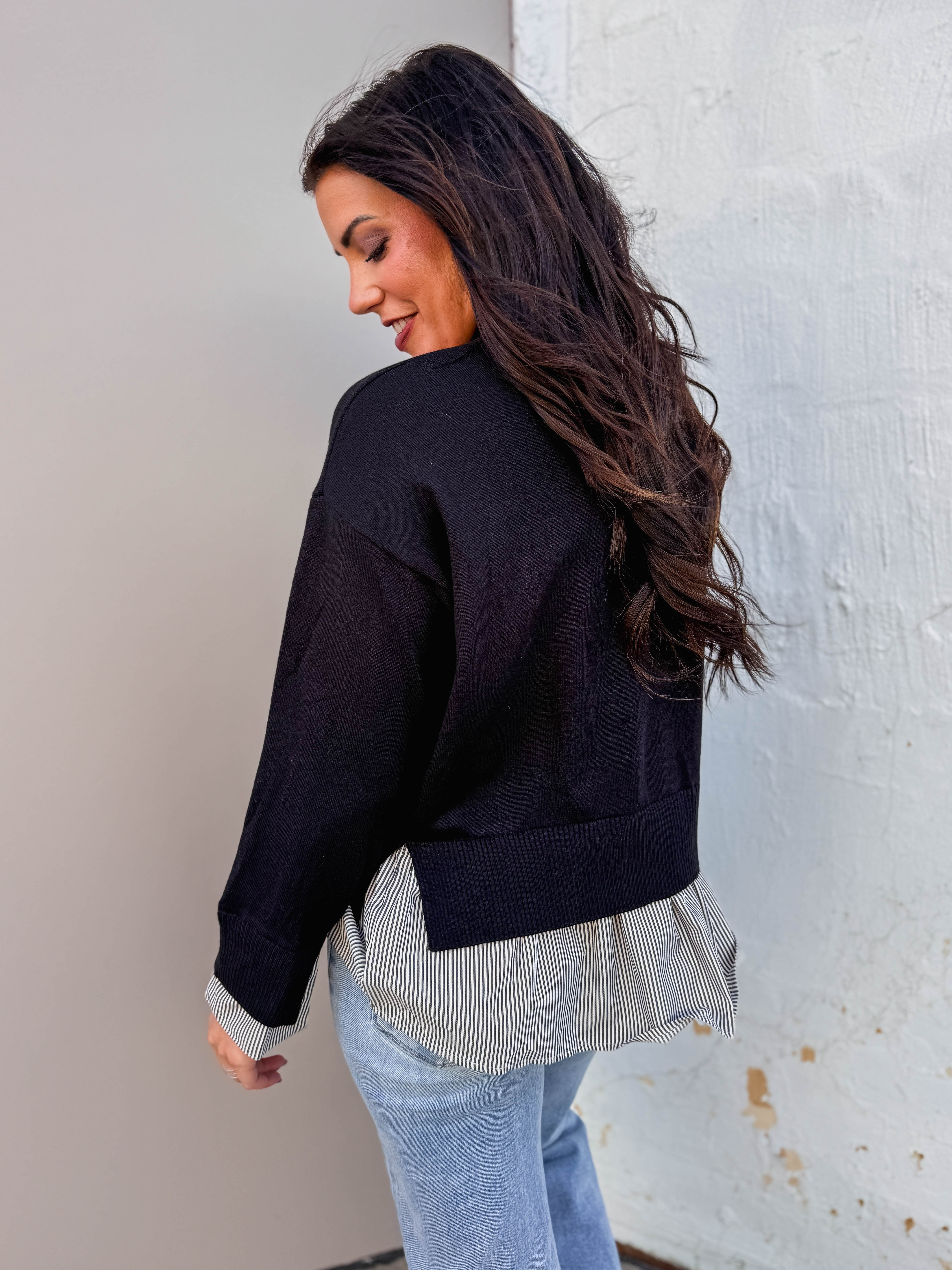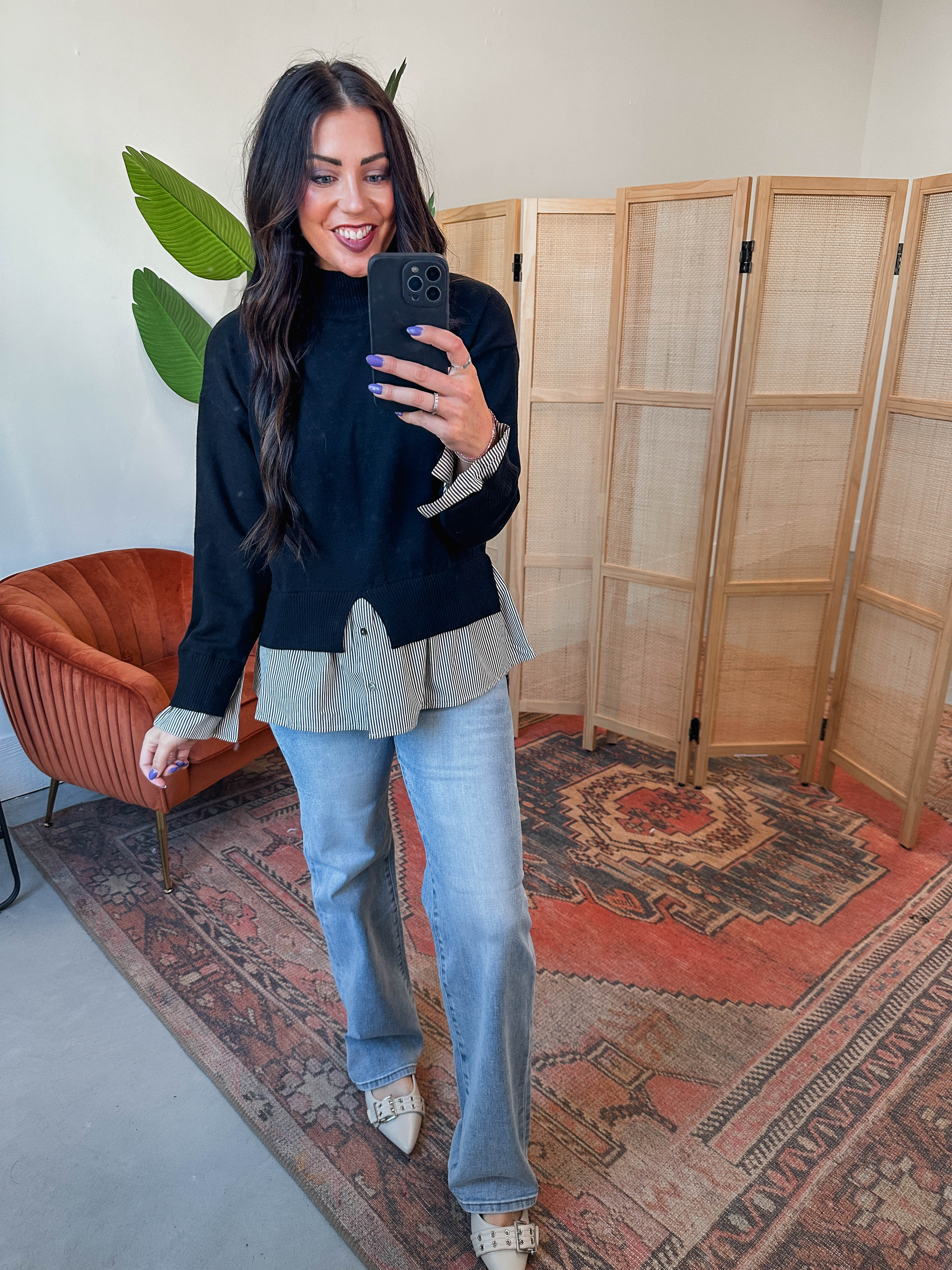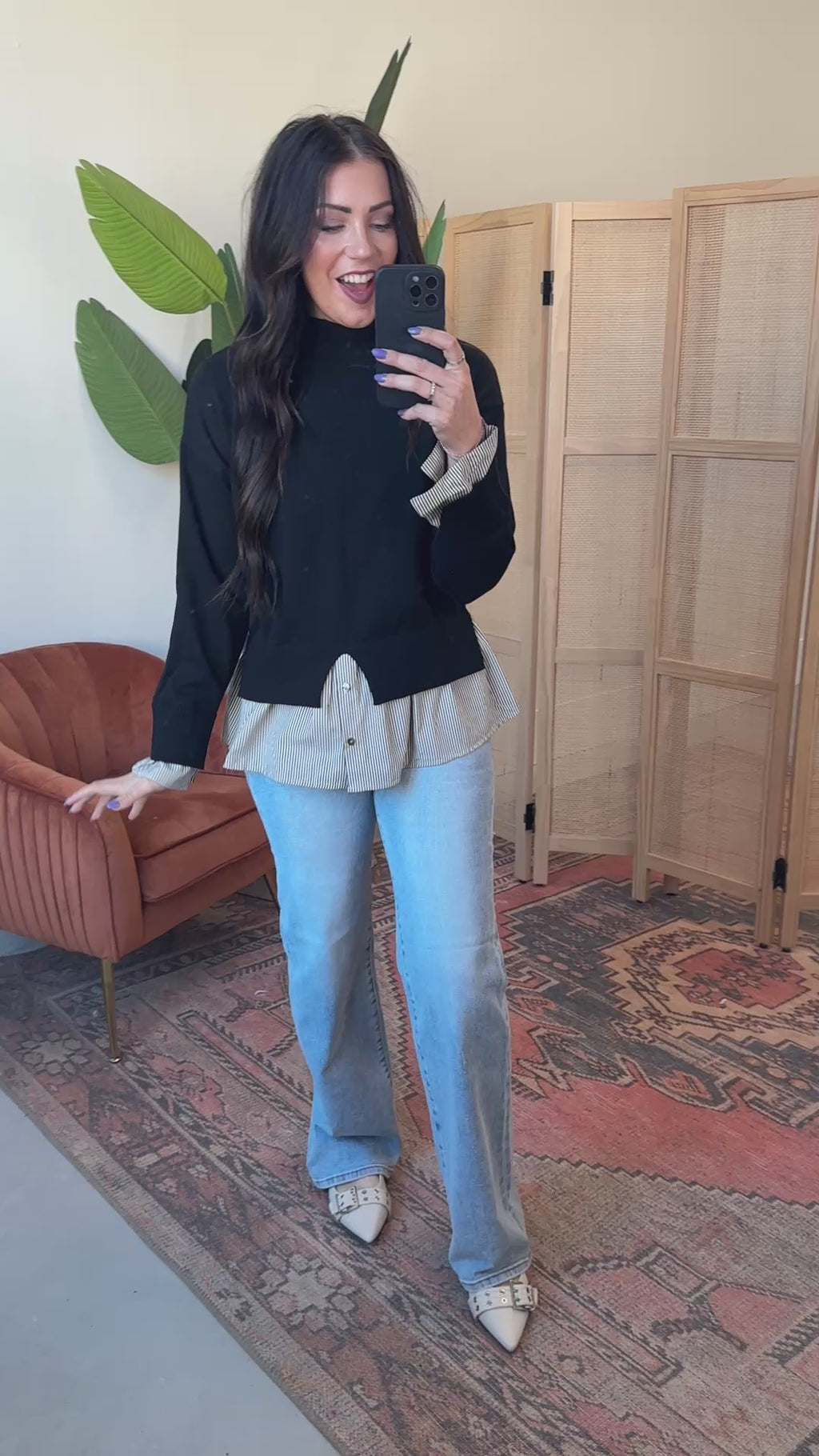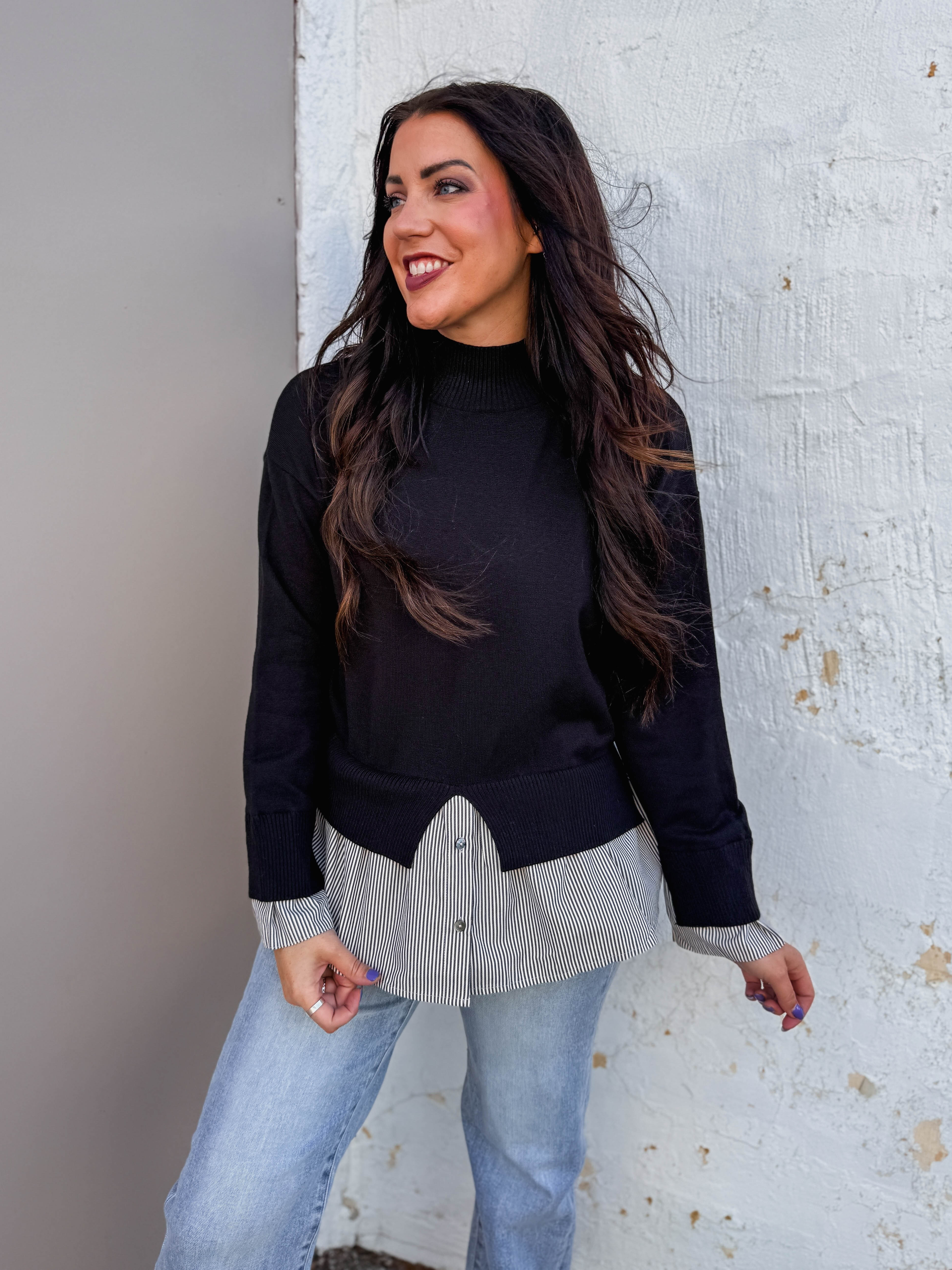 This black knit top features a fun mock neckline and cozy long sleeves. Its unique attached layered shirt hem with striped contrast adds a playful twist, making it perfect for workdays or weekend adventures. Easy to style and comfy to wear!