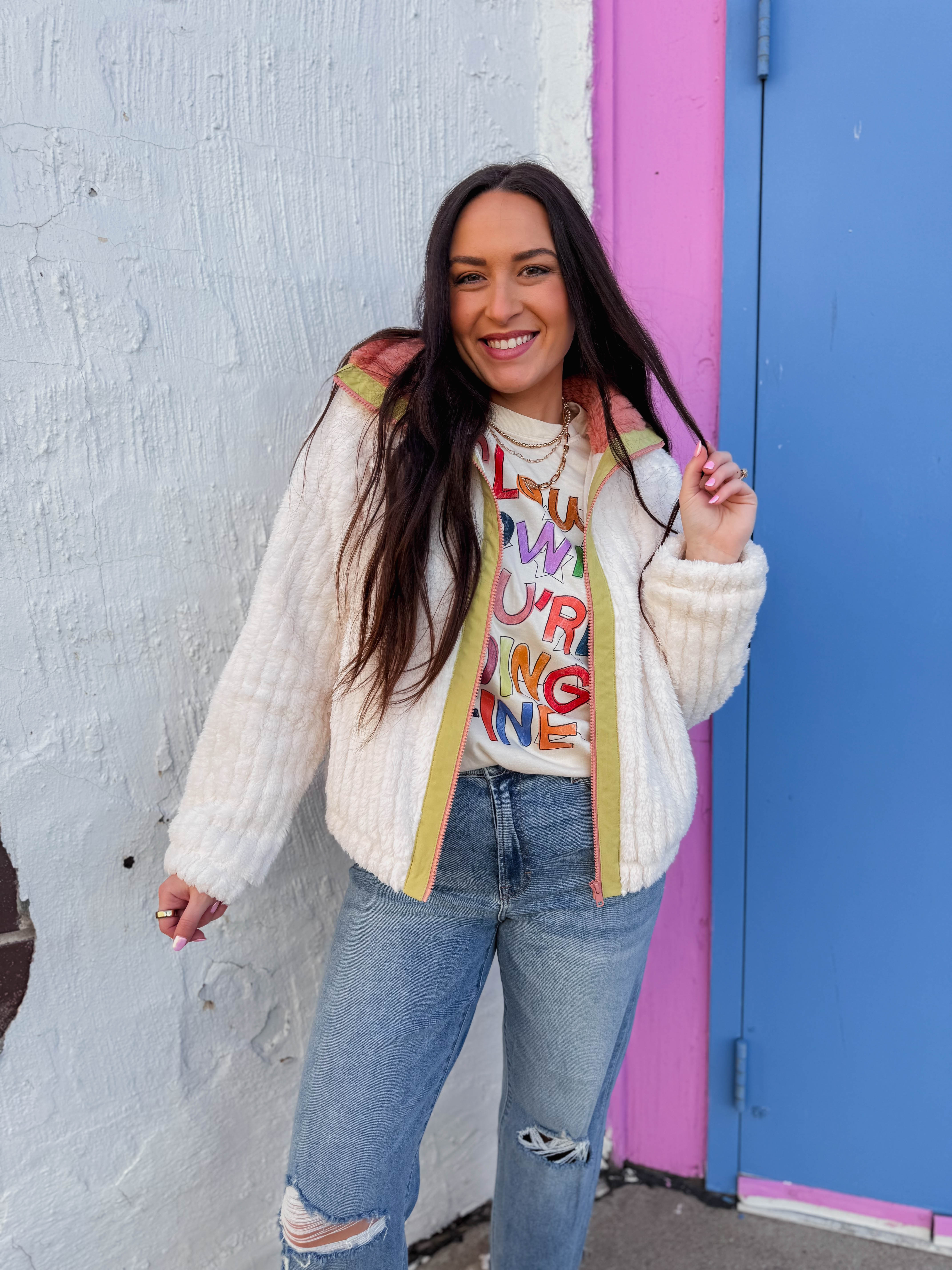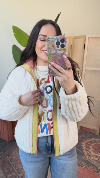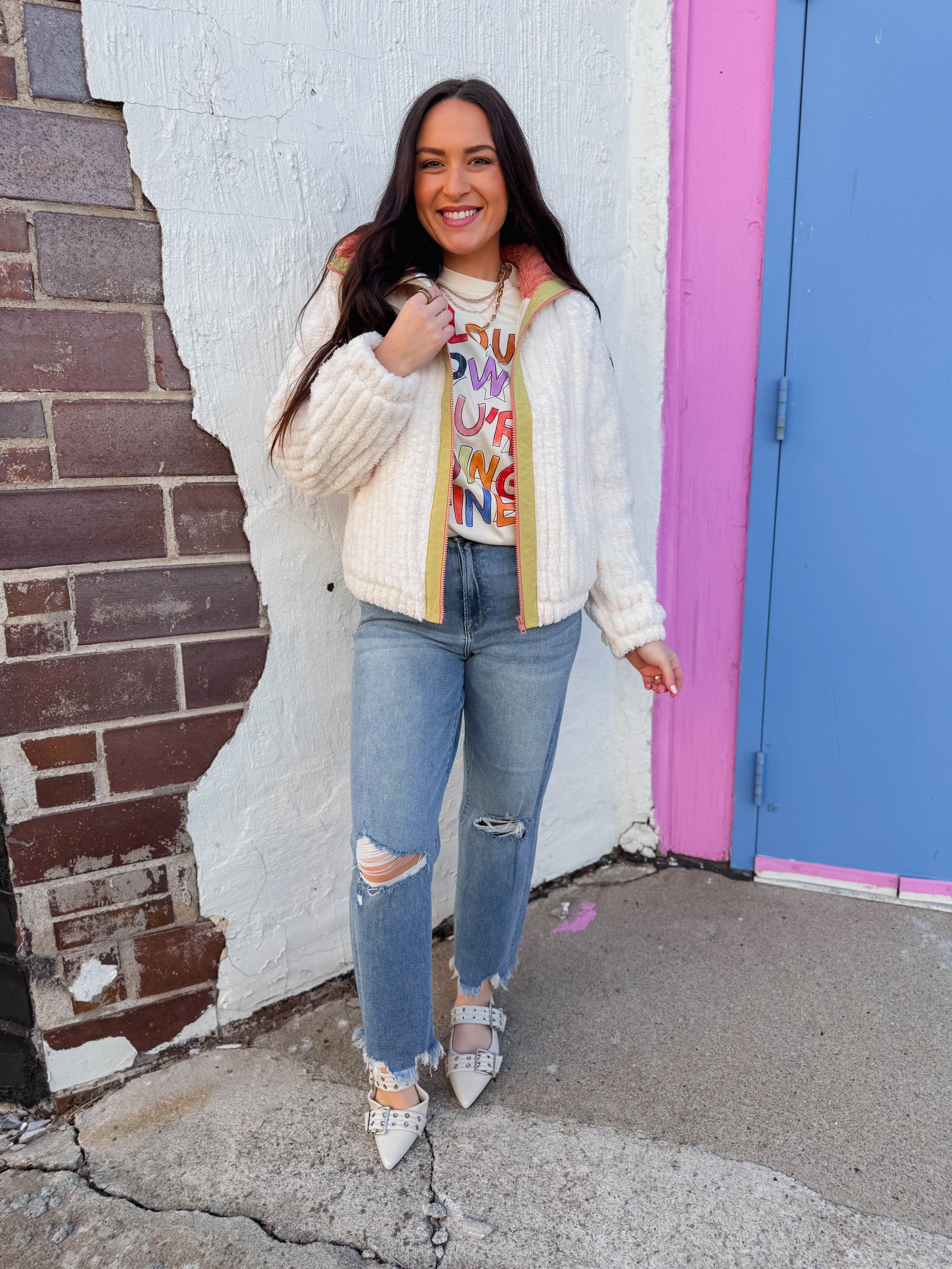 Cozy up in the Remy Sherpa Jacket! Featuring a cute collared neckline, long sleeves, and a handy front zip, it’s perfect for layering. The playful contrast trim adds a fun twist to your go-to cold-weather look.