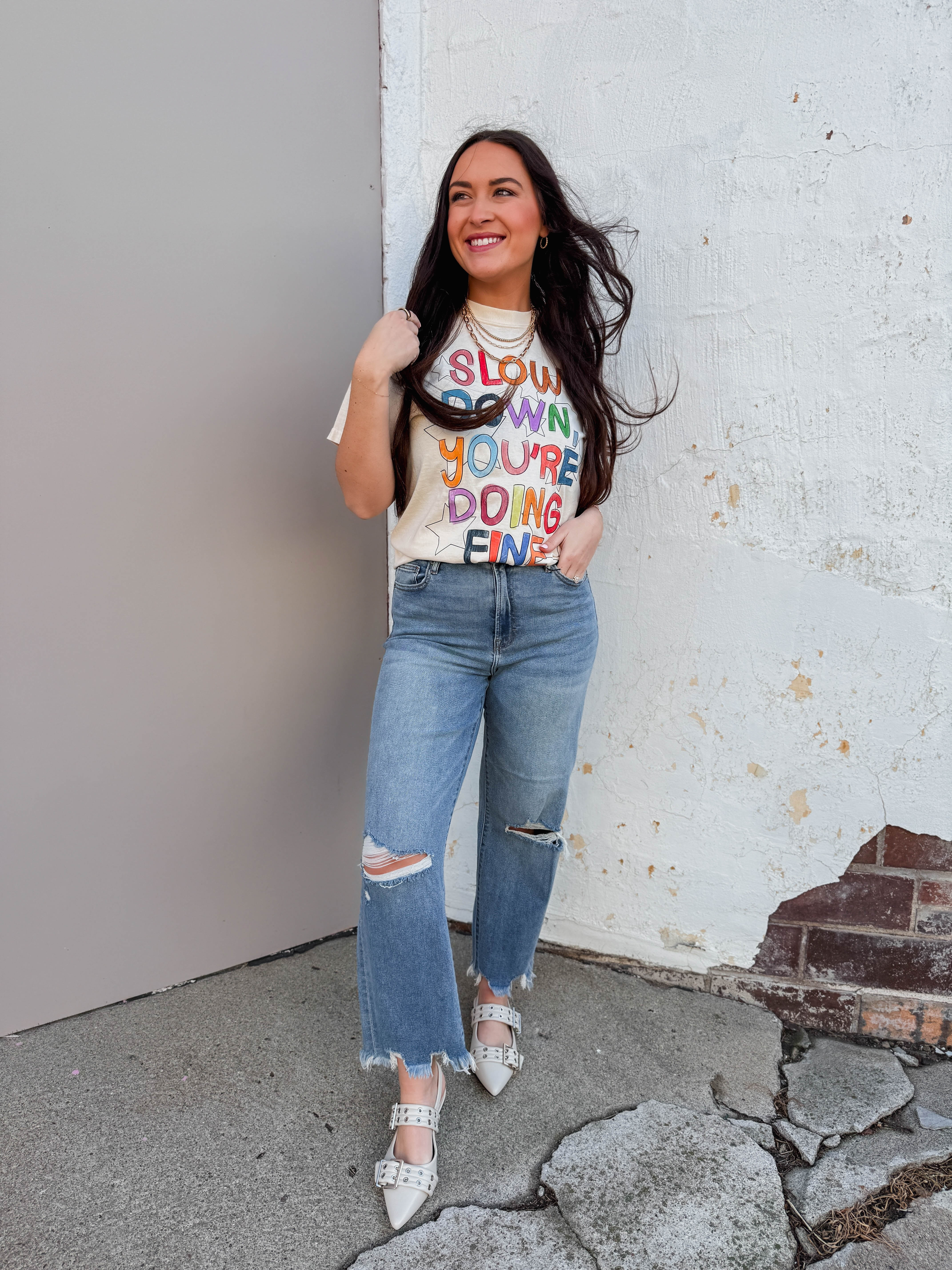 Stay cheerful all day in the Slow Down Tee! Featuring a "Slow Down You're Doing Fine" graphic, this comfy Comfort Colors crew neck with short sleeves offers a relaxed unisex fit—perfect for sunny summer vibes.