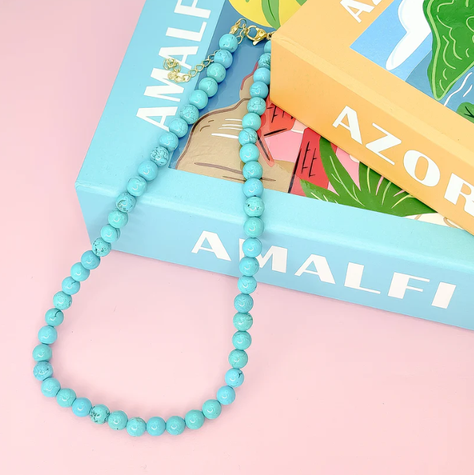 Elevate your look with the timeless beauty of colorful gemstone! Meet your new happy place-strung in beads. This necklace features smooth turquoise-blue beads that radiate gold energy and cool girl style. Easy to layer or wear solo. Length is 17" + 2" Extender