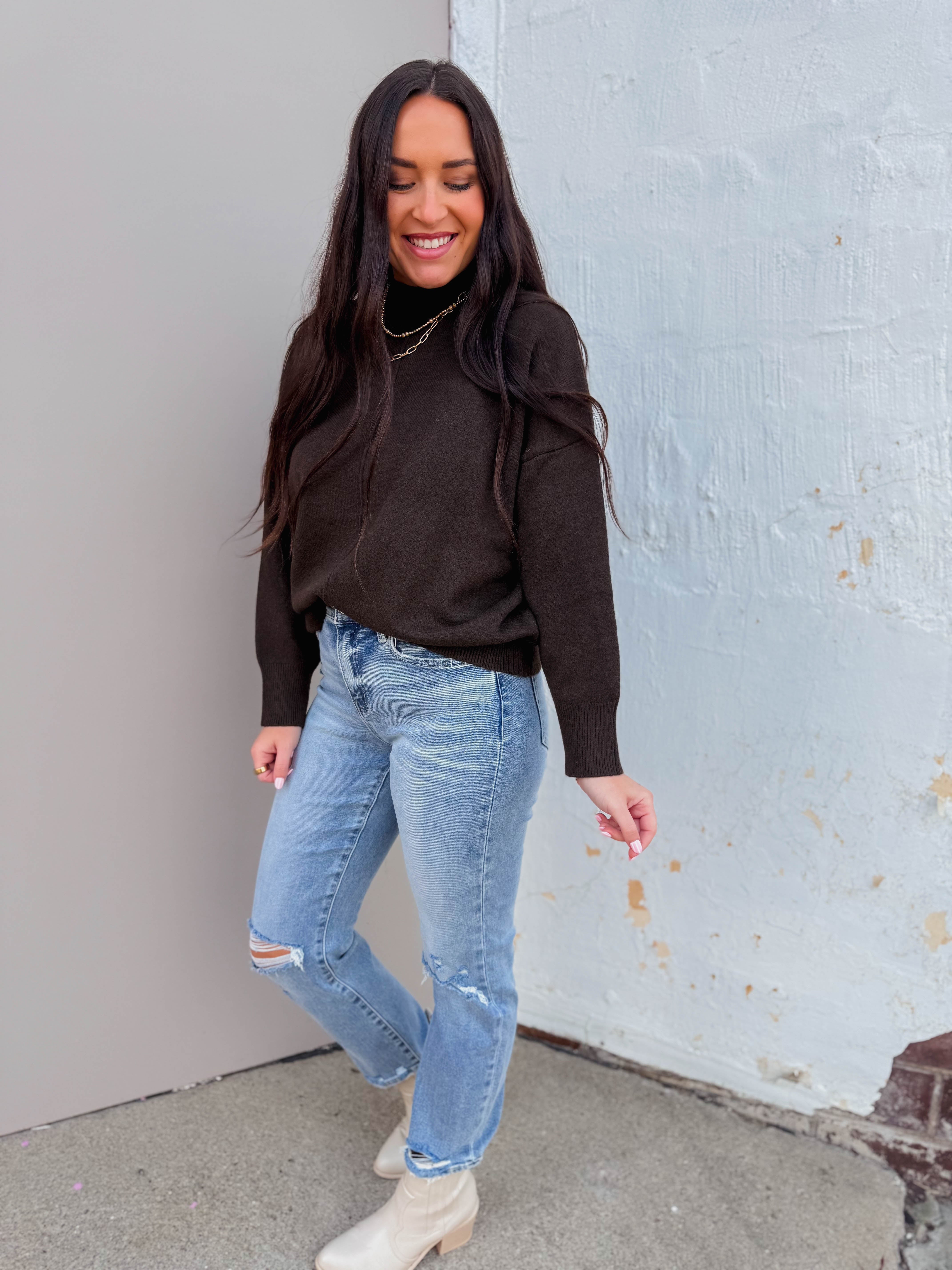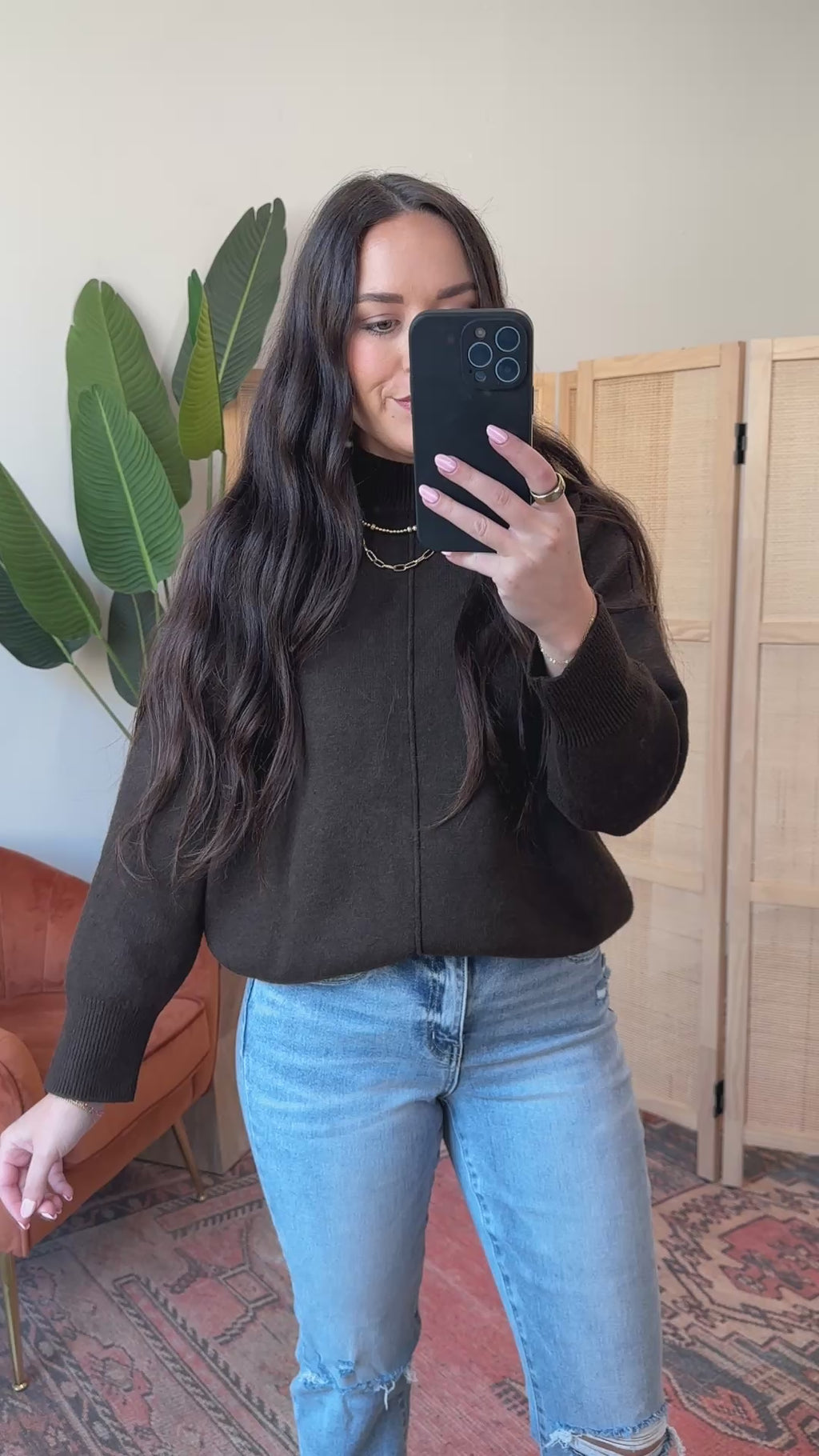Stay cozy from work to weekend in the Briar Sweater in Brown. Featuring a playful mock neckline, long sleeves, and a relaxed drop shoulder fit, it’s finished with ribbed trim and a front seam detail for a stylish touch. Easy to wear, harder to take off!