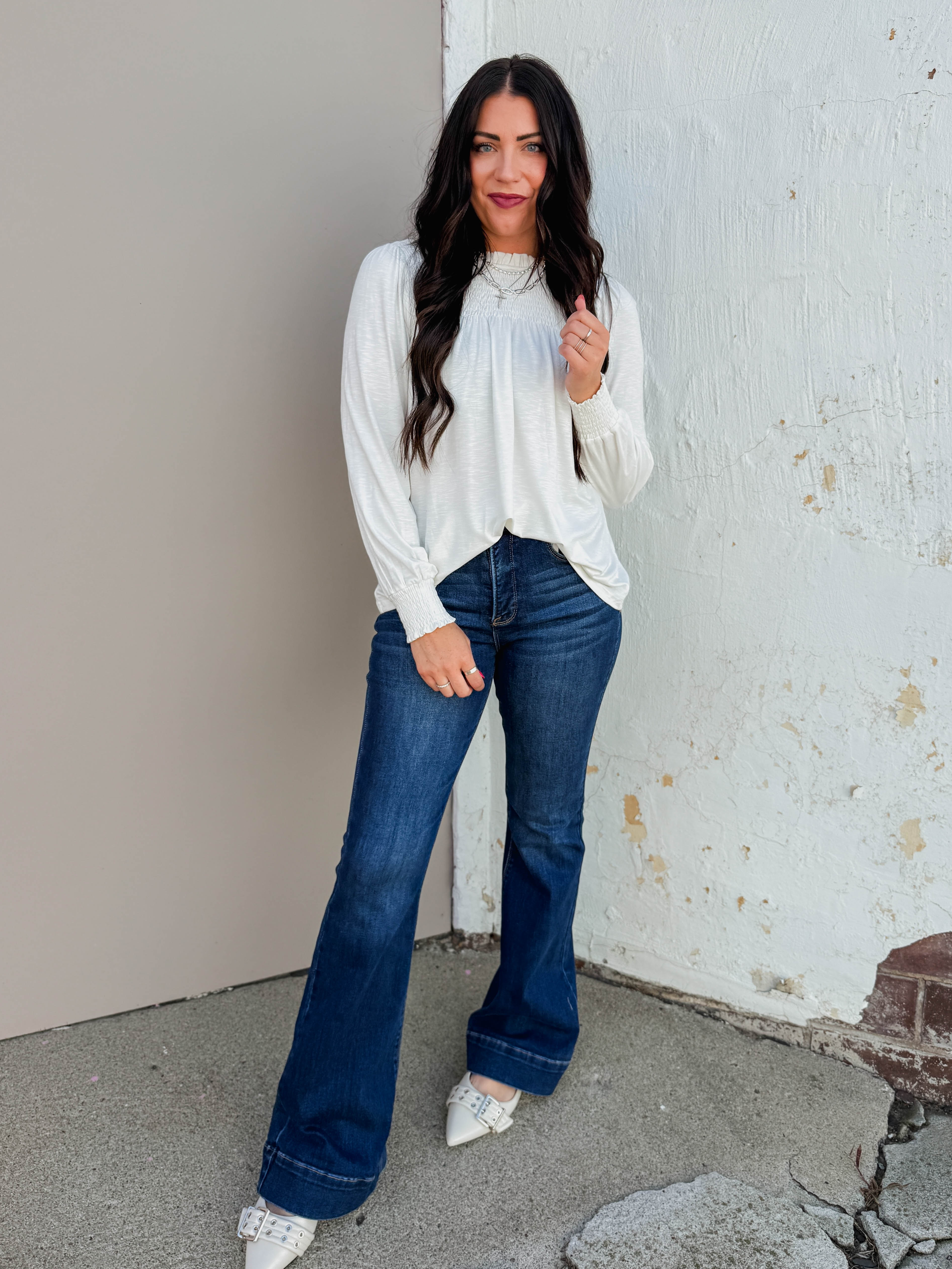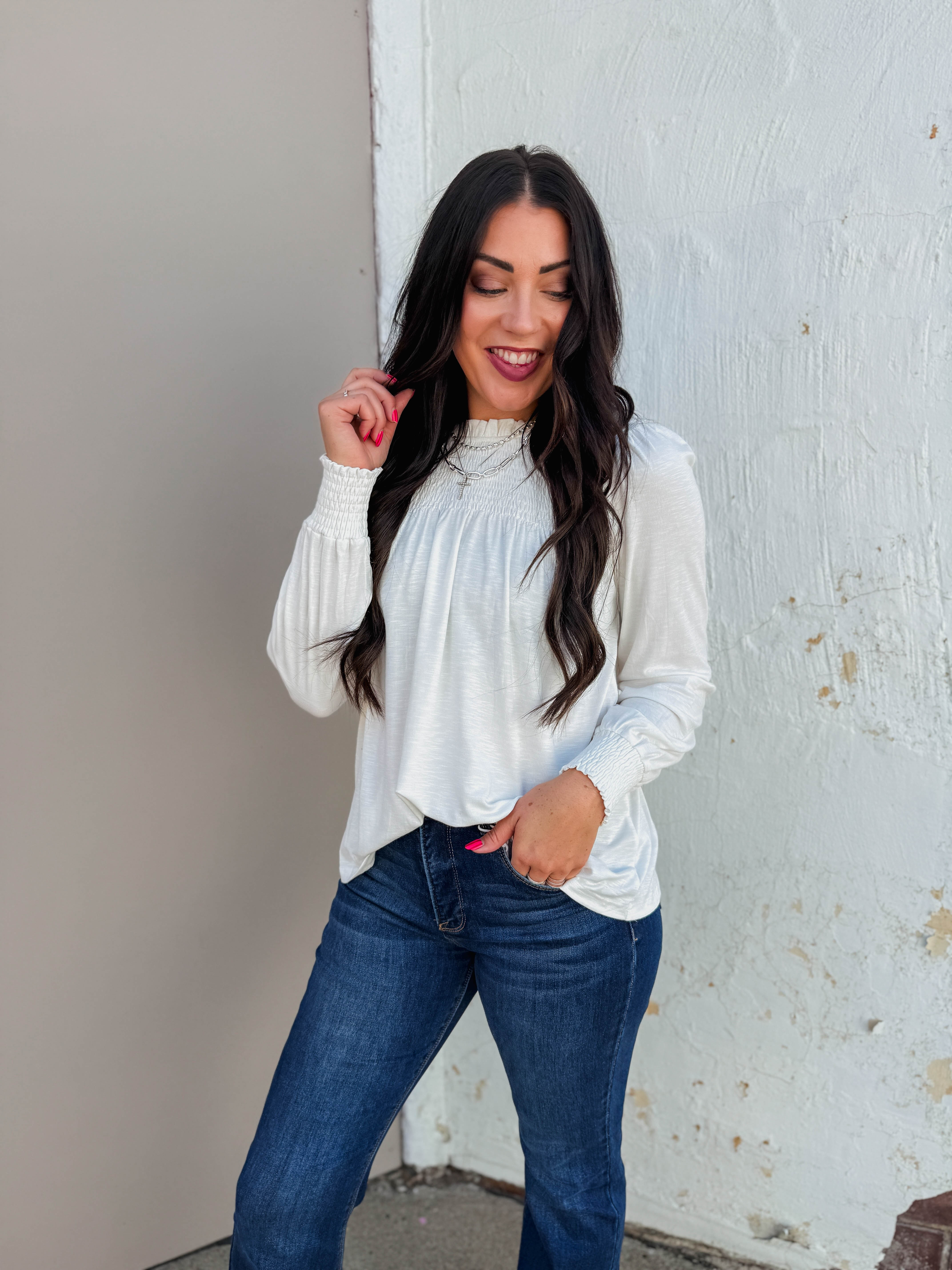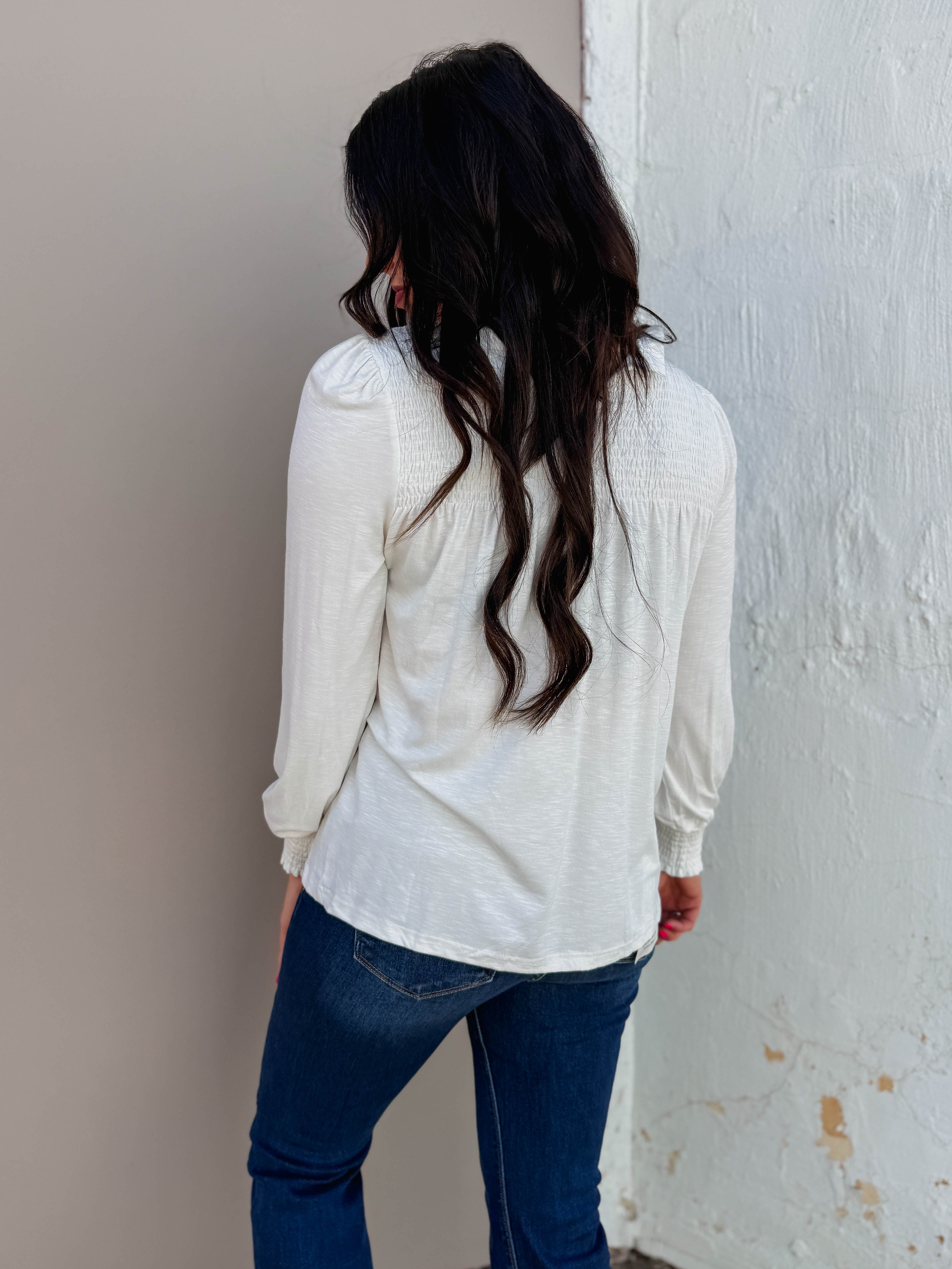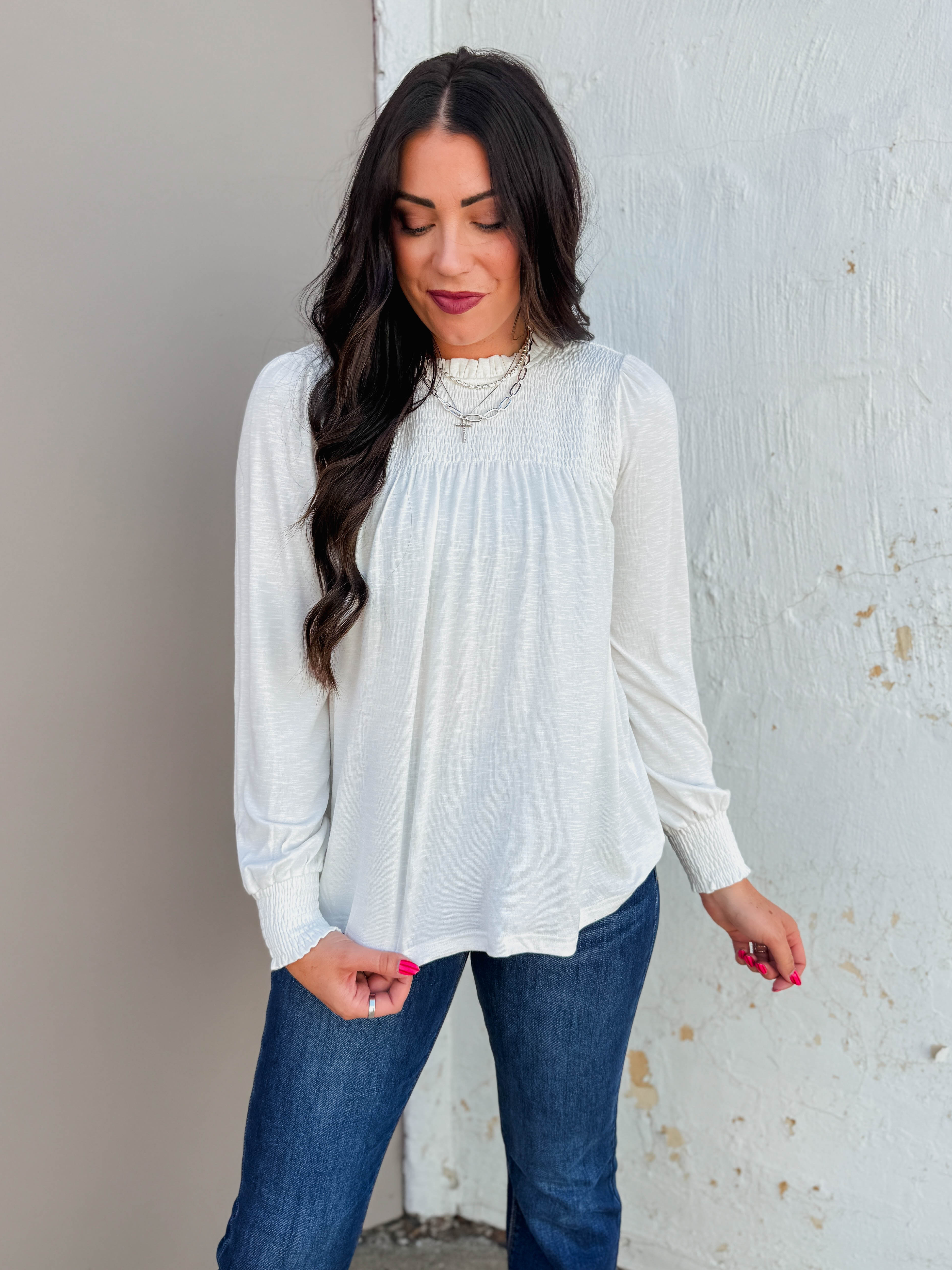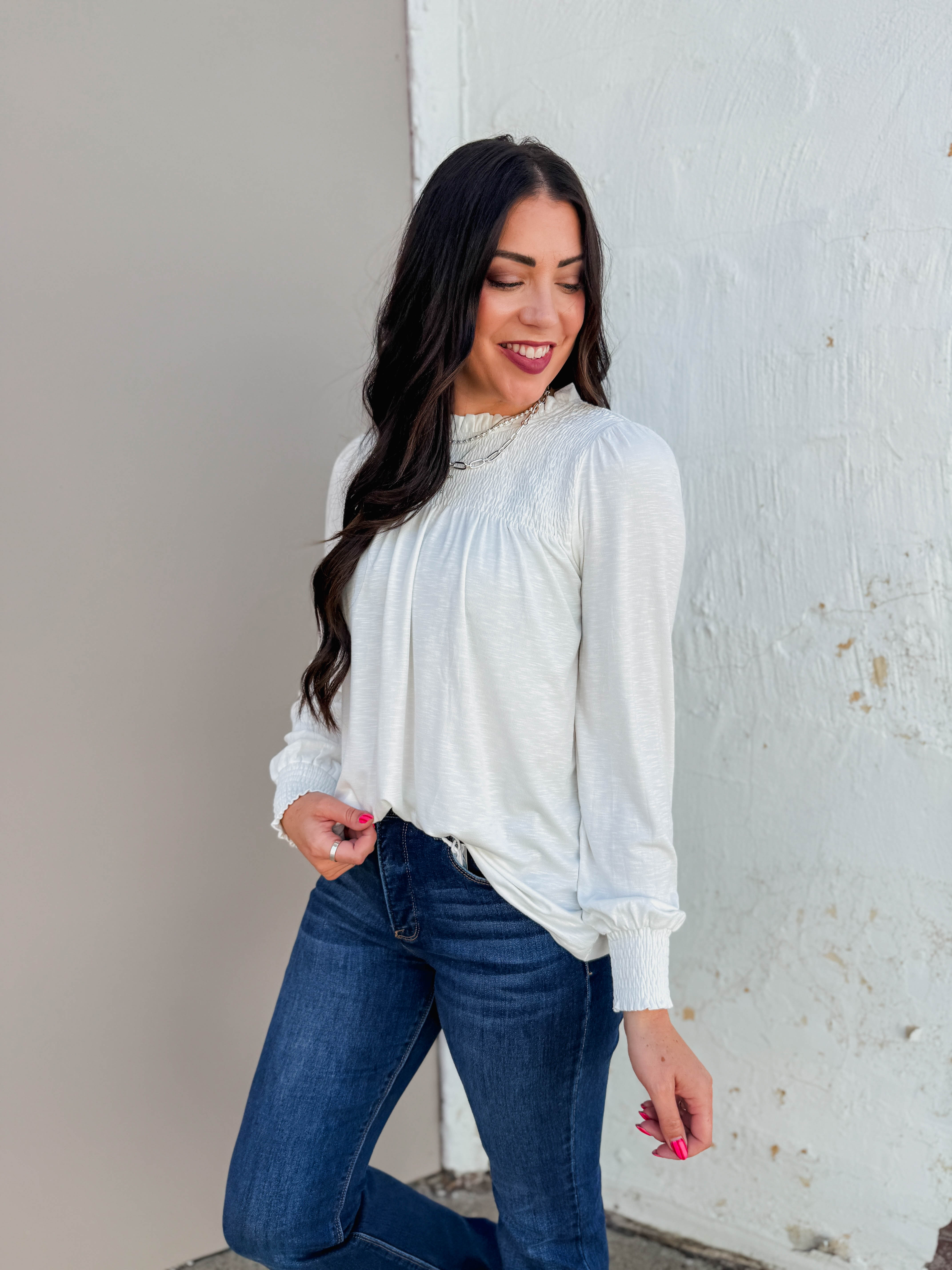 The Dana Top is your new go-to for effortless style. Made from cozy slubbed jersey, it features a flirty ruffle high neck and a charming keyhole button back. Long sleeves with smocked cuffs add a touch of whimsy, making it perfect to take you from work to weekend with ease.