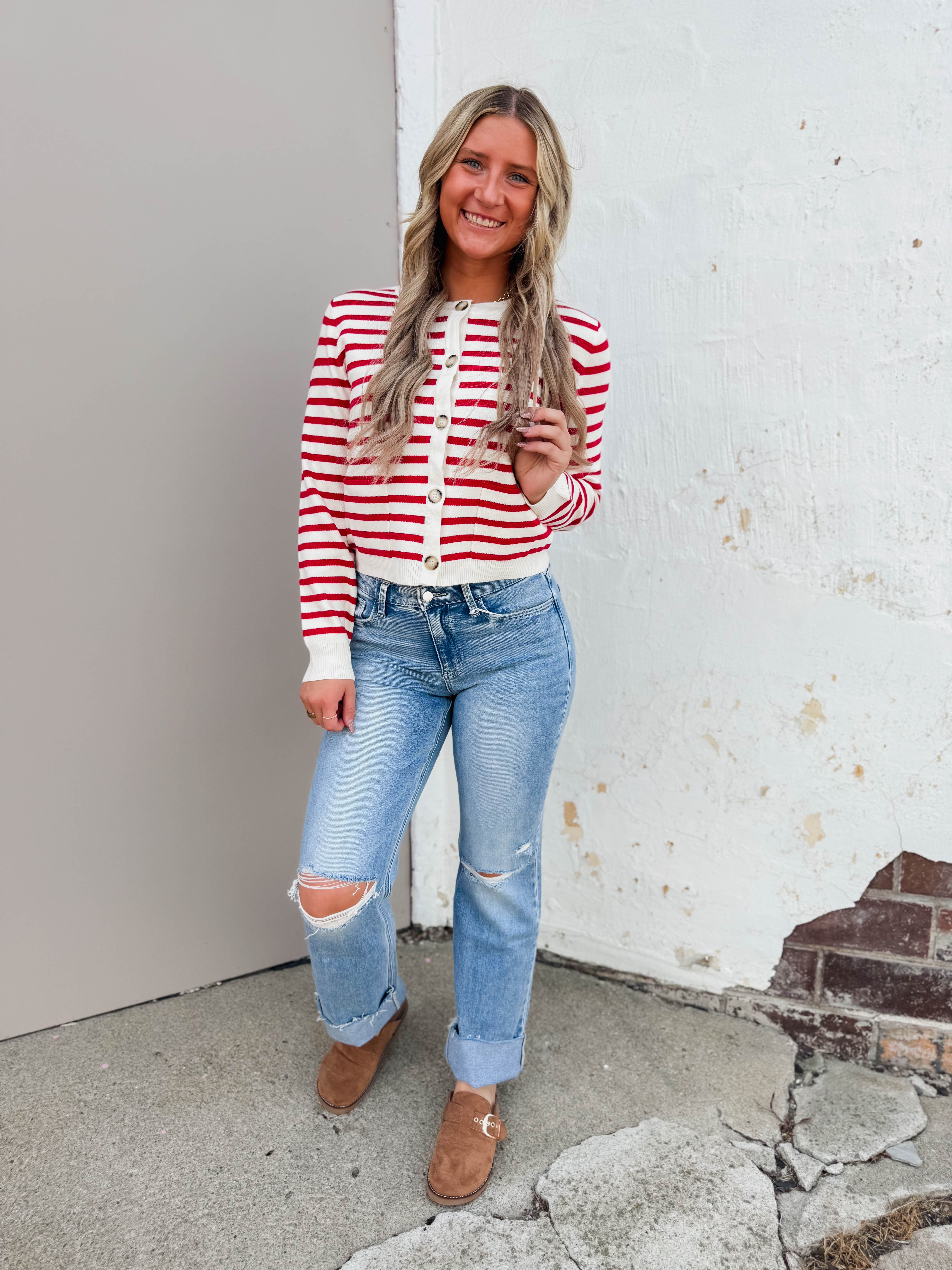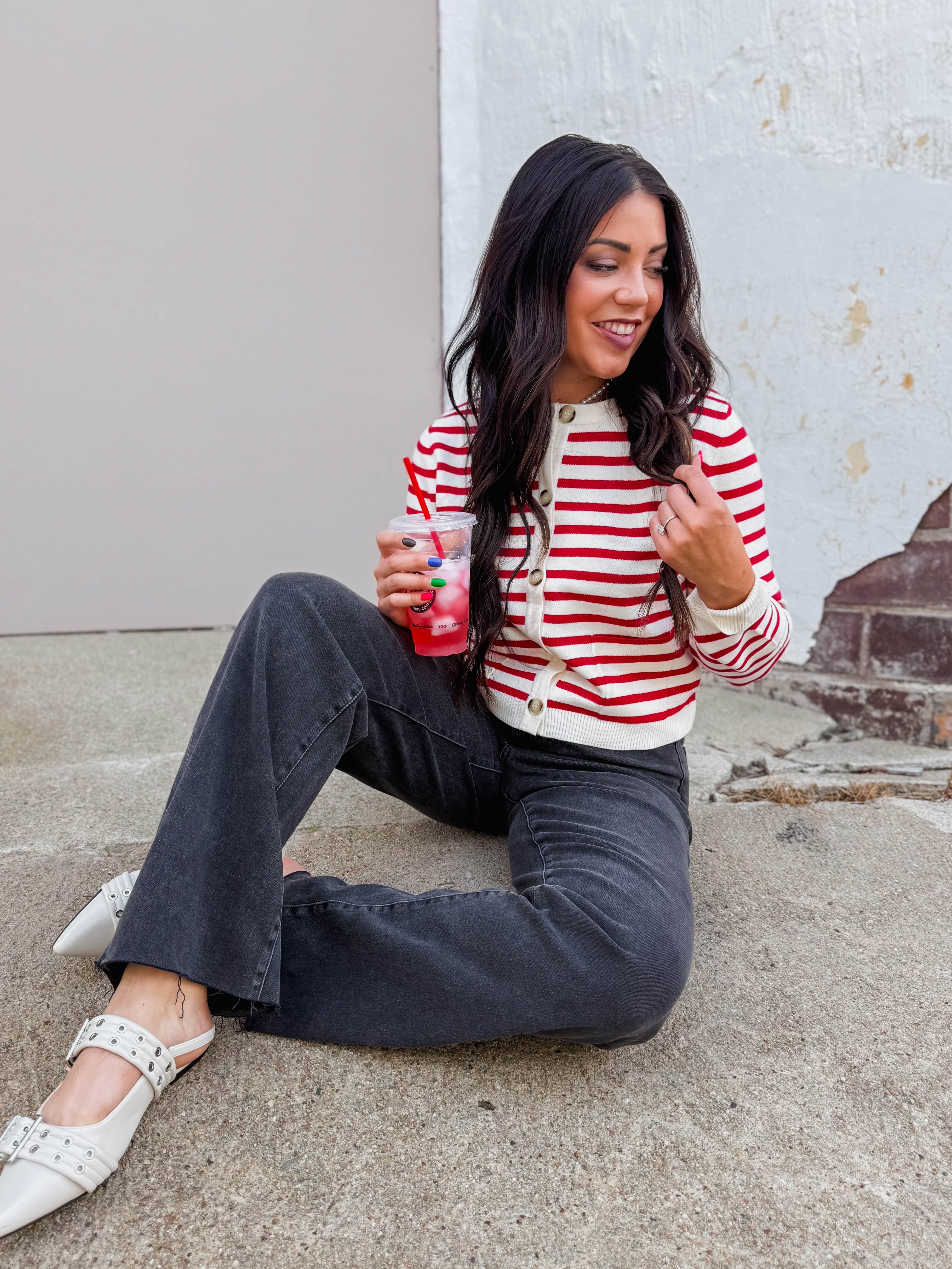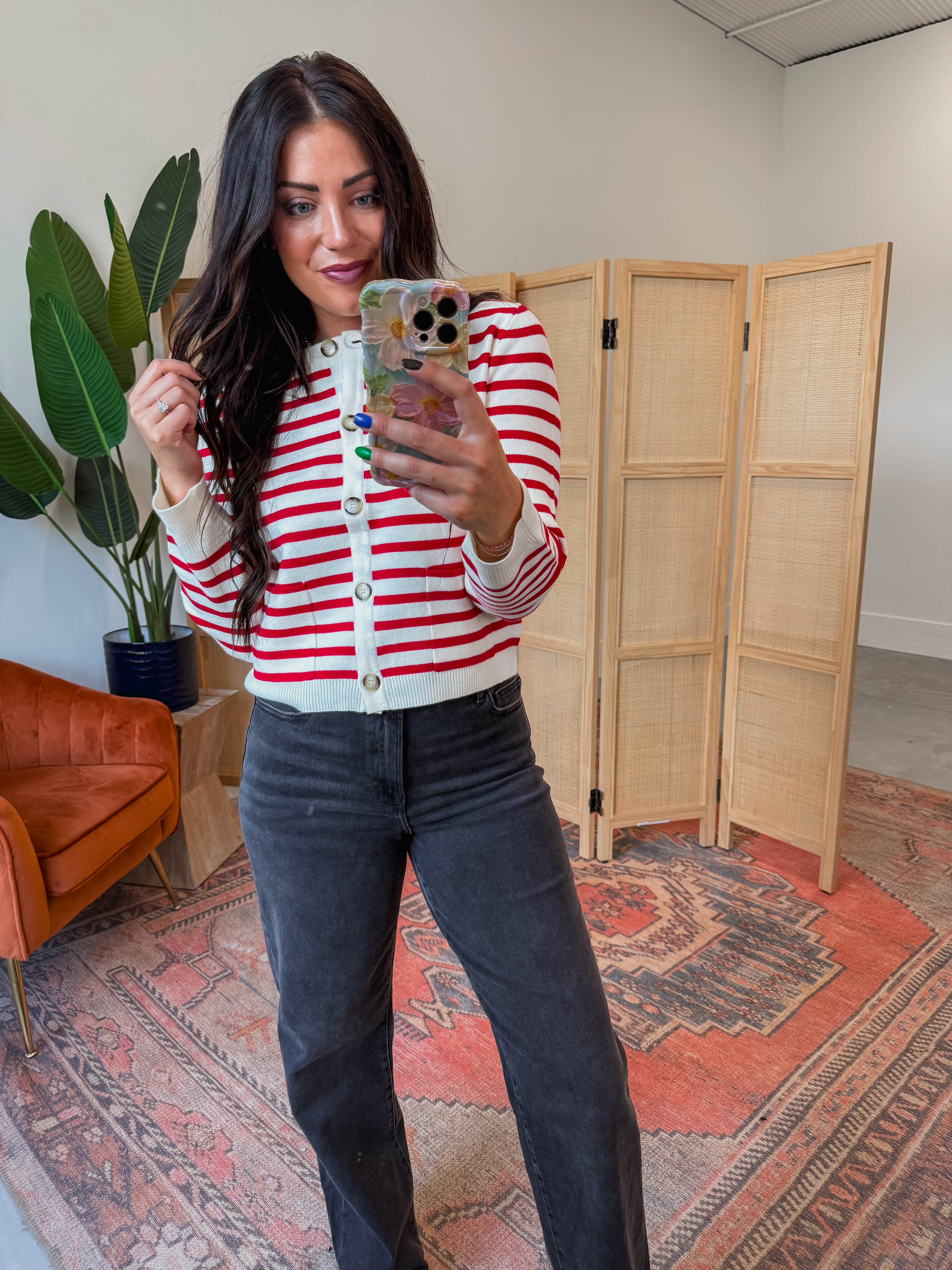 RESTOCK! Add a fun pop of color to your look with the Eva Striped Cardigan in blue and green. Featuring a round neckline, long sleeves, and button-front closure, this buttery soft sweater effortlessly transitions from work to weekend with playful style.
