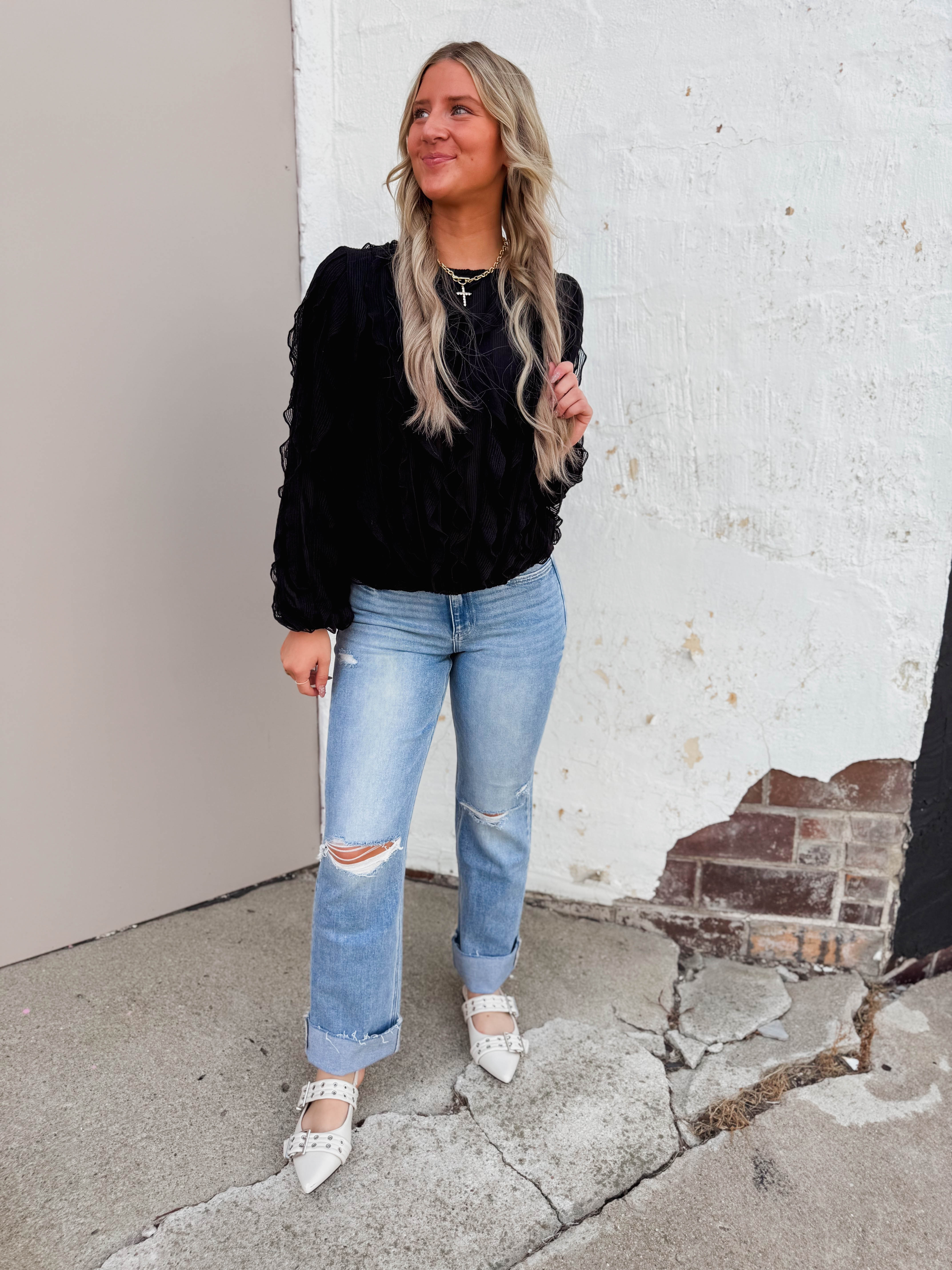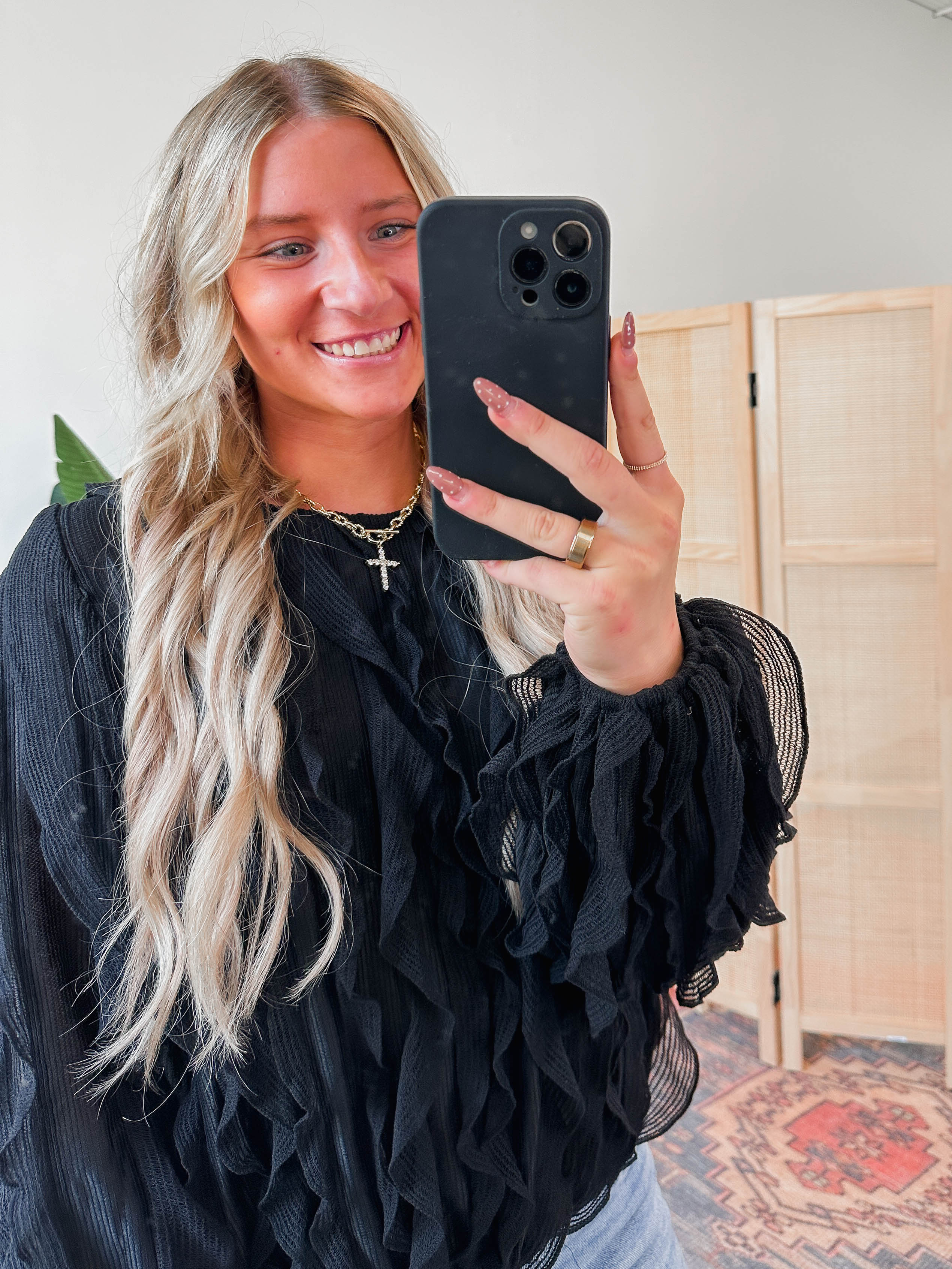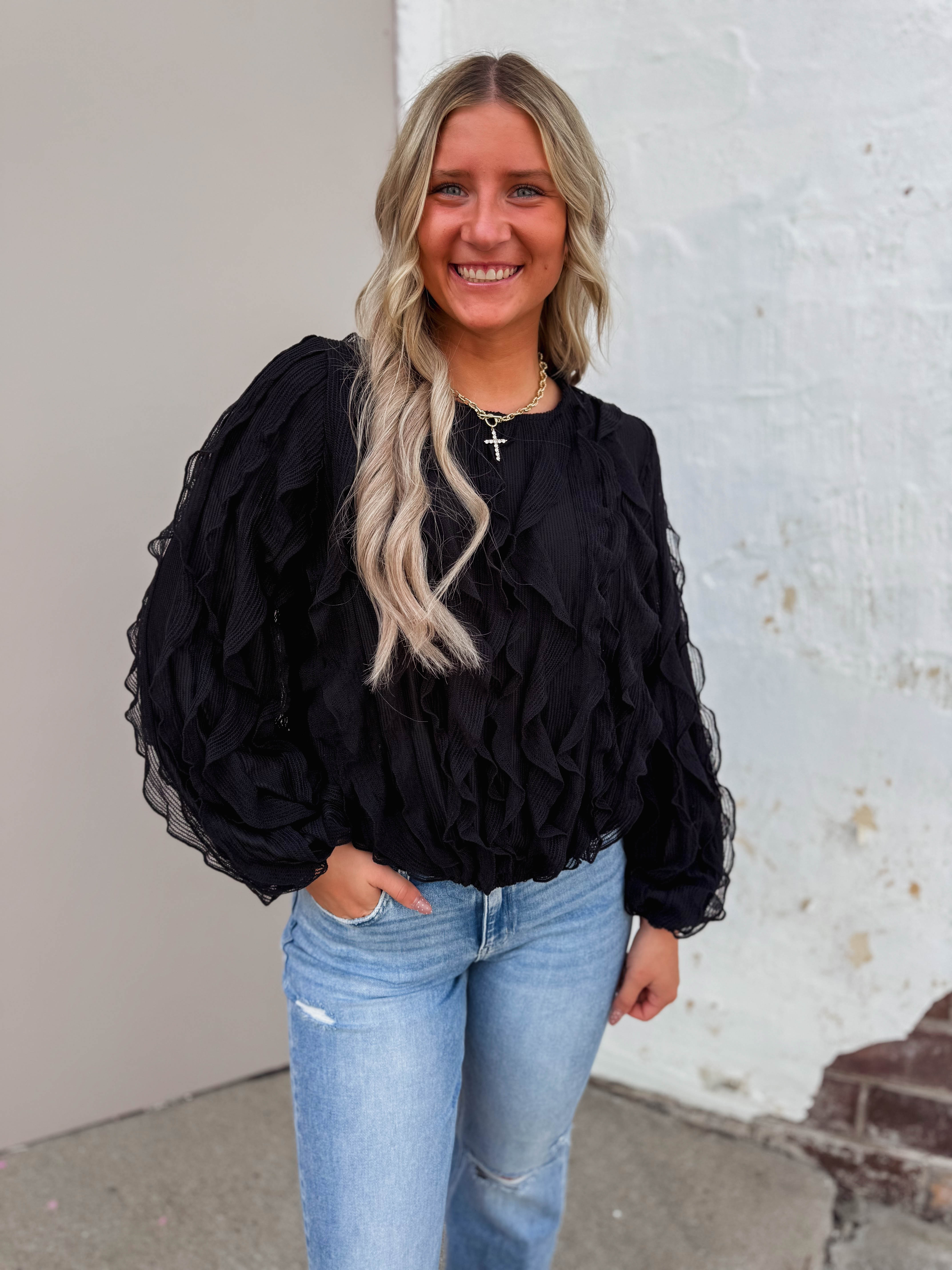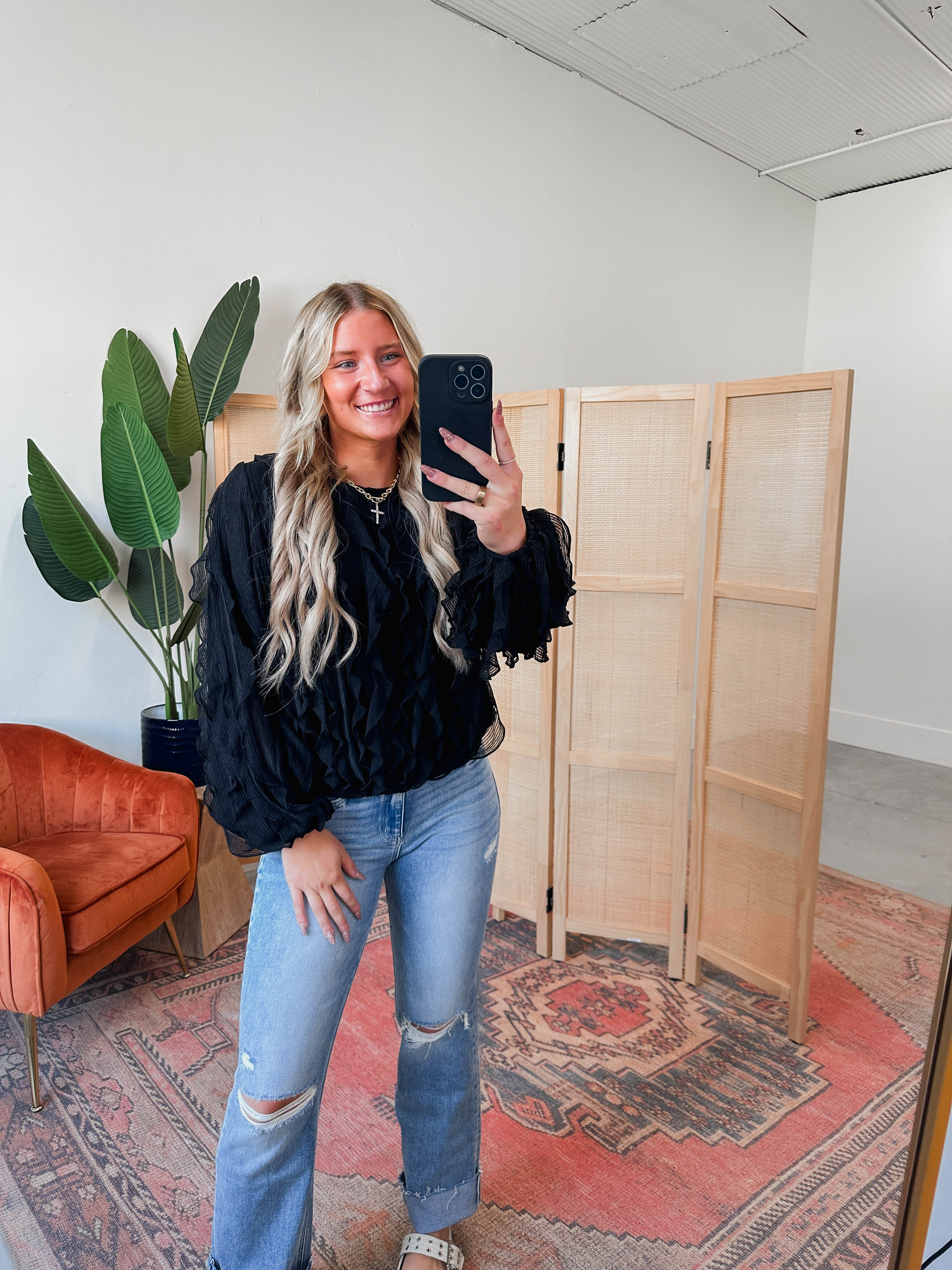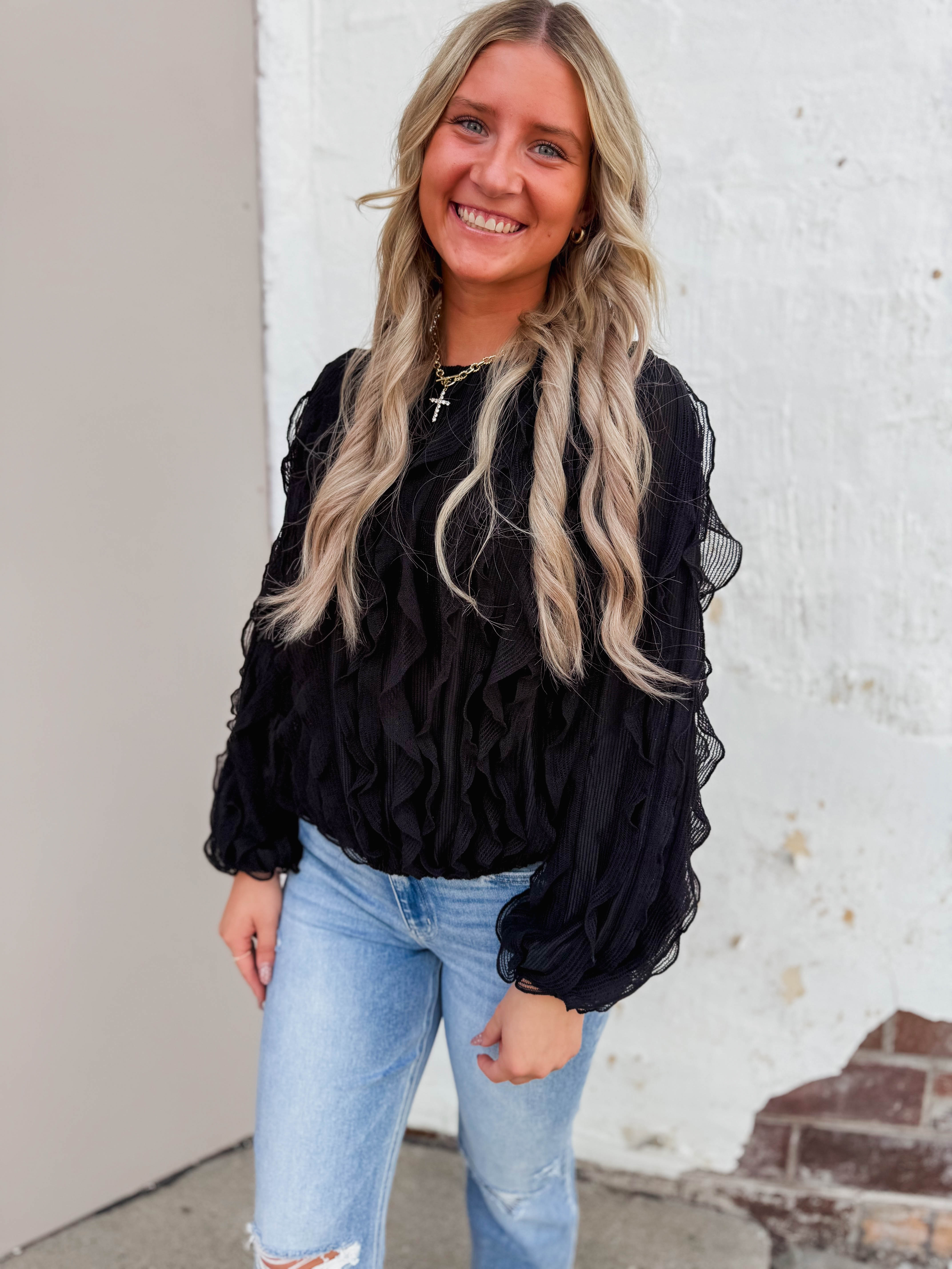 The Gianna Ruffle Top features a charming round neckline and long sleeves with playful ruffle texture. Its waist-length cut makes it perfect for dressing up or down—from work meetings to weekend fun. Add a flirty touch to your everyday style!