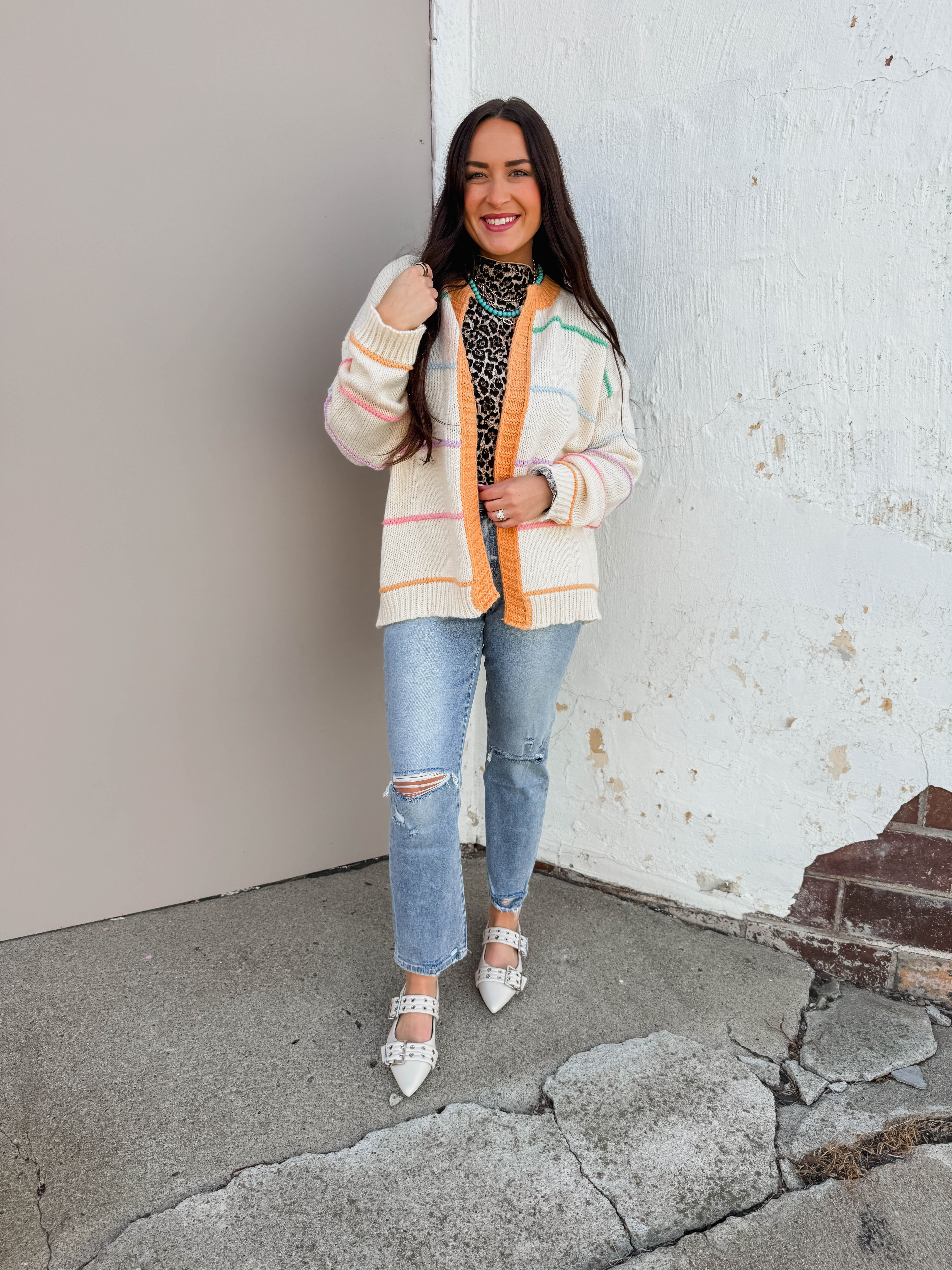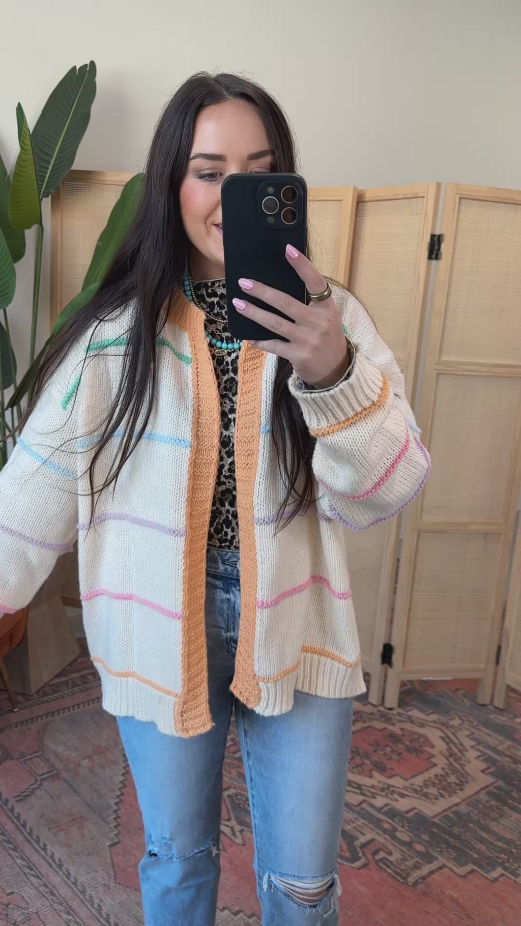 The Penelope Striped Cardigan brings fun and comfort together with its colorful stripes and relaxed fit. Perfect for layering from work to weekend, it features long sleeves and an easy open front. A cute, year-round essential that keeps your style playful and cozy.