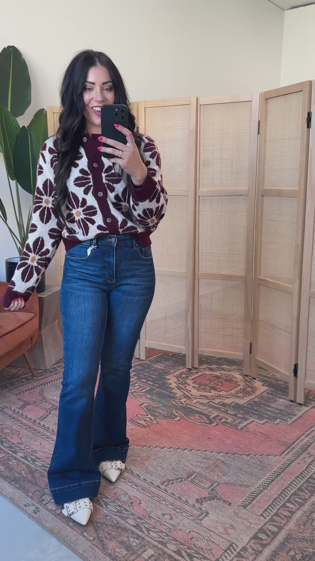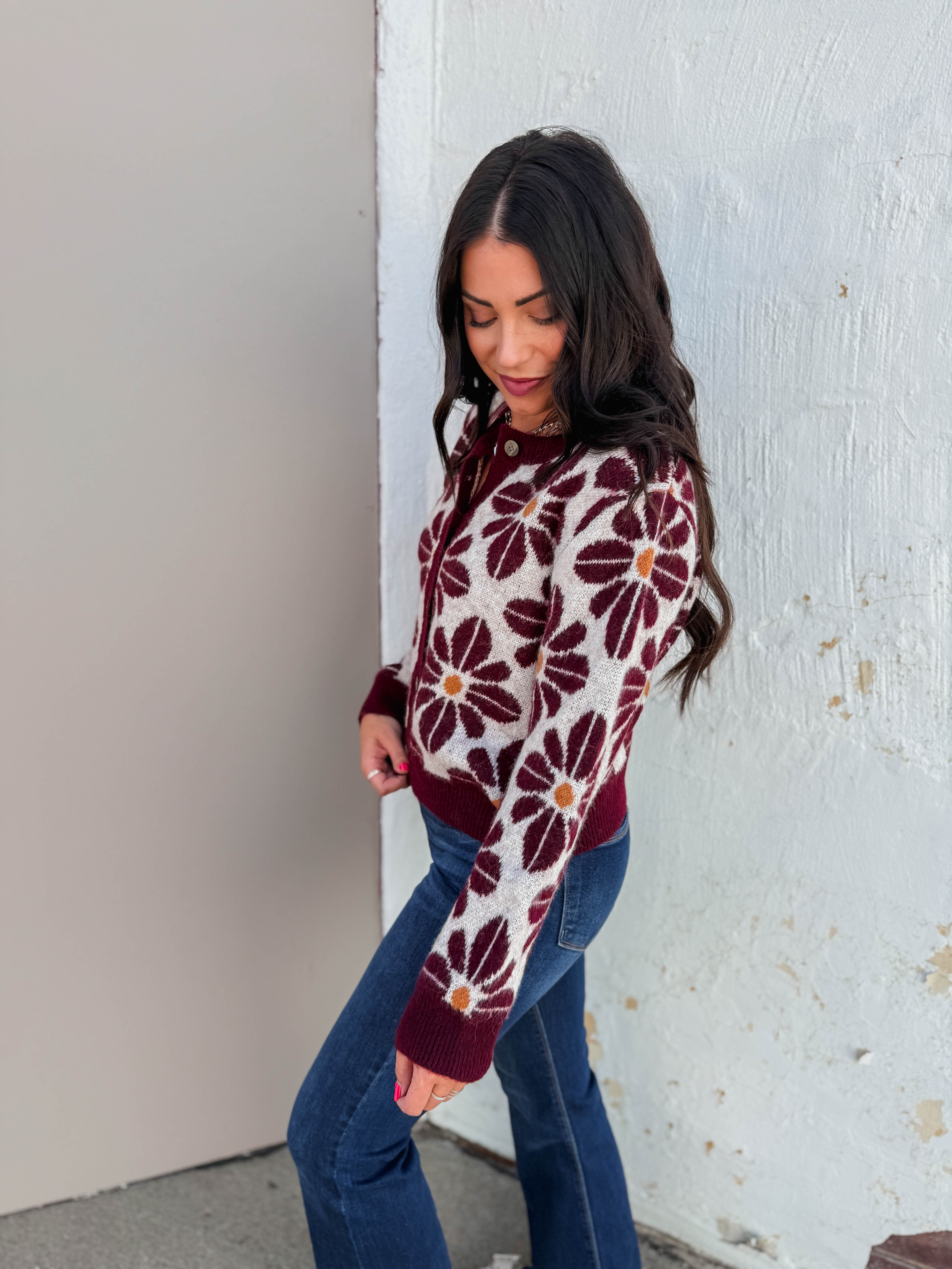Cozy up in the Willow Floral Cardigan - now available in Wine - featuring a charming crew neckline and playful floral pattern. With long sleeves, button front closure, and ribbed hems, it’s perfect for transitioning from work to weekend. Cute and comfy for fall days!