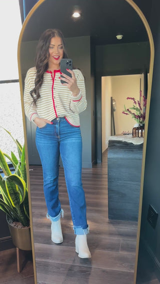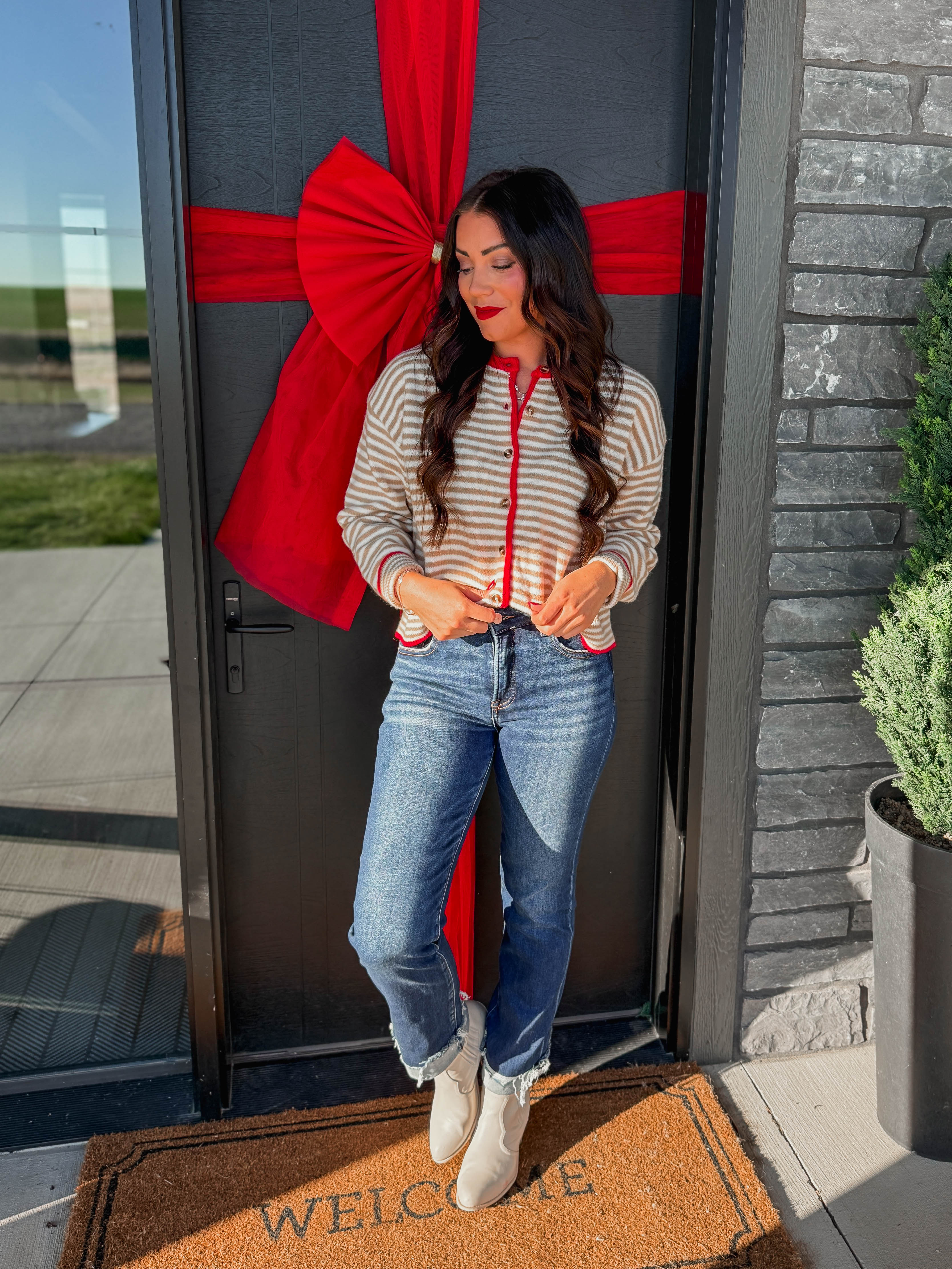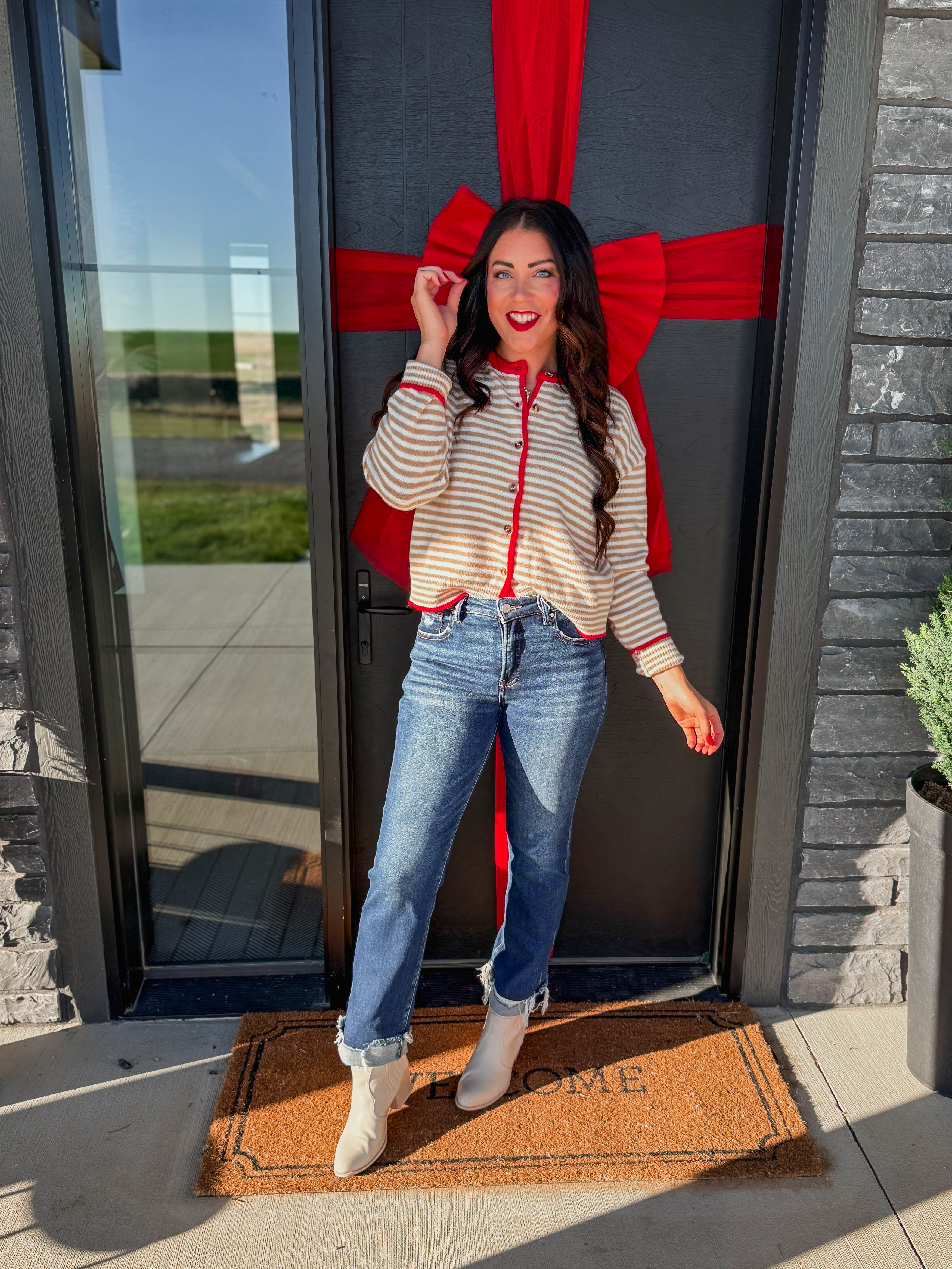 Layer up with the Nyla Striped Cardigan—a go-anywhere essential with timeless stripes and modern ease. Round neckline, relaxed drop shoulders, and long sleeves create that perfect slouchy vibe, while the button front and contrast trim keep things fun and fresh. Whether you're heading to the office or lounging at home, this soft, comfortable piece pairs with everything.
