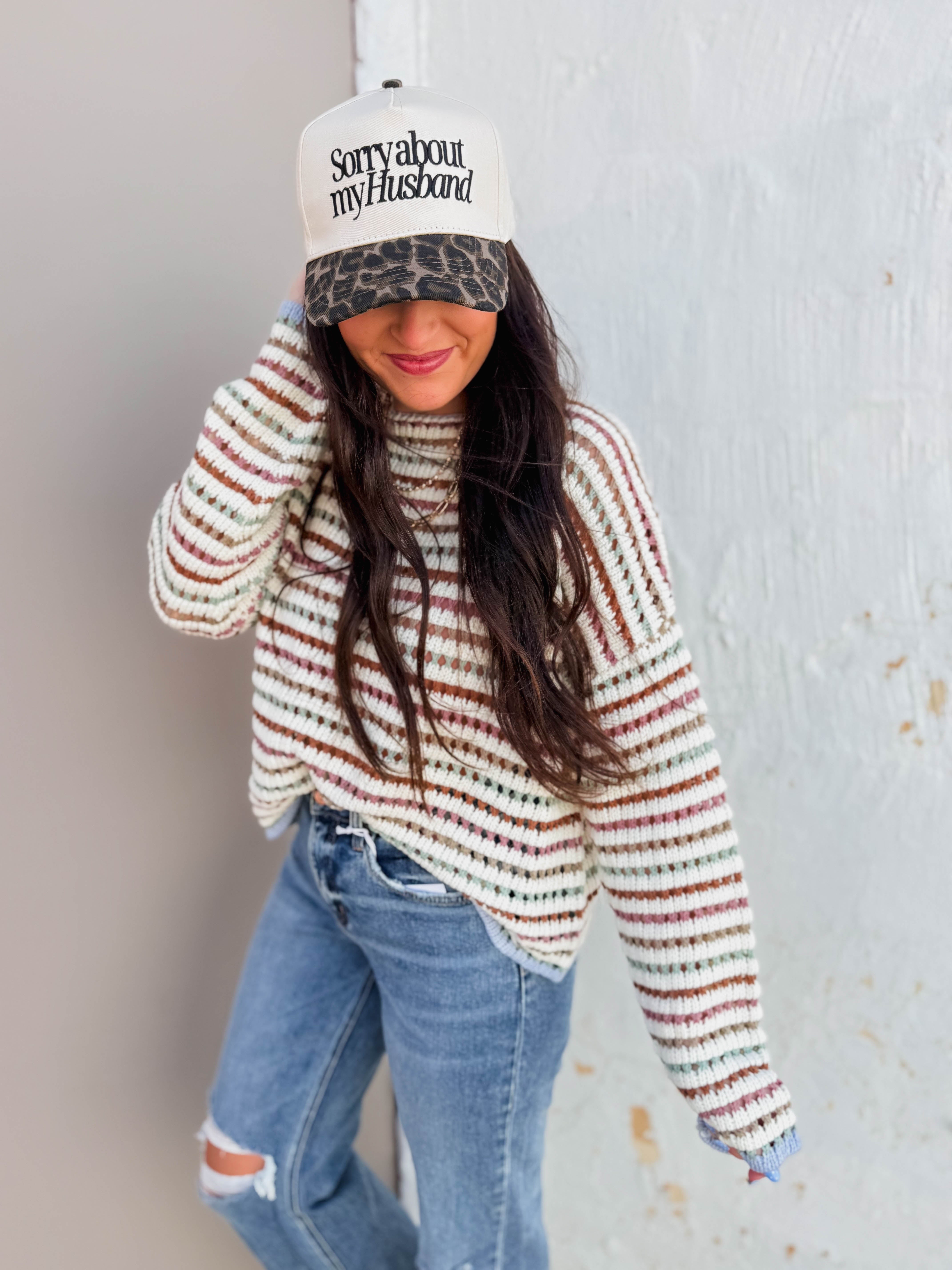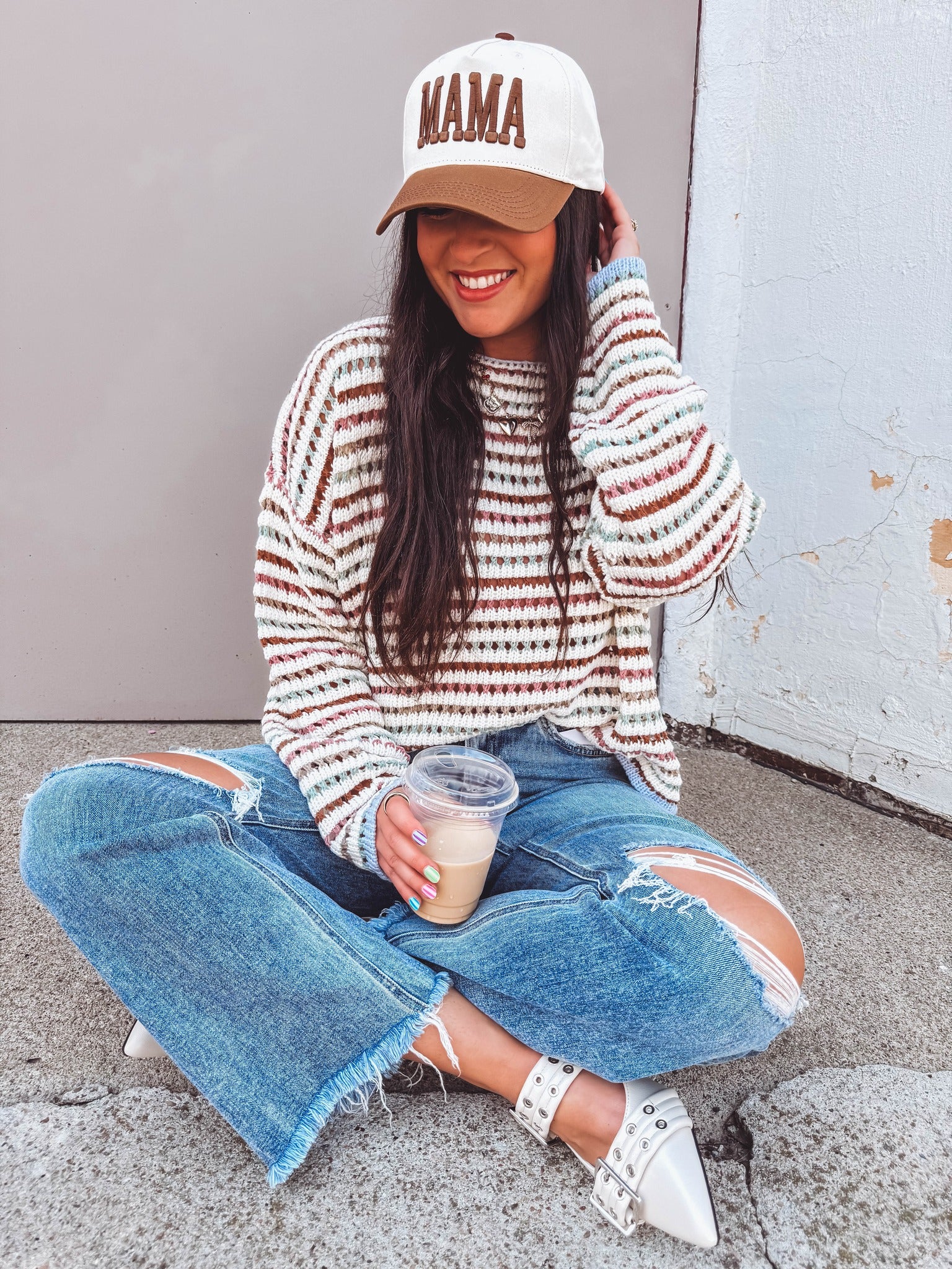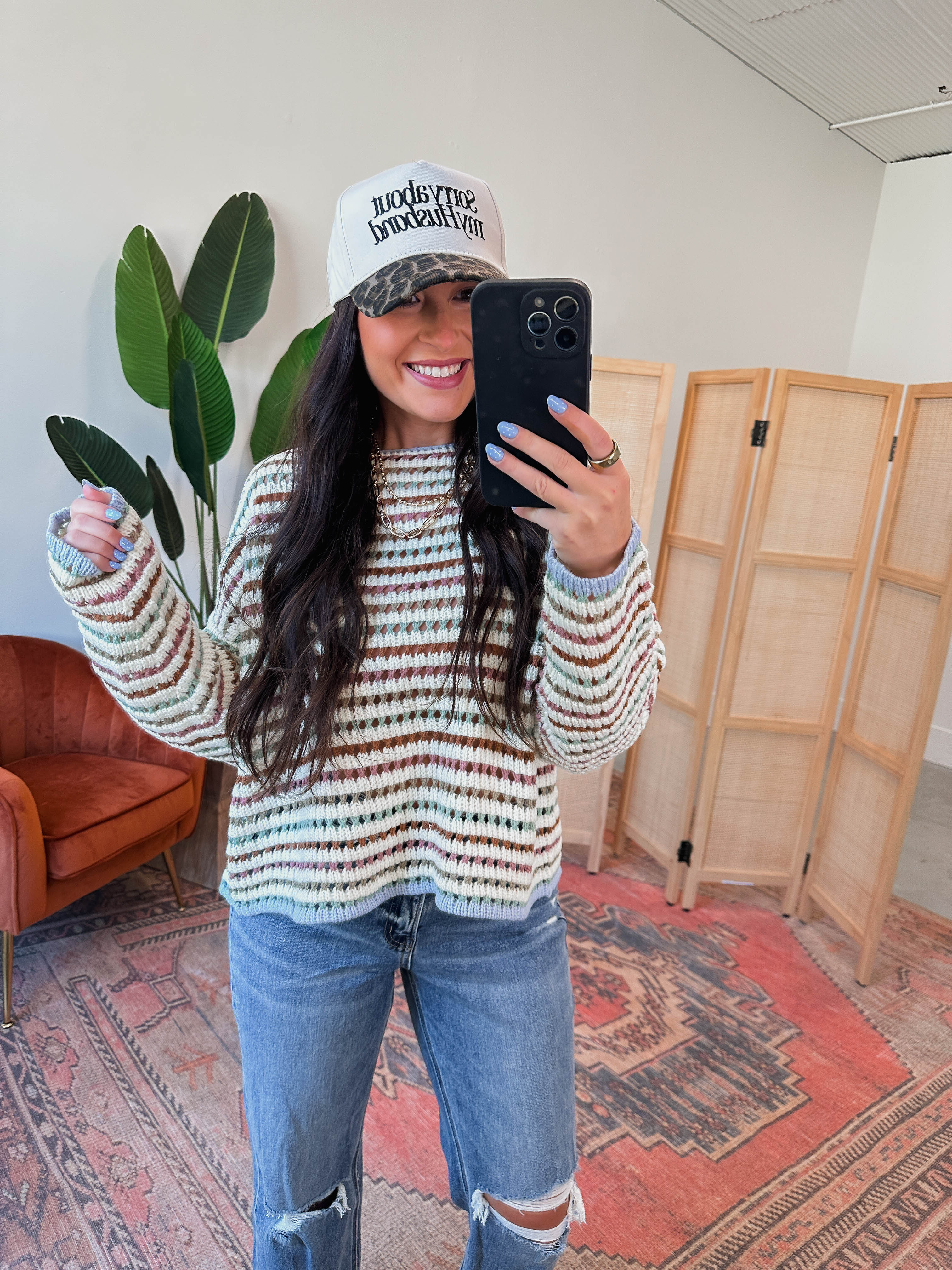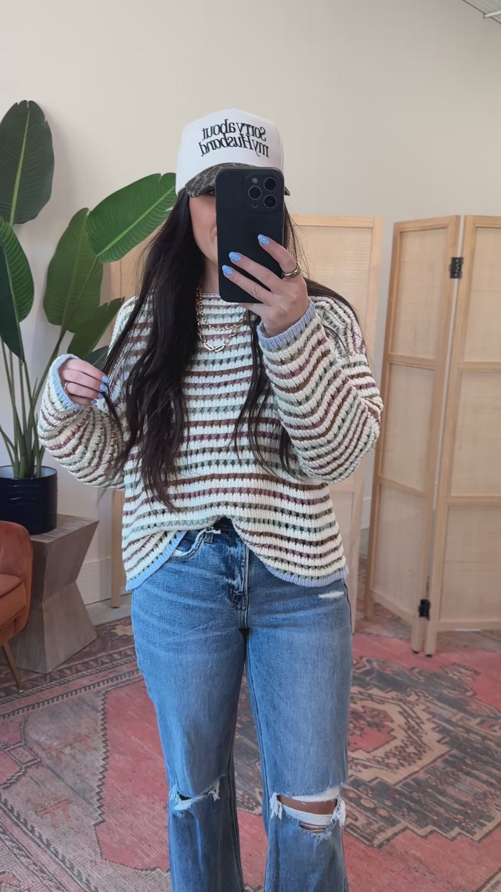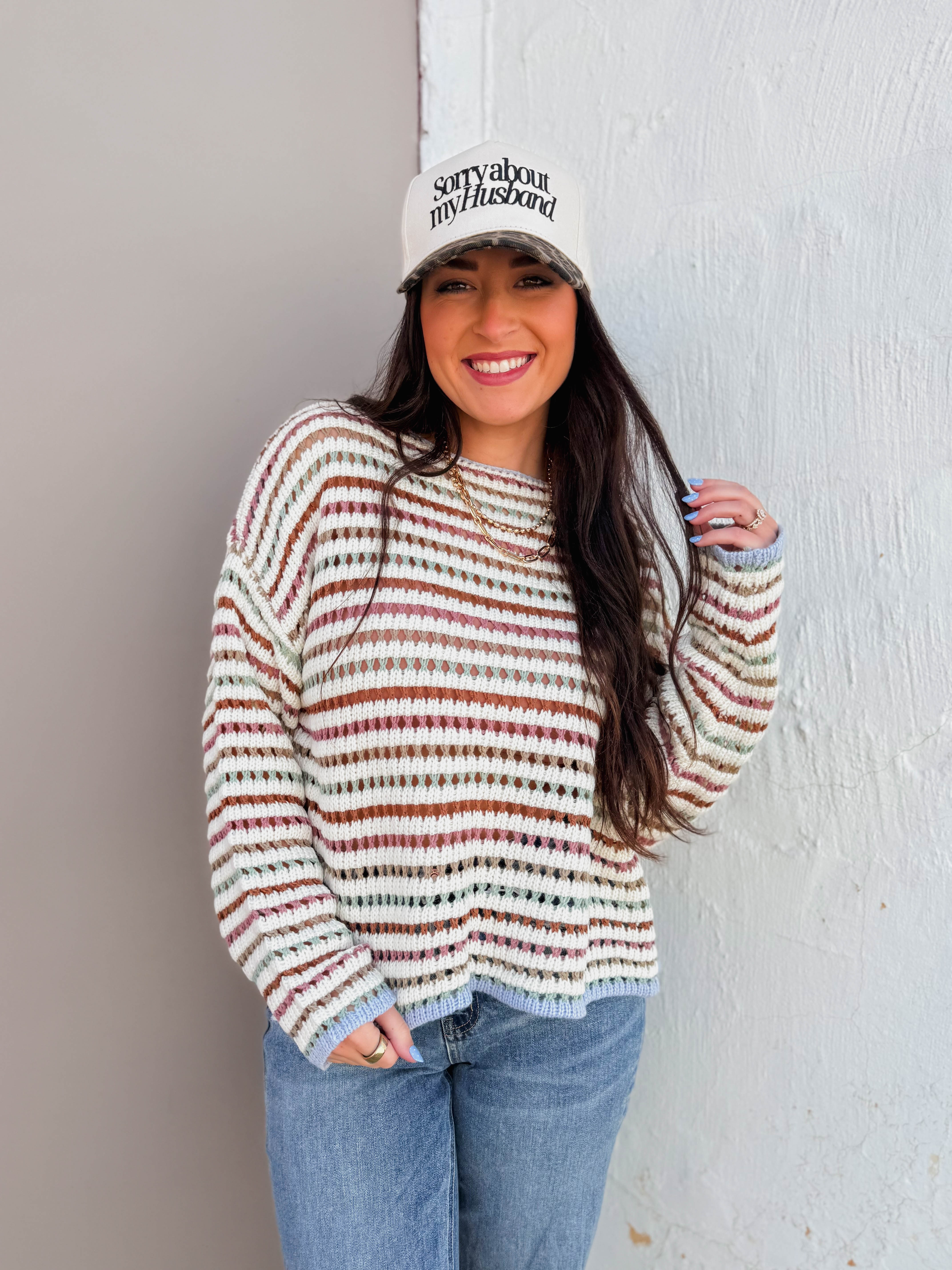 RESTOCK! This Vanessa Striped Sweater in Blue Mix features a wide crew neckline and cozy drop shoulders for a relaxed vibe. With long sleeves and playful multicolor stripes, it’s semi-sheer and perfect for layering. Dress it up or down from work to weekend with ease!