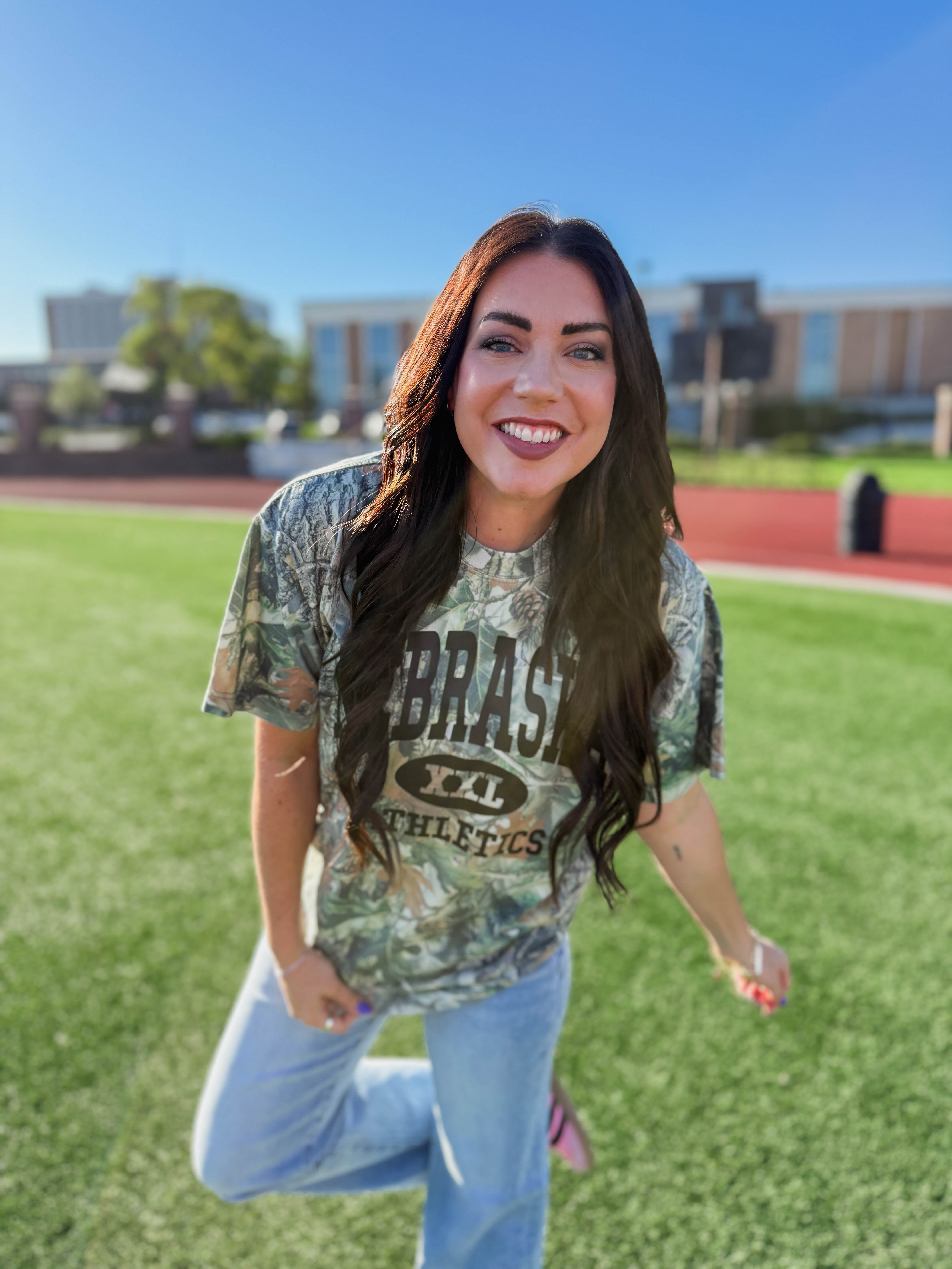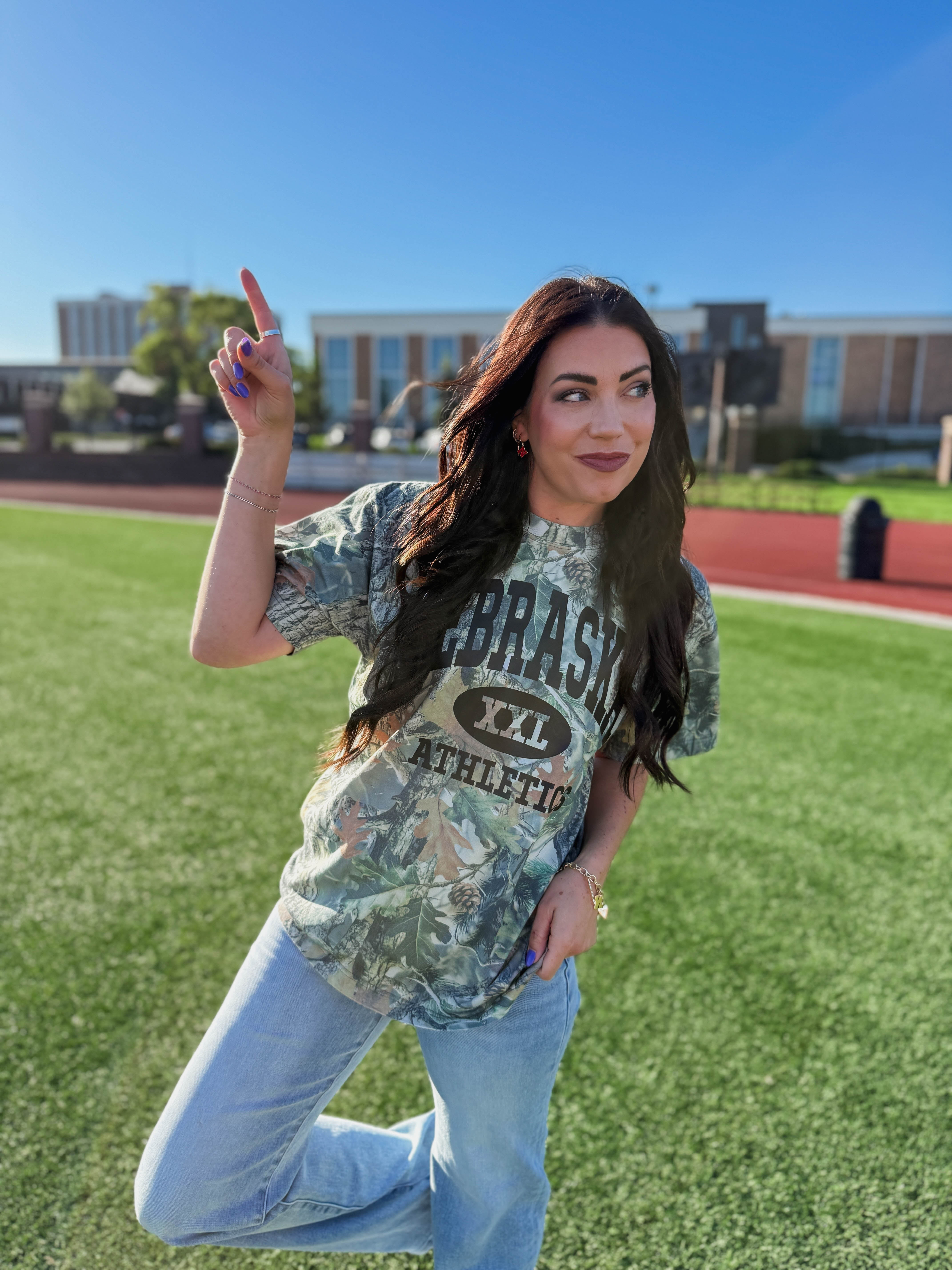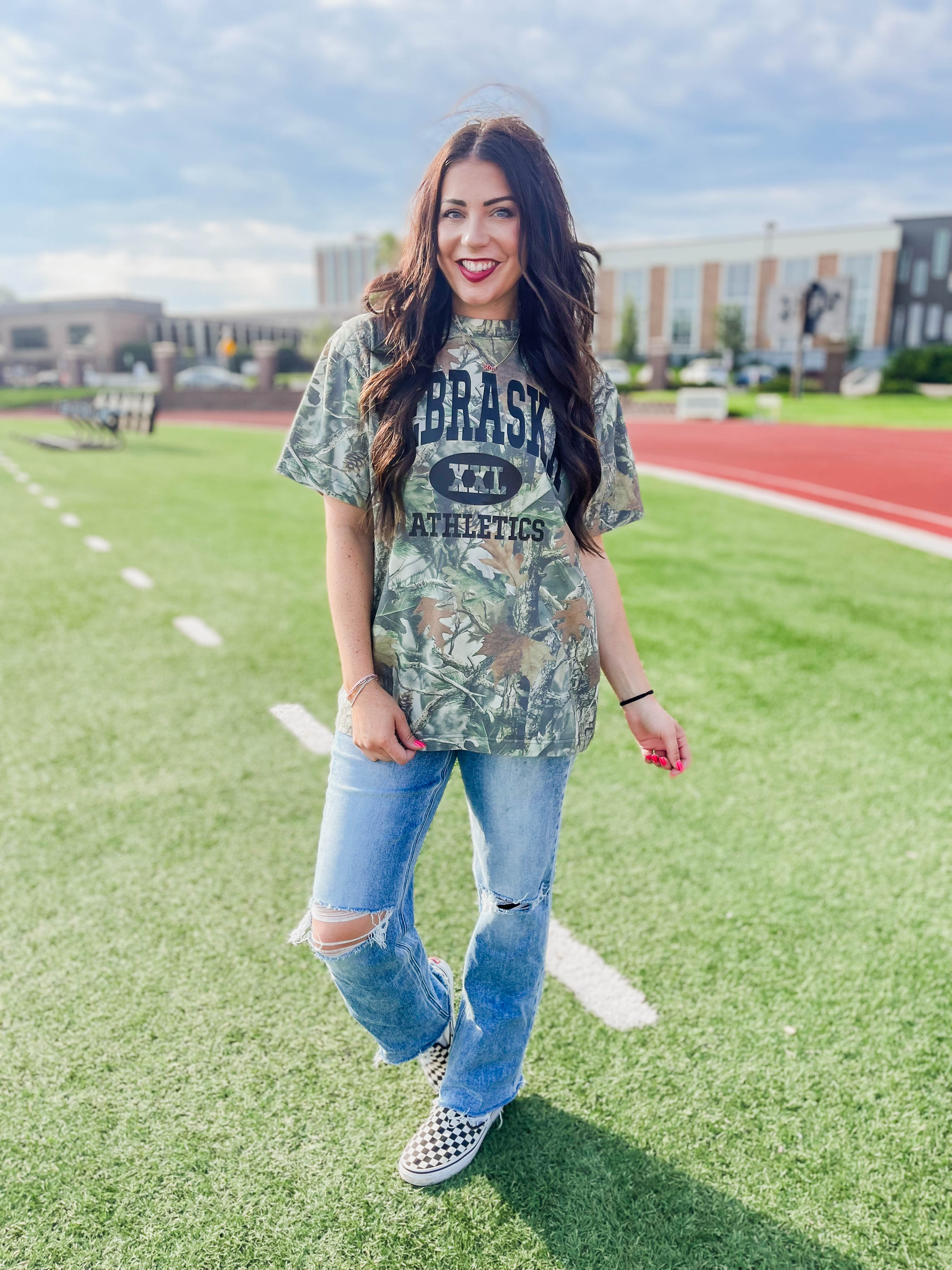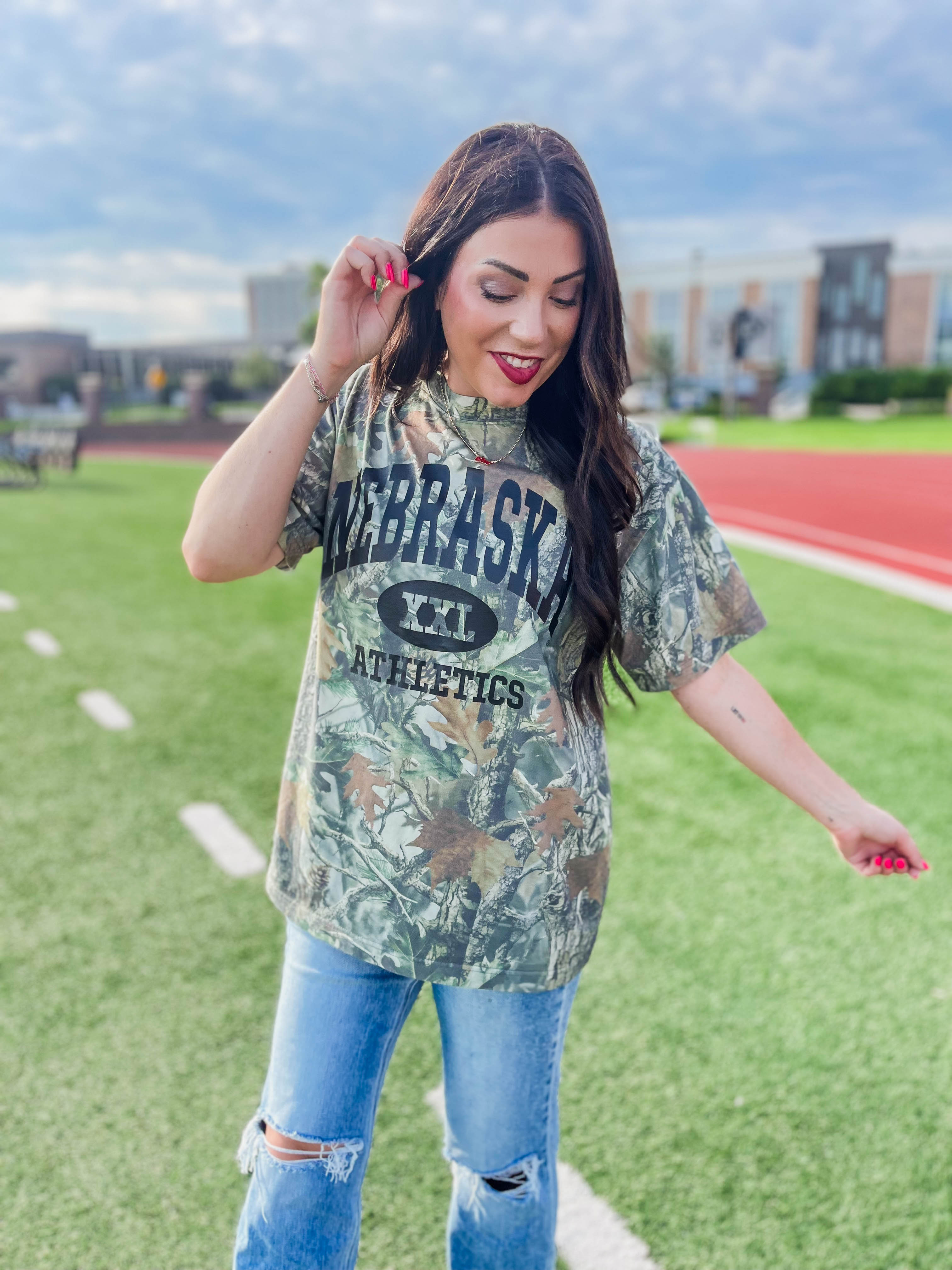 Show your Nebraska pride in this camo tee! Featuring a bold Nebraska Athletics graphic, crew neckline, and comfy oversized fit, it’s perfect for game days or just keeping it cute every day. Short sleeves keep it cool and casual all season long.